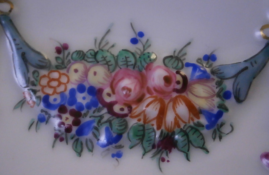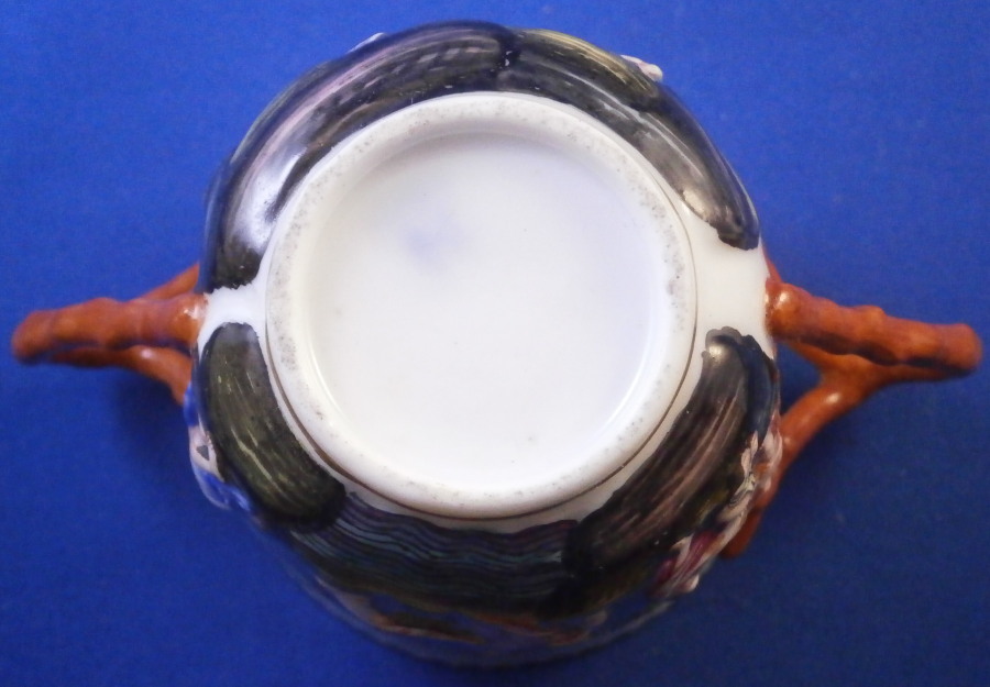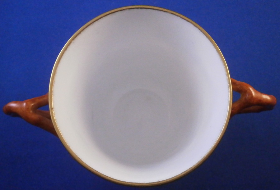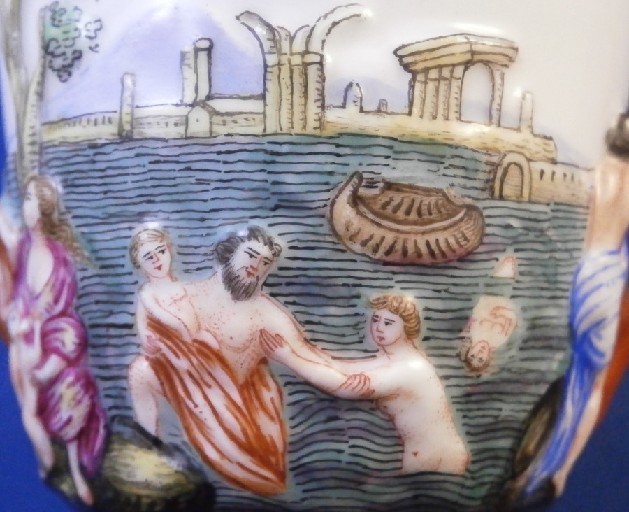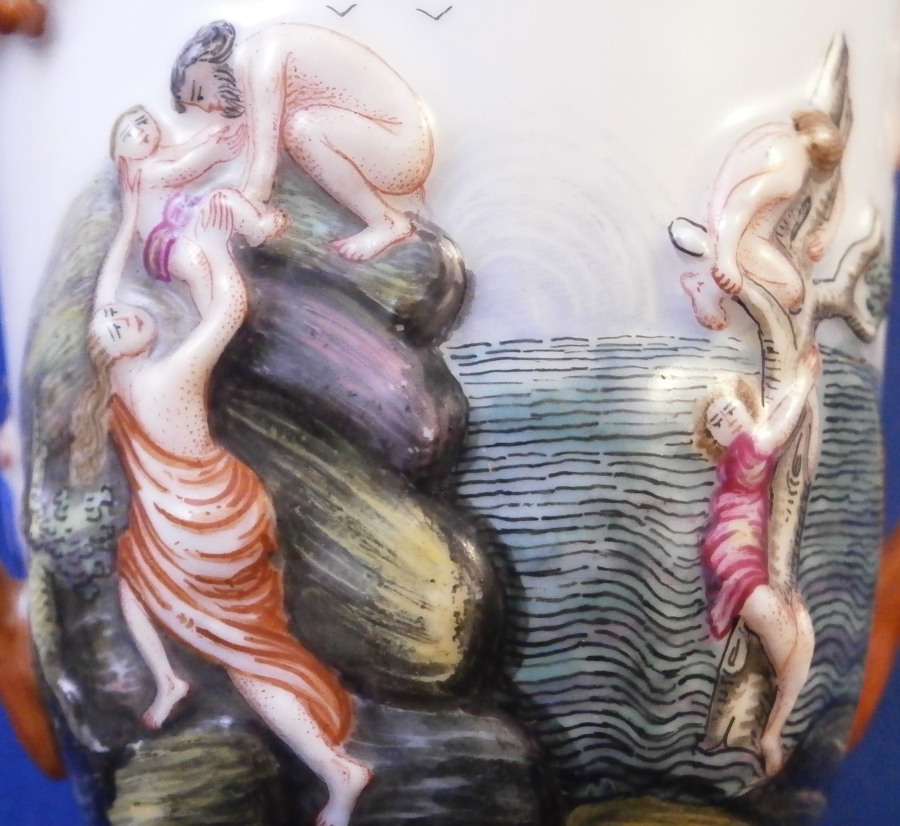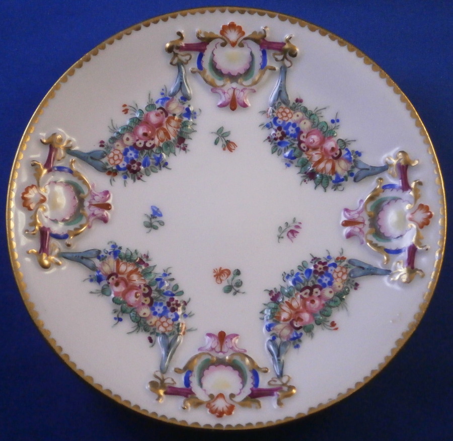 This is a nice double handled cup & saucer made by Doccia / Ginori in the mid 19th century. Probably a hot chocolate cup. The cup is decorated with biblical or mythological scenes in relief all around that are hand painted very nicely. It has a red coral branch handle to either side. The saucer has the usual really neat relief design with swags of relief flowers in between. The set is in great condition with some very minor wear to the gilding and a few tiny black firing spots from when it was made. Both pieces are faintly marked with the under glaze blue crown over the letter N as shown. The saucer is 1 inch tall and 5.75 inches in daimeter, the cup is 3 inches tall and just under 3 inches in diameterl. Please email me for more information or other pictures.