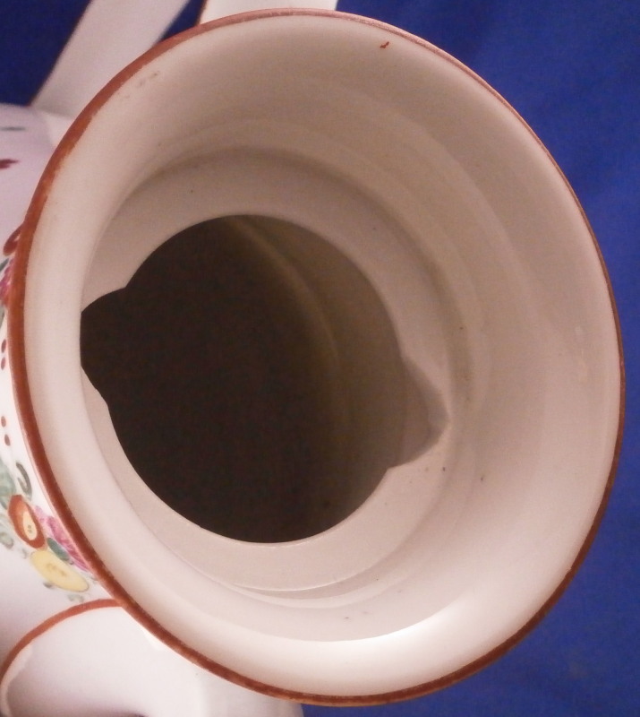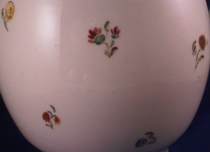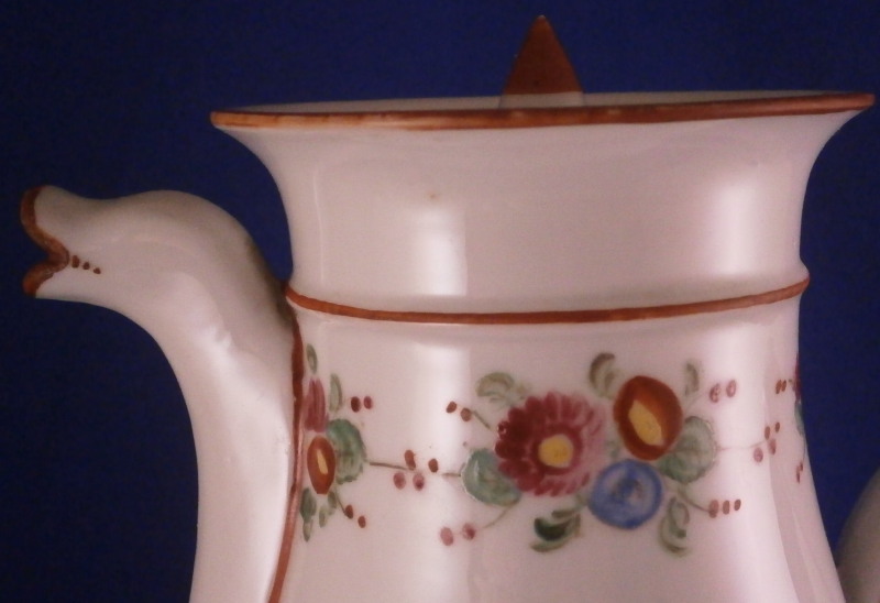 This is a nice coffee pot with its lid made by Doccia in the early 19th century. Looks more like a French Empire period piece but the flowers give it away easily. The pot has a nice shape to it with an iron red trim, small flower arrangements along the top part and lots of single flowers scattered about the entire piece. The lid has three tiny flowers to it as well as the same trim. Animal shape to the spout. It is simpler than their 18th century pieces but still very nice and quite hard to find! The pot is in superb condition with some very very minor wear to the trim and the tiniest of flakes to the lid edge. It is not marked at all but the paste and flowers are typical of this maker. The coffee pot and lid are quite large being about 11 inches tall, 7 inches from spout to handle and 6 inches in diameter. Please email me for more information or other pictures.