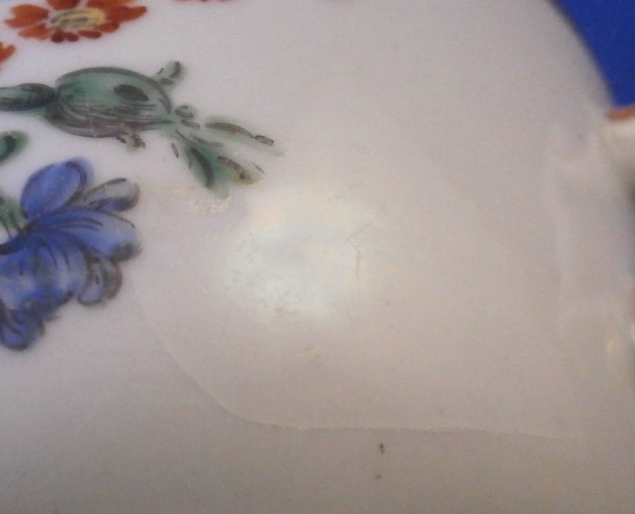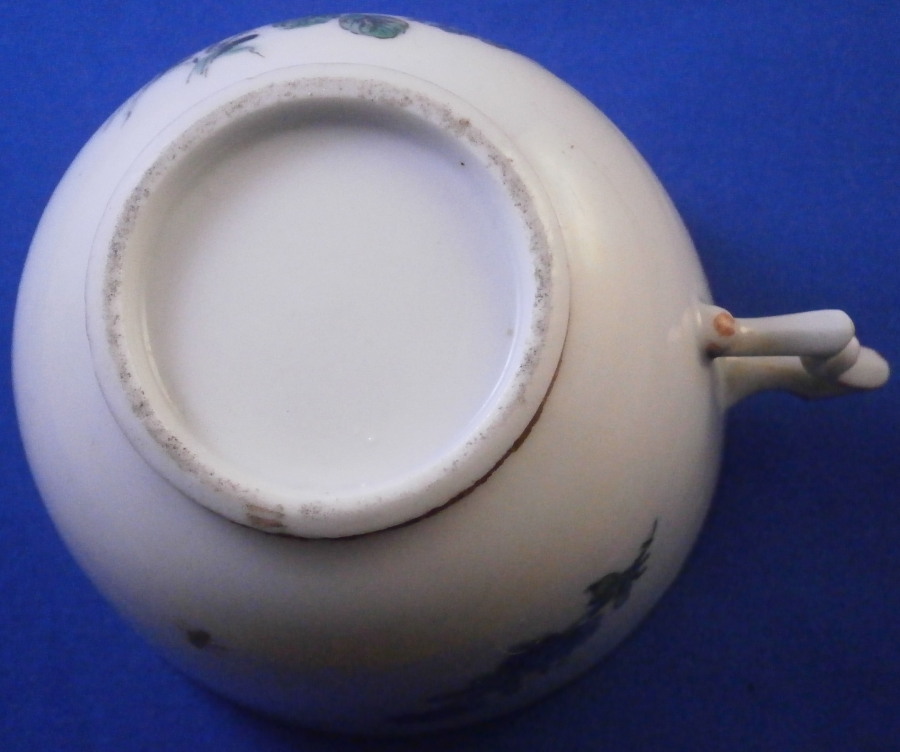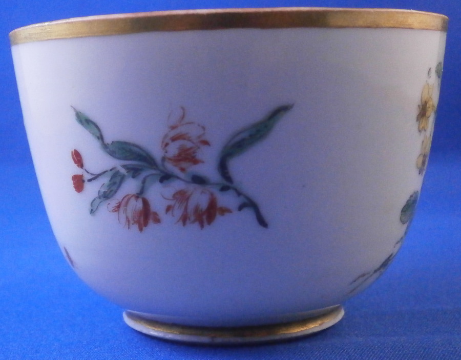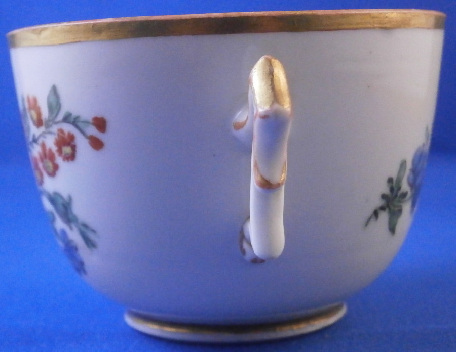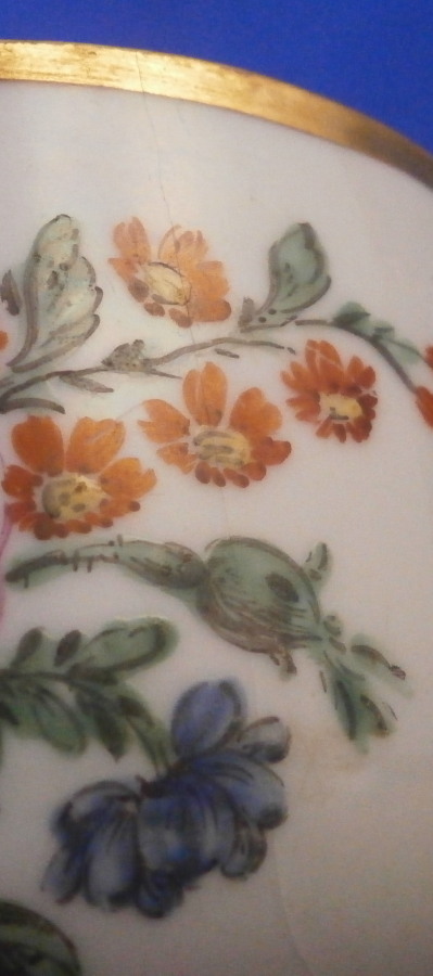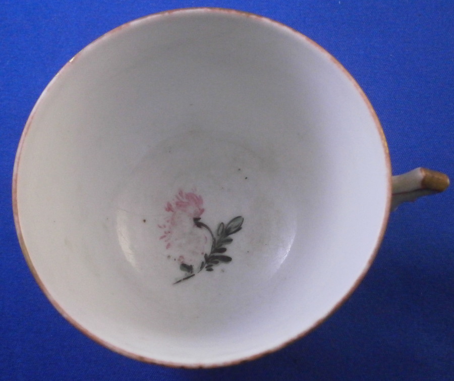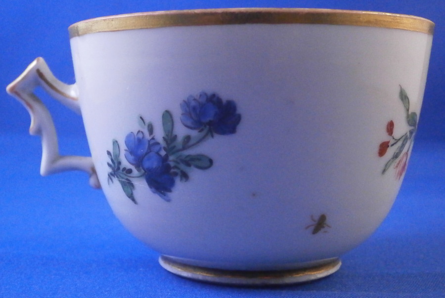 This is a nice tea cup made by Doccia in the 18th century. It is hand painted with a large floral arrangement to the front as well as two smaller singel flwers to the side and back and a little gold bug as well. Gold trim to the top and bottom as well as the handle which has the typical shape and is quite decorative. The cup is in decent condition with some wear to the gilding which shows the red color they painted early on under the gold and a large J shaped hairline to the side that is not obvious when on display. Wear to the flower on the inside. It is not marked underneath which is the norm! The cup is 2 inches tall and just under 3 inches in diameter. A nice example and would make a great learning tool that is a must have for this maker. Please email me for more information or other pictures.