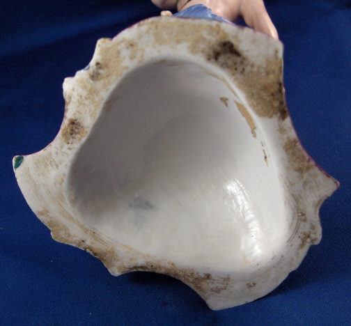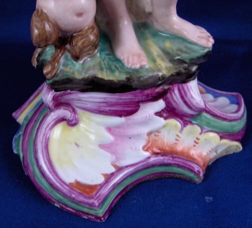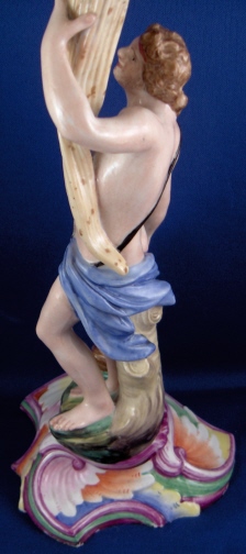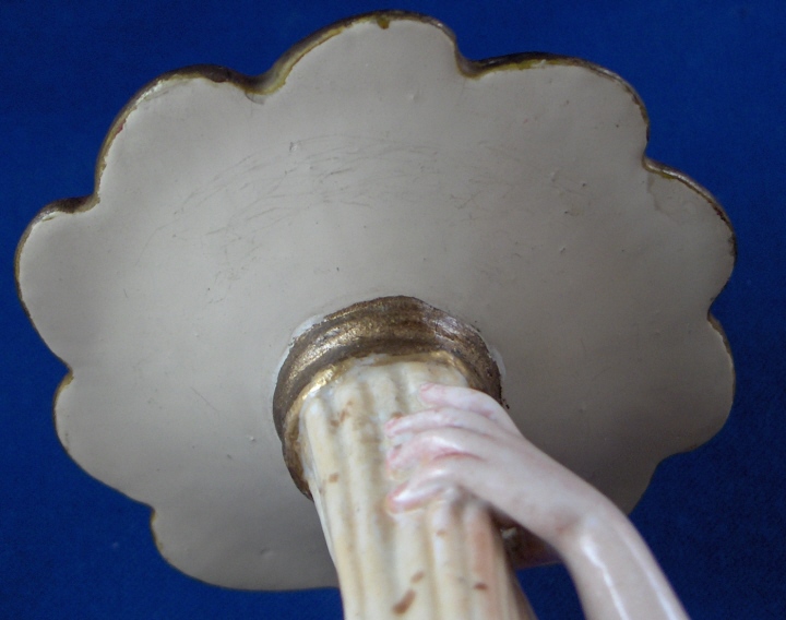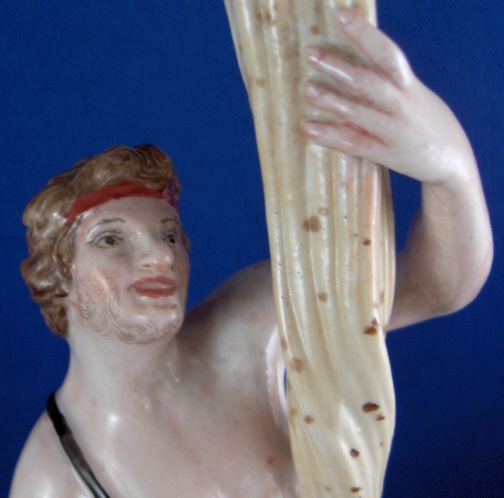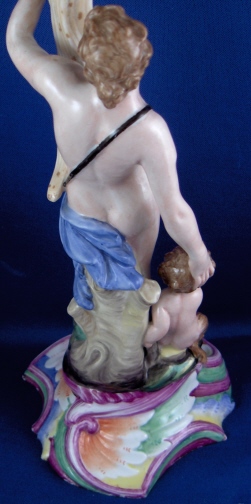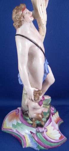 This is a second superb figural candlestick made by Doccia in about 1765. It is called autumn and there would have been four of these making up the four seasons. I happen to have a second one of this model so you could make that a neat pair :) The piece is modeled as a male figure holding up a horn of plenty looking item in his left hand which has the candleholder on top of it. He has a little faun by his right side which is holding grapes in his right hand. The base is nicely shaped with some really bright colors on it typical of Doccia. The piece displays superbly but the entire caneleholder top part and drip tray is either totally restored and heavily overpainted or a replacement. Not sure which one. Otherwise it is in great shape with a few tiny chips to the bottom edge which don't bother me and are hard to see. The piece is marked underneath with the underglaze blue N under a crown mark be it very faint and hard to see. The piece is 11.125 inches tall, 4.25 inches wide and 4.25 inches deep. Please email me for more information or other pictures.