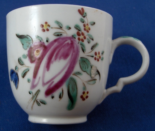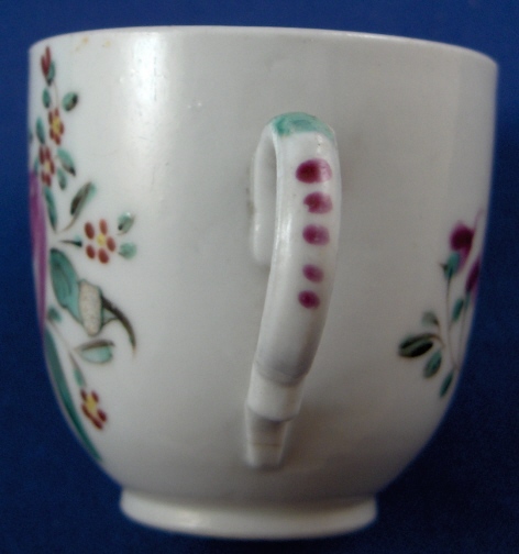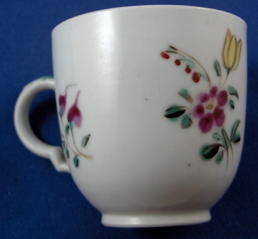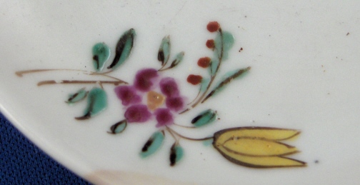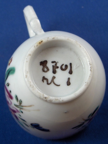 This is a second unusual cup & saucer set made by Doccia in the 18th century. I have never seen a demitasse set by them so the two I recently bought were a must have. This one is handpainted with a large floral arrangement on the front of the cup with a smaller one on the side and a flower on the back. The saucer has the same type of detail to it. They are very well done in the typical Italian style with the typical handle shape to the cup. Both pieces are in great condition with manufacturing flaw on the cup outside wall that sticks out a bit and is not glazed and a hairline to the edge of the saucer with an area around it that is stained brown. The cup is marked as shown - not sure what it means but it is something you see on Doccia porcelain from time to time! The cup is 1.875 inches tall and 2 inches in diameter. The saucer is 0.625 inch tall and 4 inches in diameter. Please email me for more information or other pictures.