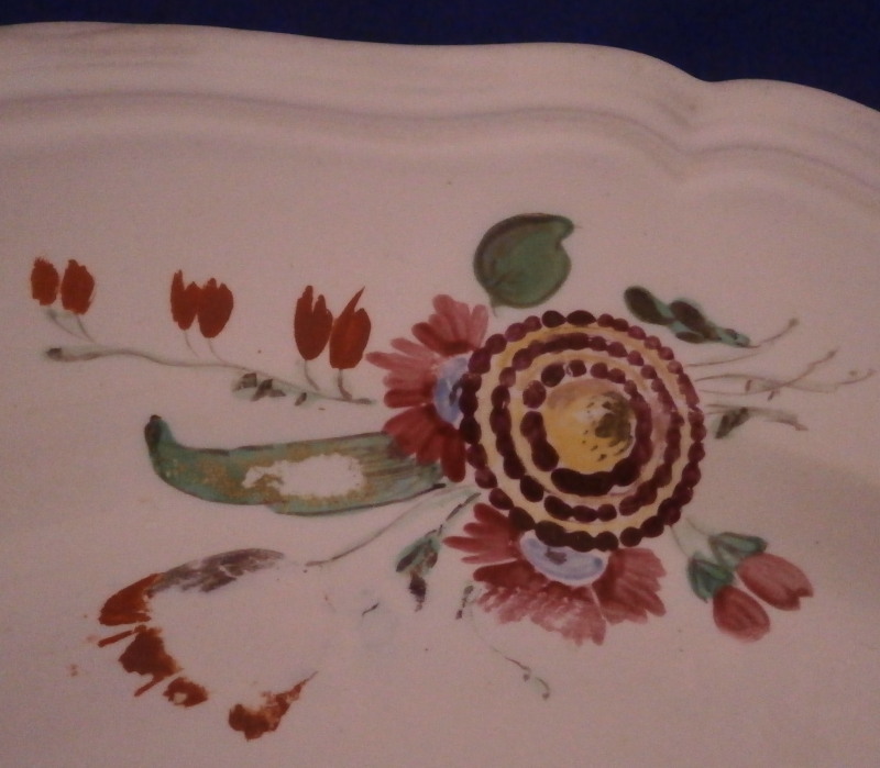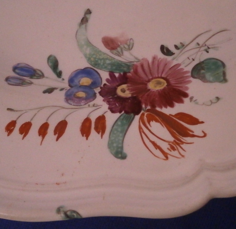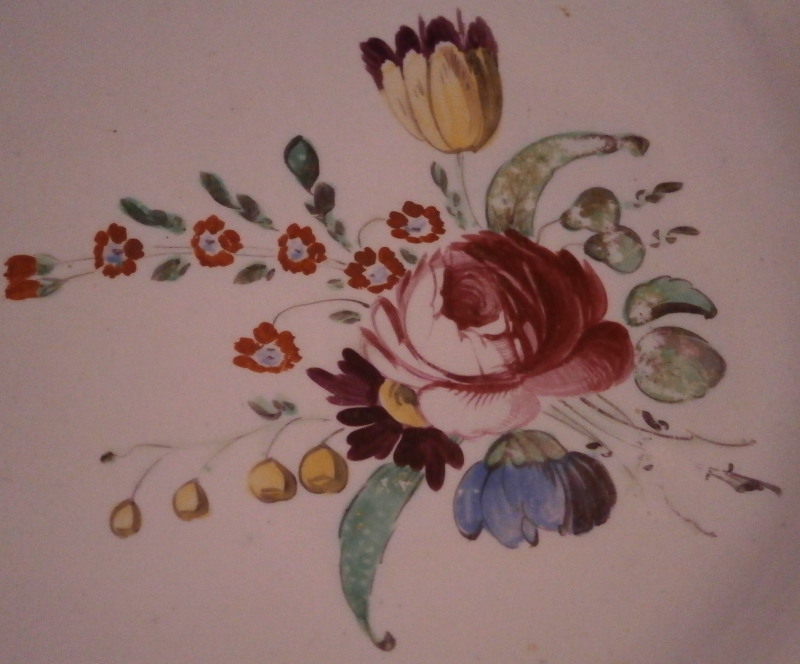 This is a plate made by Doccia / Ginori in about 1770. It is hand painted with three nice sized floral arrangements as well as some smaller single flowers. Nicely done in their typical style of the period and the plate has a relief design along the nicely shaped edge which makes it quite elegant. The plate is made with a tin glaze to cover the not so white porcelain paste of the time. This was used around 1770. The plate is in good condition with wear to the flowers from stacking and a thin small chip to the underside edge. A glazed over chip to the foot ring from when it was made as shown. Still a very nice example and a must have to learn more about this amazing maker! It is unmarked but that is normal during this period. The piece is 1.125 inches tall and 9.25 inches in diameter. Please email me for more information or other pictures.