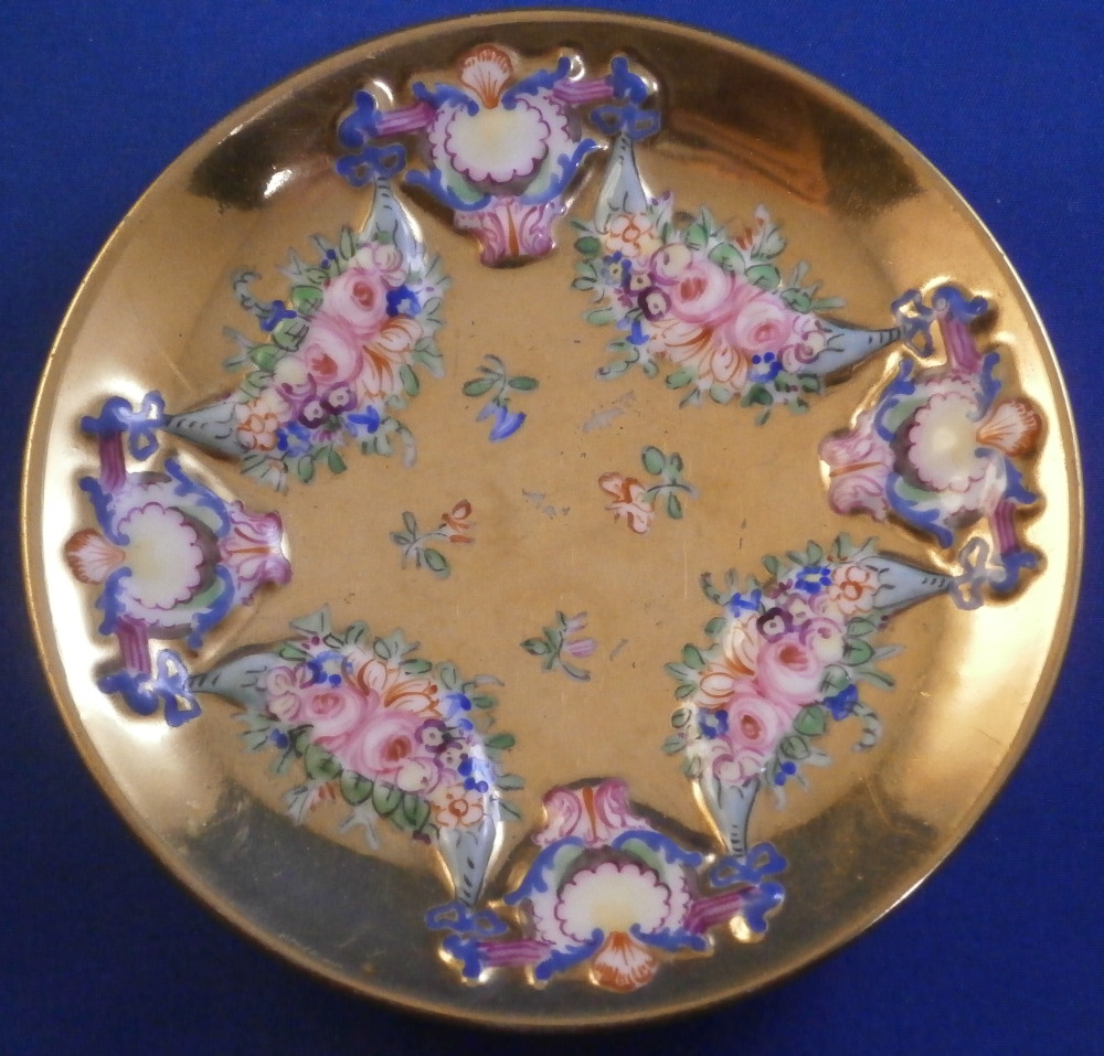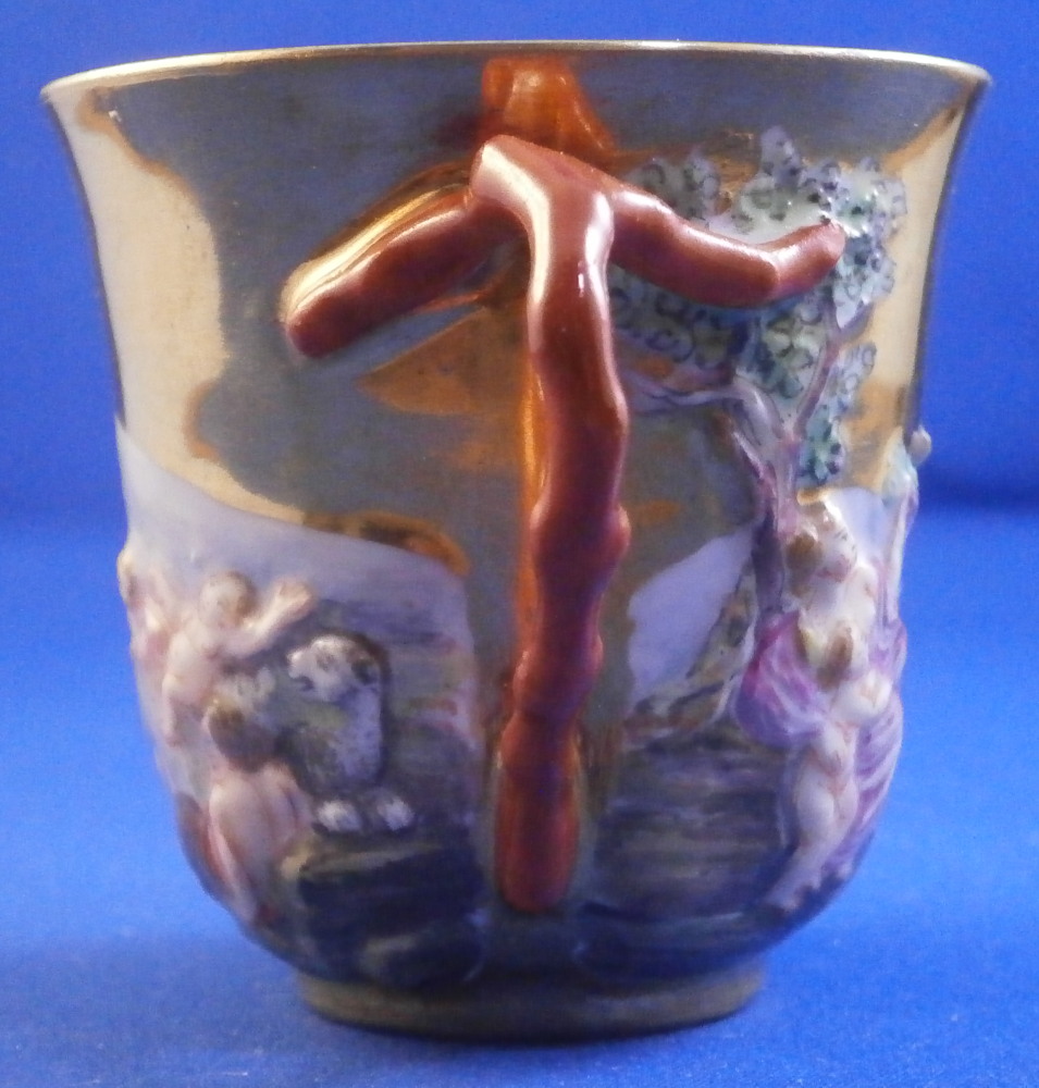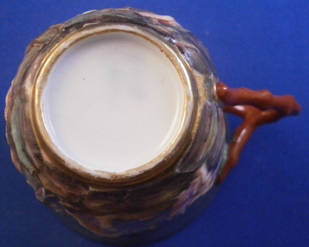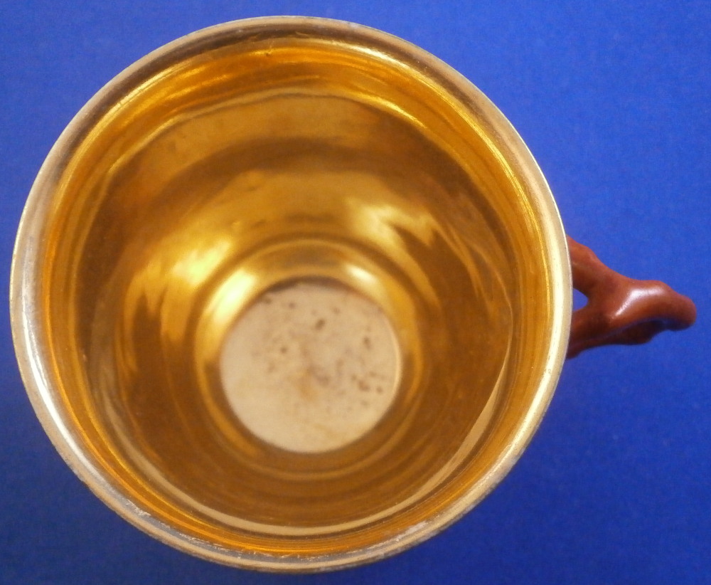 This is a great cup and sacuer set made by Doccia / Richard Ginori in the second half of the 19th century. One rarely sees these fully gilded sets! The cup has the typical raised relief decoration of mythical / biblical theme on it that is hand painted as well as the typical red corral handle. The saucer has the floral garlands held up by scroll designs typical for this mark but what is unusual is that the areas that would normally be white are in this case completely gilded which looks quite elegant. The set is in superb condition with just a touch of wear to the gilding which is to be expected. The cup and saucer are both marked underneath with an under glaze blue N under a crown - quite faint but they are there. The cup is 2.25 inches tall and about 2.375 inches in diameter. The saucer is 0.75 inches tall and 4.5 inches in diameter. Please email me for more information or other pictures.
