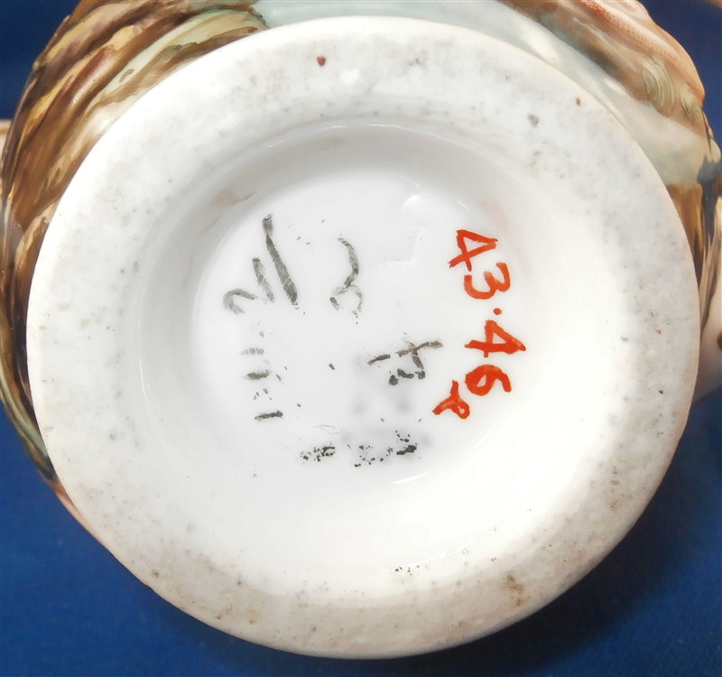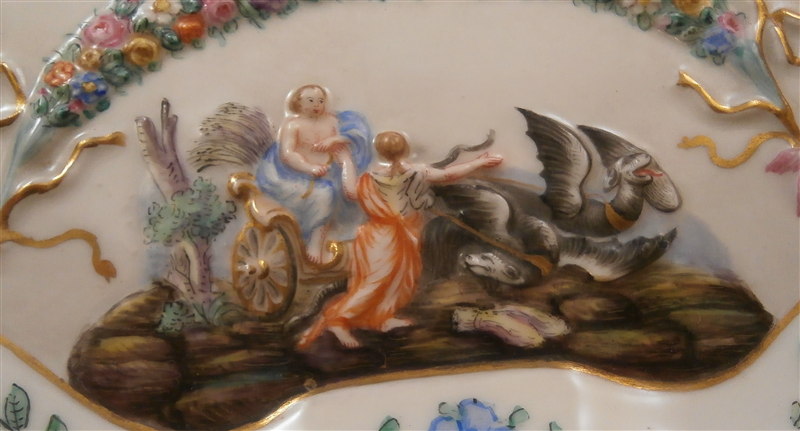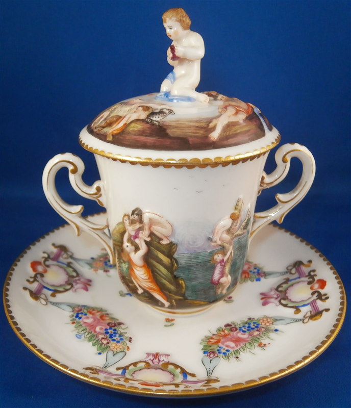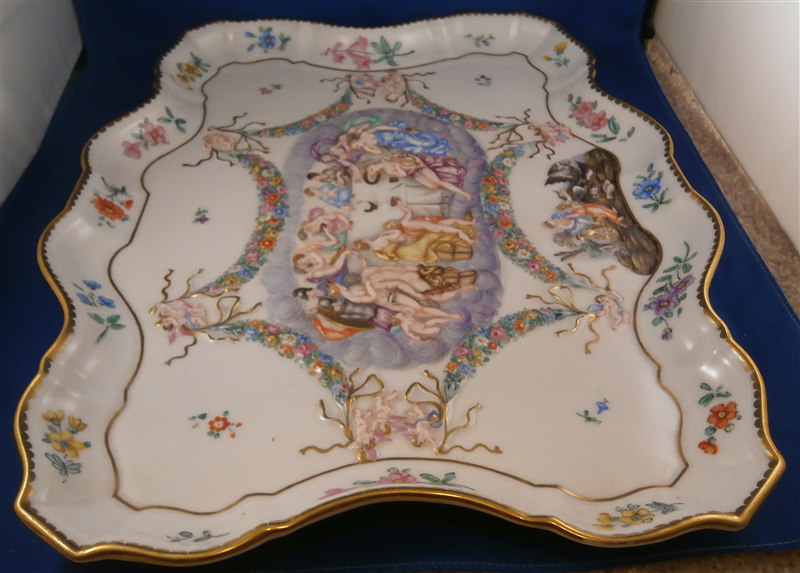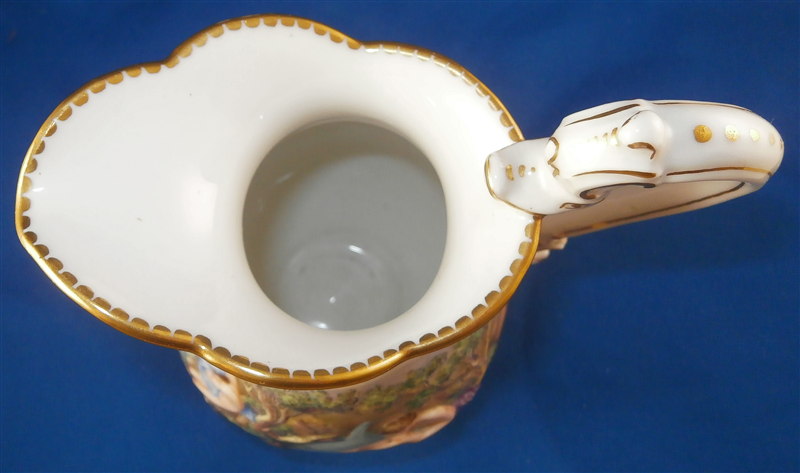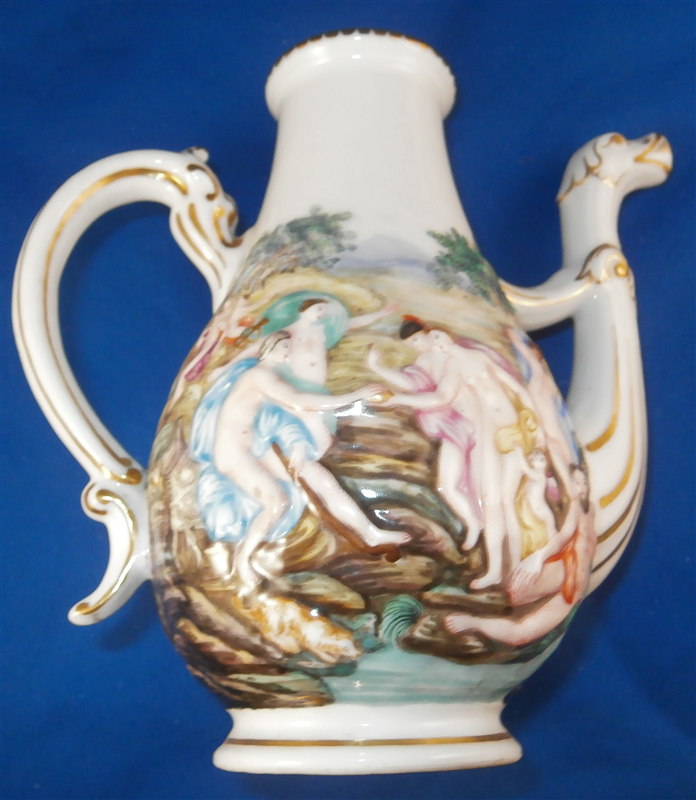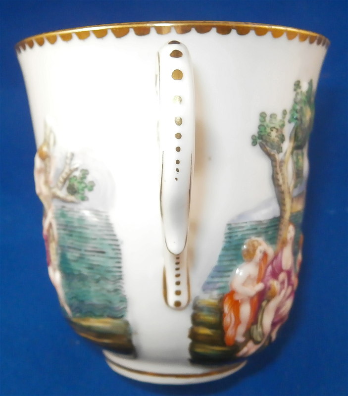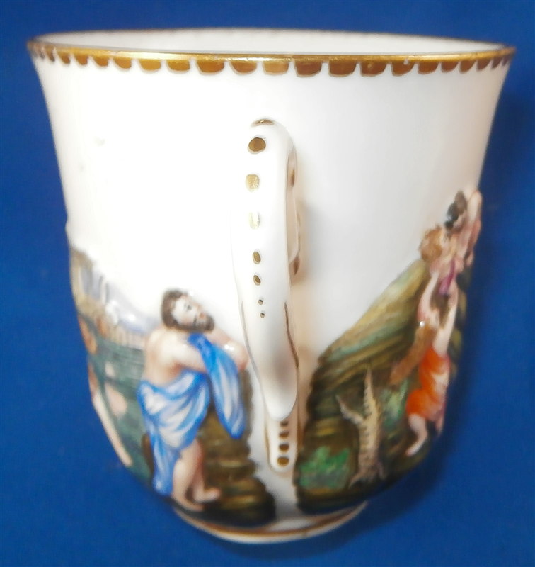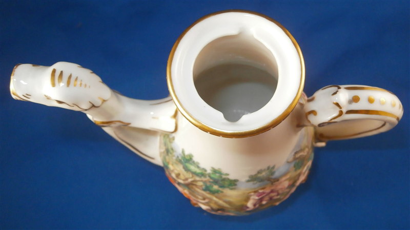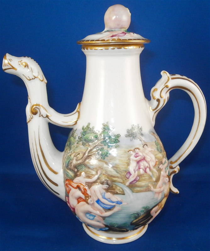 This is a superb service for one or solitaire made by Richard Ginori / Doccia in the 19th. I think it is for hot chocolate but could be for coffee as well and I suspect it used to be a set for two. A complete set including the tray is rather hard to find if not near impossible so it was a must have :) All pieces have the typical raised relief decoration of mythical / biblical themes on them that are handpainted and they have nicely shaped handles highlighted with gilding. Nice to have the lid for the cup which has a figural finial! The lid of the chocolate pot and sugar pot have a fruit finial on them. The set is in superb condition with a glaze star line under the saucer and on the inside of the bottom of the cup but neither goes through the porcelain to the other side! The lid rim has some very minor shallow chips to the underside. All pieces are marked underneath with a blue N under a crown except for the tray and some pieces have an incised mark as well. They all have an old museum ID underneath. The cup is just under 3 inches tall and about 2.875 inches in diameter. The lid is 3.125 inches in diameter and about 1.75 inches tall. The saucer is 1 inch tall and 5.75 inches in diameter. The creamer is 5.125 inches tall (plus the handle), 3.5 inches wide and 5.125 inches from handle tp spout. The sugar dish with its lid is 4 inches tall, 4.75 inches wide and 3.875 inches deep. The teapot is 6.75 inches tall, 3.5 inches wide and 6 inches from handle to spout and the tray is 1 inch tall, 15.5 inches wide and 12.375 inches deep. Please email me for more information or other pictures.