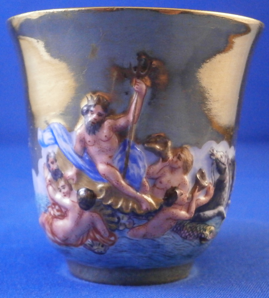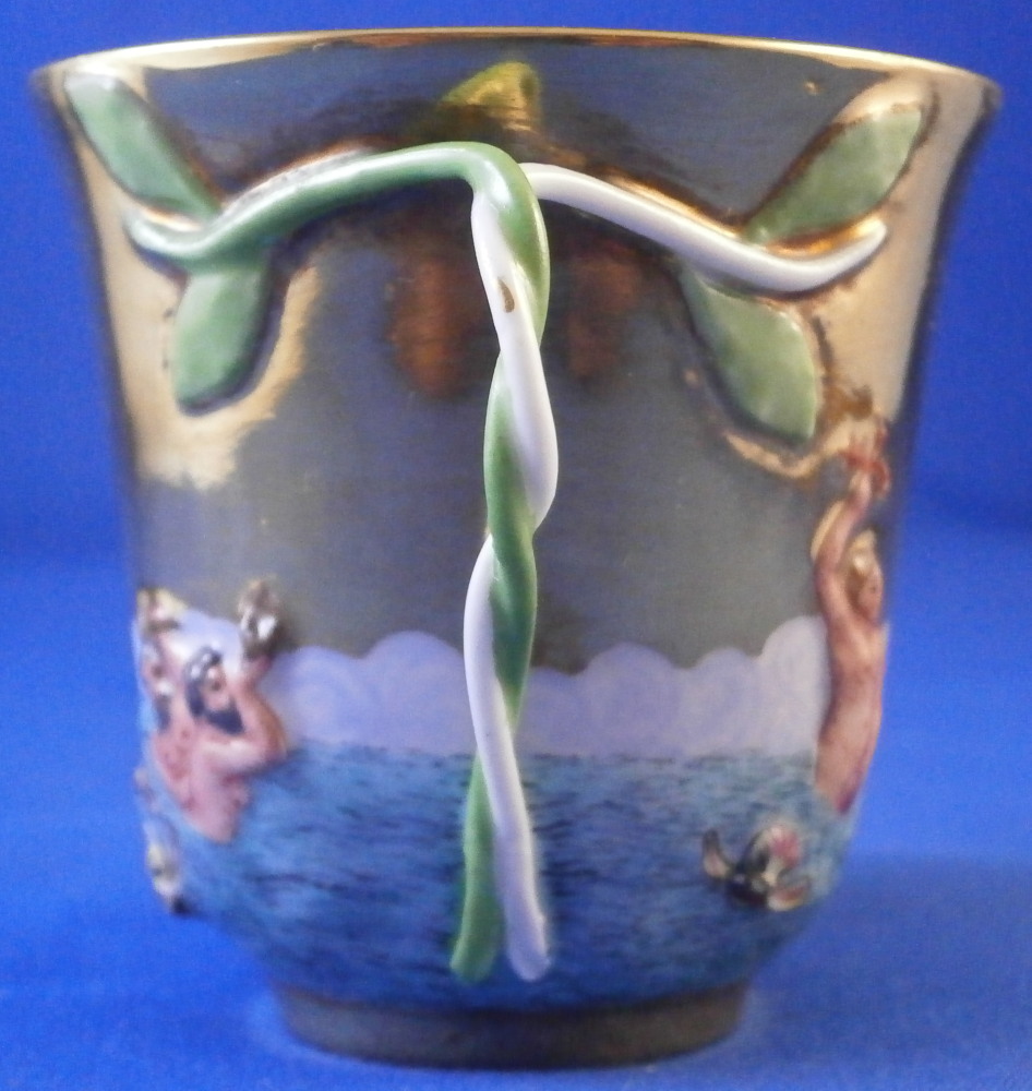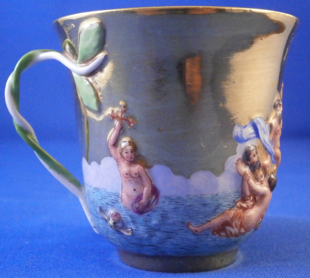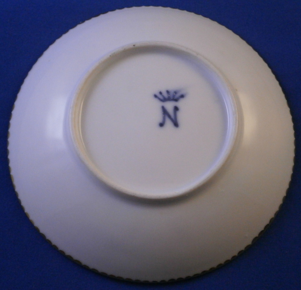 This is a great demitasse cup and sacuer set made by Doccia / Richard Ginori in the second half of the 19th century. One rarely sees these fully gilded sets! The cup has the typical raised relief decoration of mythical / biblical theme on it that is hand painted as well as the harder to find very delicate intertwined branch handle. The saucer has the floral garlands held up by scroll designs typical for this maker but what is unusual is that the areas that would normally be white are in this case completely gilded which looks quite elegant. The set is in superb condition with just a touch of use marks to the gilding which is to be expected. The cup and saucer are both marked underneath with an under glaze blue N under a crown as shown. The cup is just over 2.125 inches tall and about 2.25 inches in diameter. The saucer is 0.75 inches tall and 4.375 inches in diameter. Please email me for more information or other pictures.