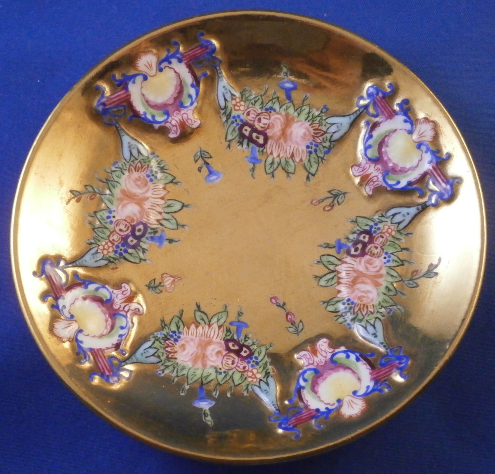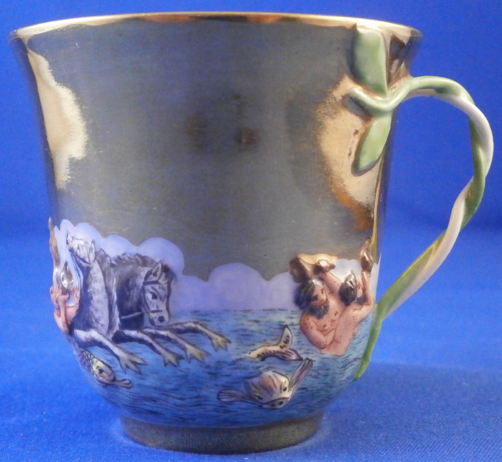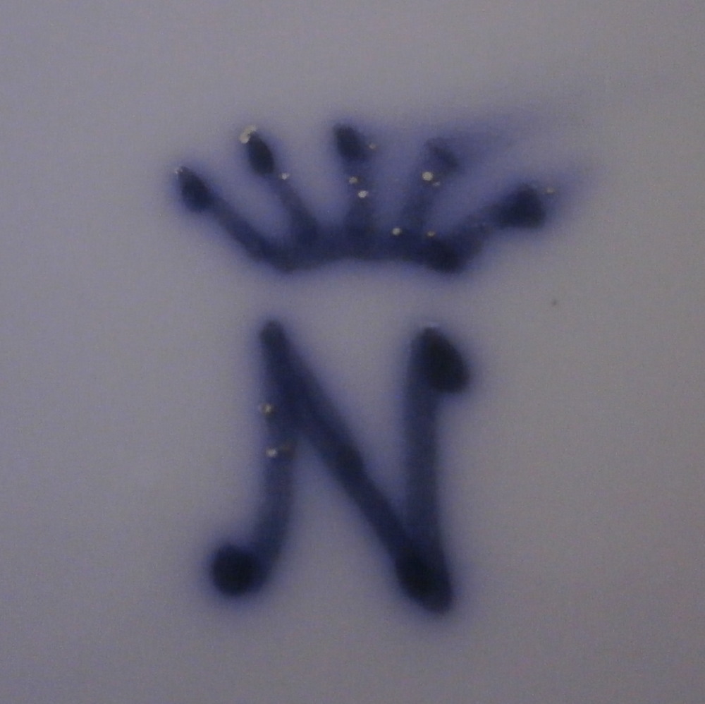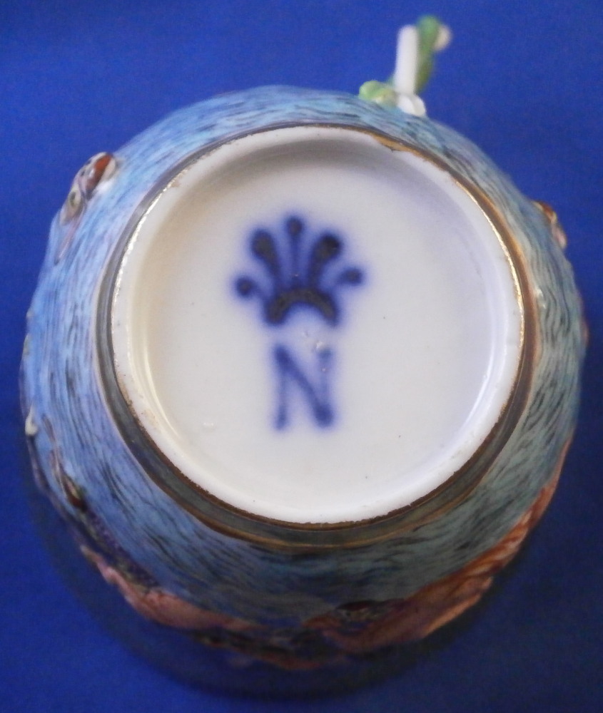 This is a great demitasse cup and sacuer set made by Doccia / Richard Ginori in the second half of the 19th century. One rarely sees these fully gilded sets! The cup has the typical raised relief decoration of mythical / biblical theme on it that is hand painted as well as the harder to find very delicate intertwined branch handle. The saucer has the floral garlands held up by scroll designs typical for this maker but what is unusual is that the areas that would normally be white are in this case completely gilded which looks quite elegant. The set is in superb condition with just a touch of use marks to the gilding which is to be expected. The cup and saucer are both marked underneath with an under glaze blue N under a crown as shown. The cup is just over 2.125 inches tall and about 2.25 inches in diameter. The saucer is 0.75 inches tall and 4.375 inches in diameter. Please email me for more information or other pictures.