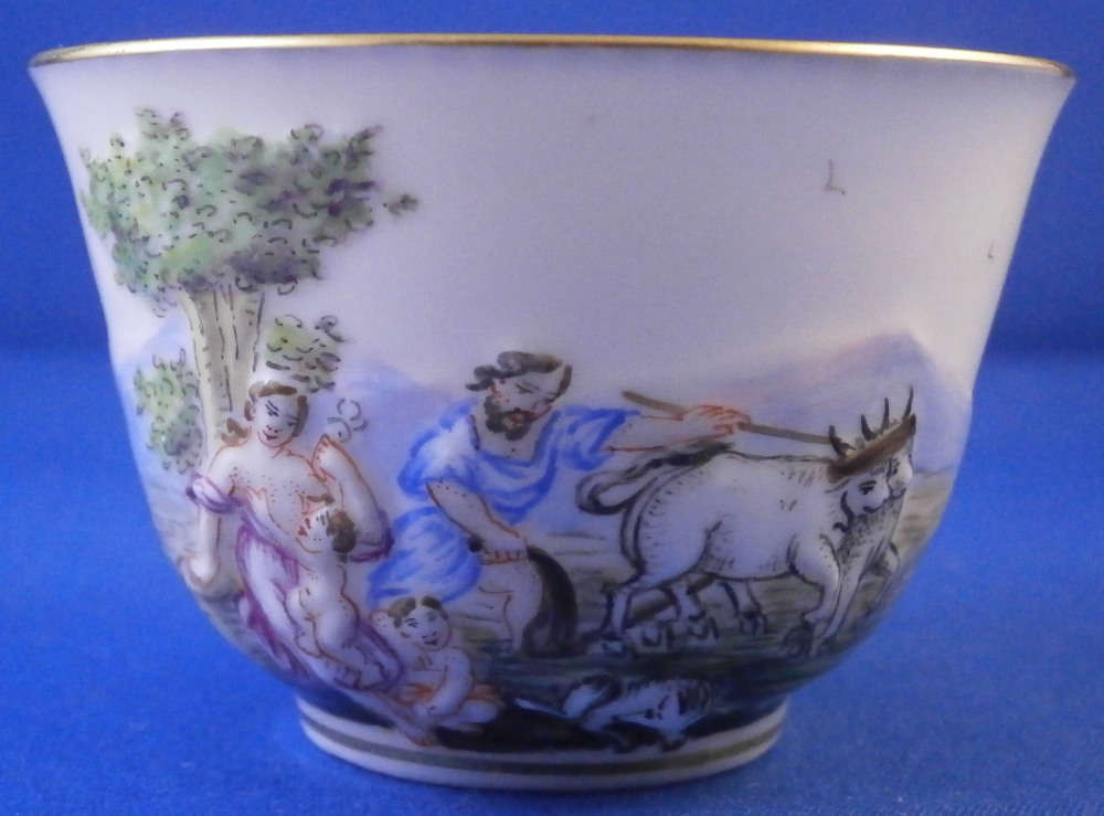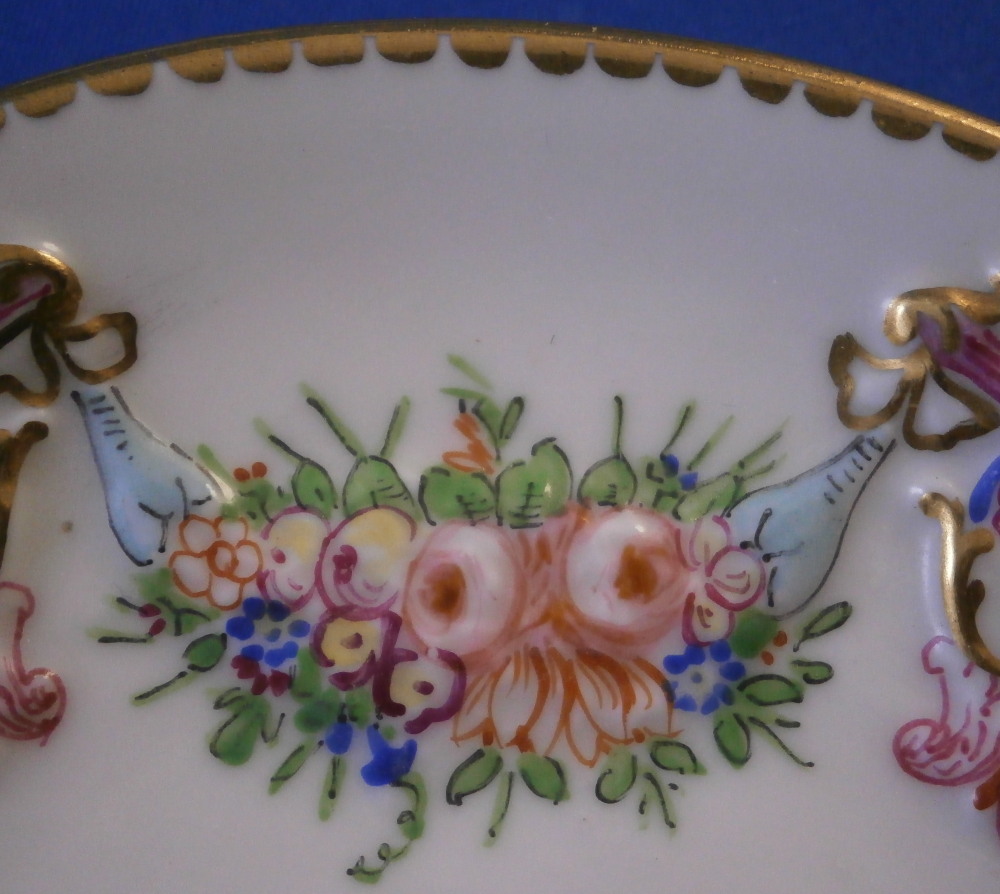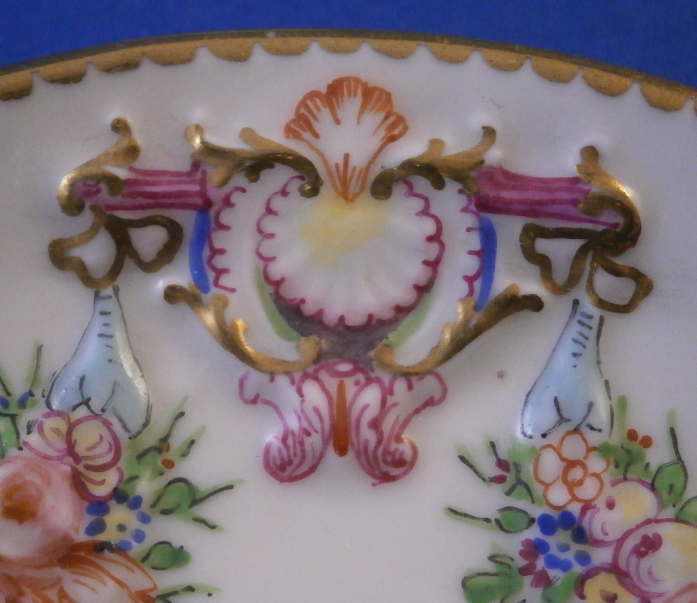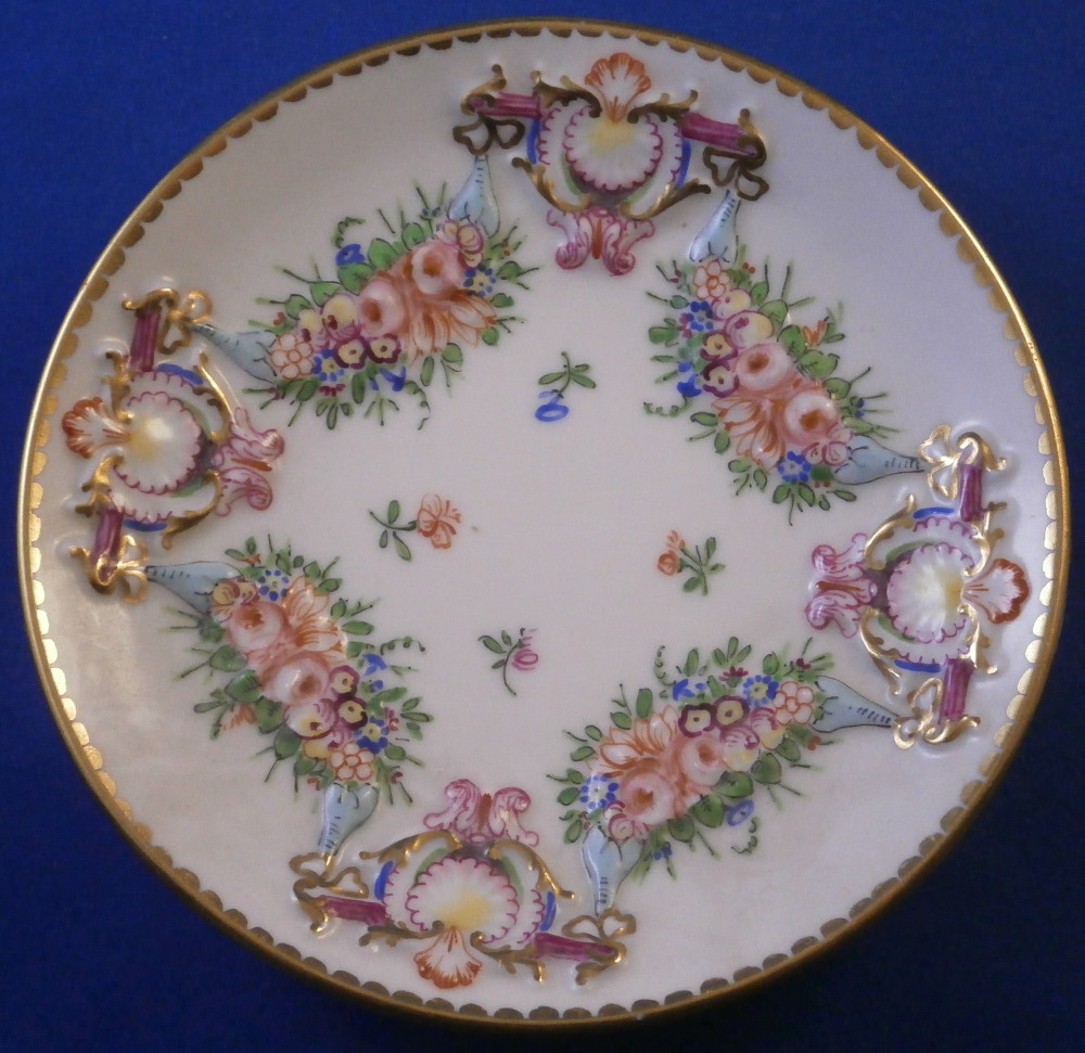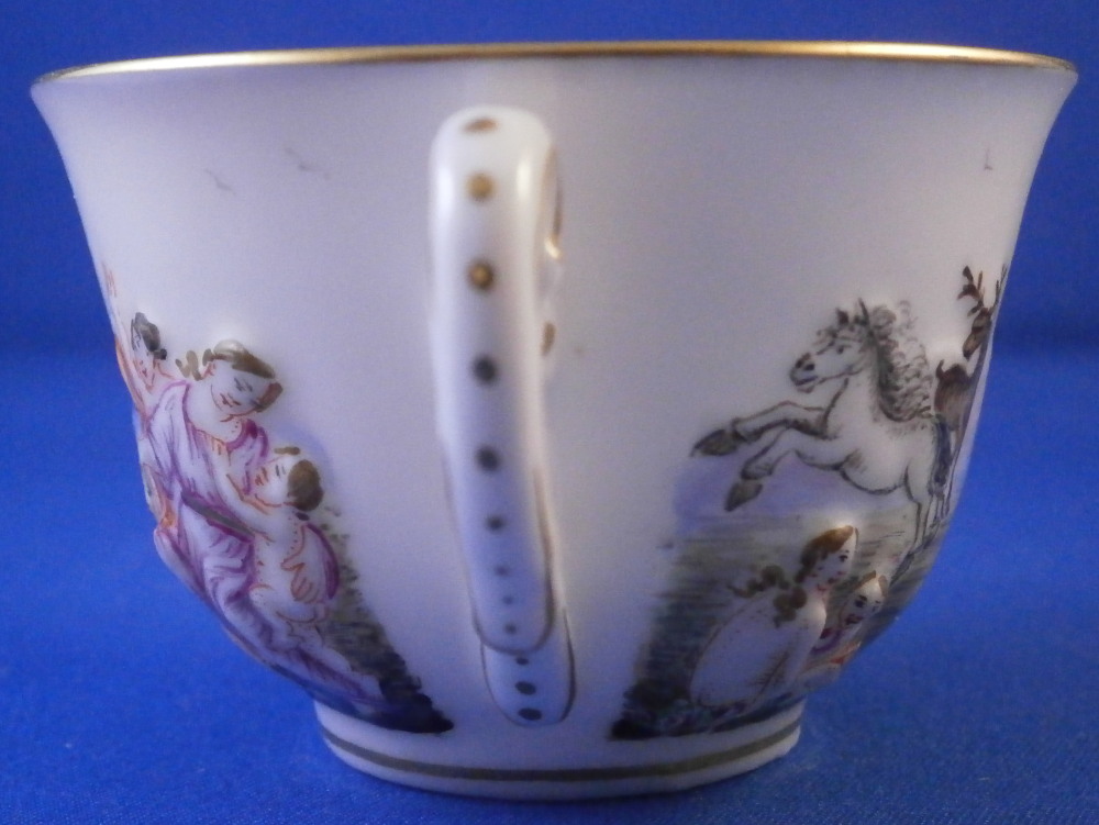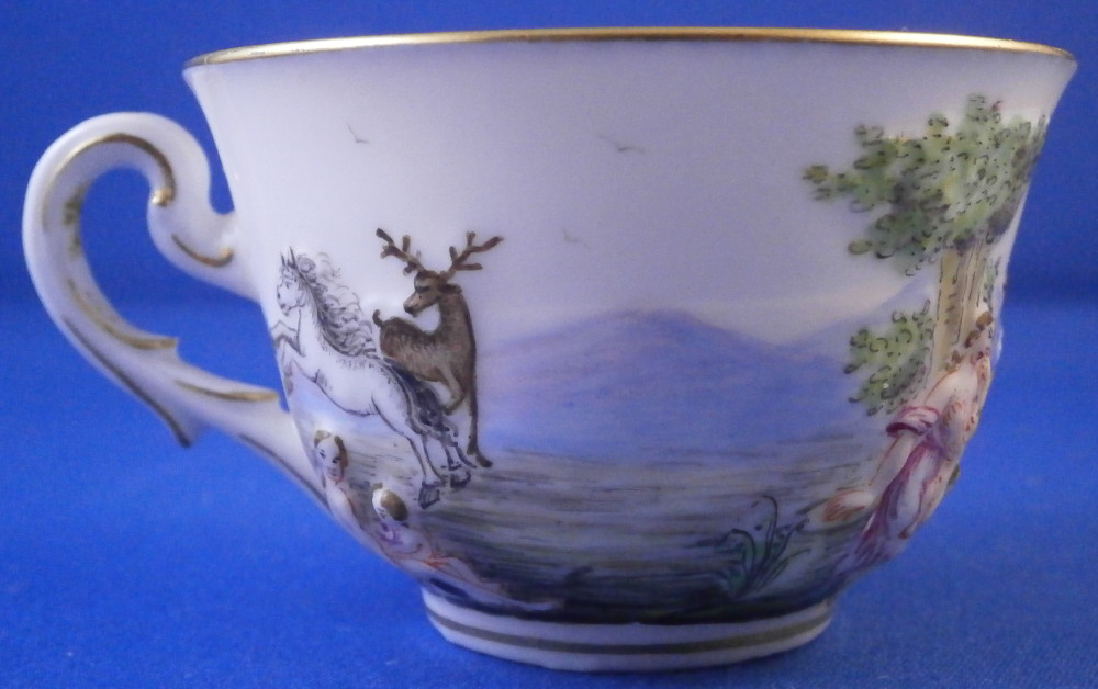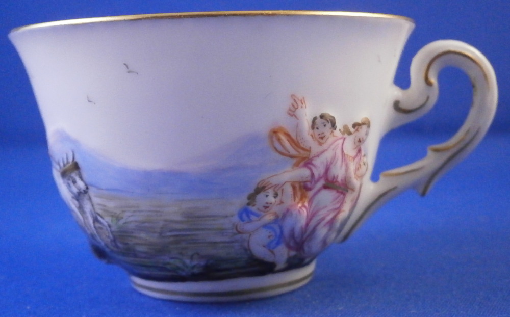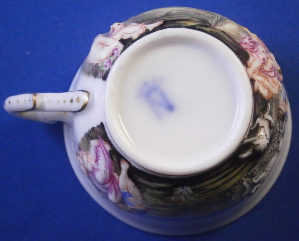 This is a rare and superb cup and saucer made by Doccia / Ginori later 19th century. I have not had one of this size and it was most likely used for the typically Italian drink Espresso or maybe a mocha coffee as well. The cup is decorated with biblical or mythological scenes in relief all around that are hand painted very nicely. Often called Capodimonte style. The less common more normal handle with a bit of gold trim to it. The red corral or intertwined branch handle are more common to these pieces but they also made this handle shape. The saucer is decorated with a relief design of floral garlands connected by a nice shell design all hand painted in their typical colors. Gold trim to the edges and a gold flower to the inside of the cup. The set is in perfect condition. Both pieces have the under glaze crown with the letter N below as shown. This is the original maker of this style that was so often copied later in Dresden, etc. and those examples one sees much more often! The cup is just under 1.75 inches tall and about 2.625 inches in diameter and the saucer is 0.75 inches tall and 4.375 inches in diameter. Not a size you find often at all! Please email me for more information or other pictures.