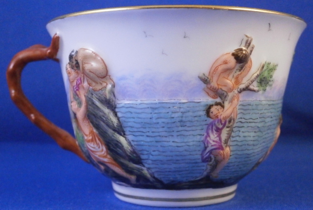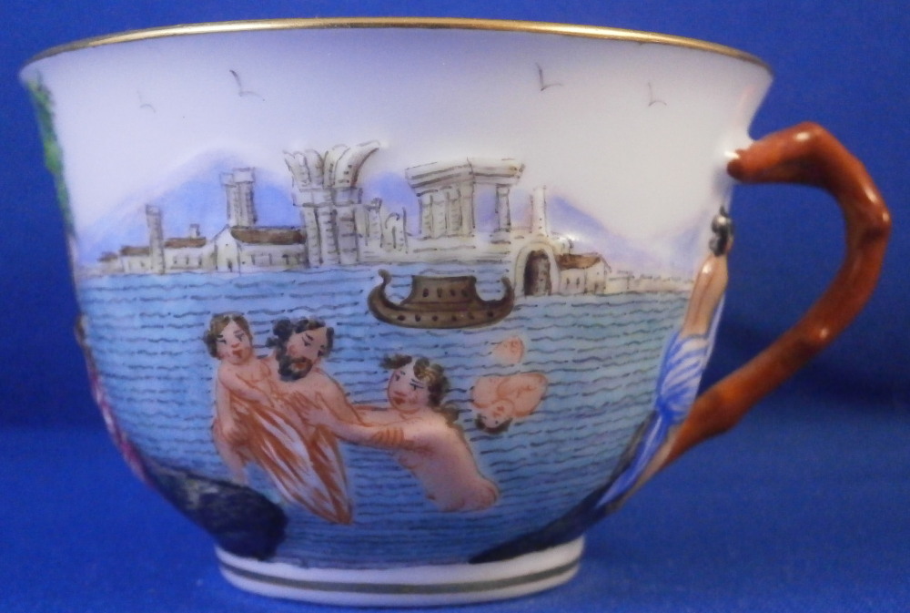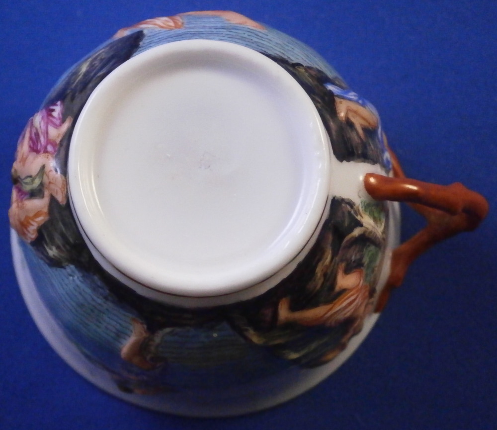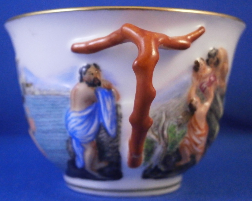 This is a rare and superb cup and saucer made by Doccia / Ginori later 19th century. I have not had one of this size and it was most likely used for the typically Italian drink Espresso or maybe a mocha coffee as well. The cup is decorated with biblical or mythological scenes in relief all around that are hand painted very nicely. Often called Capodimonte style. Nice red corral handle to one side. The saucer is decorated with a relief design of floral garlands connected by a nice shell design all hand painted in their typical colors. Gold trim to the edges and a gold flower to the inside of the cup. The set is in perfect condition. The cup is unmarked (that is not uncommon at all) while the saucer has the under glaze crown with the letter N below as shown. This is the original maker of this style that was so often copied later in Dresden, etc. and those examples one sees much more often! The cup is 175 inches tall and about 2.625 inches in diameter and the saucer is 0.75 inches tall and 4.5 inches in diameter. Not a size you find often at all! Please email me for more information or other pictures.