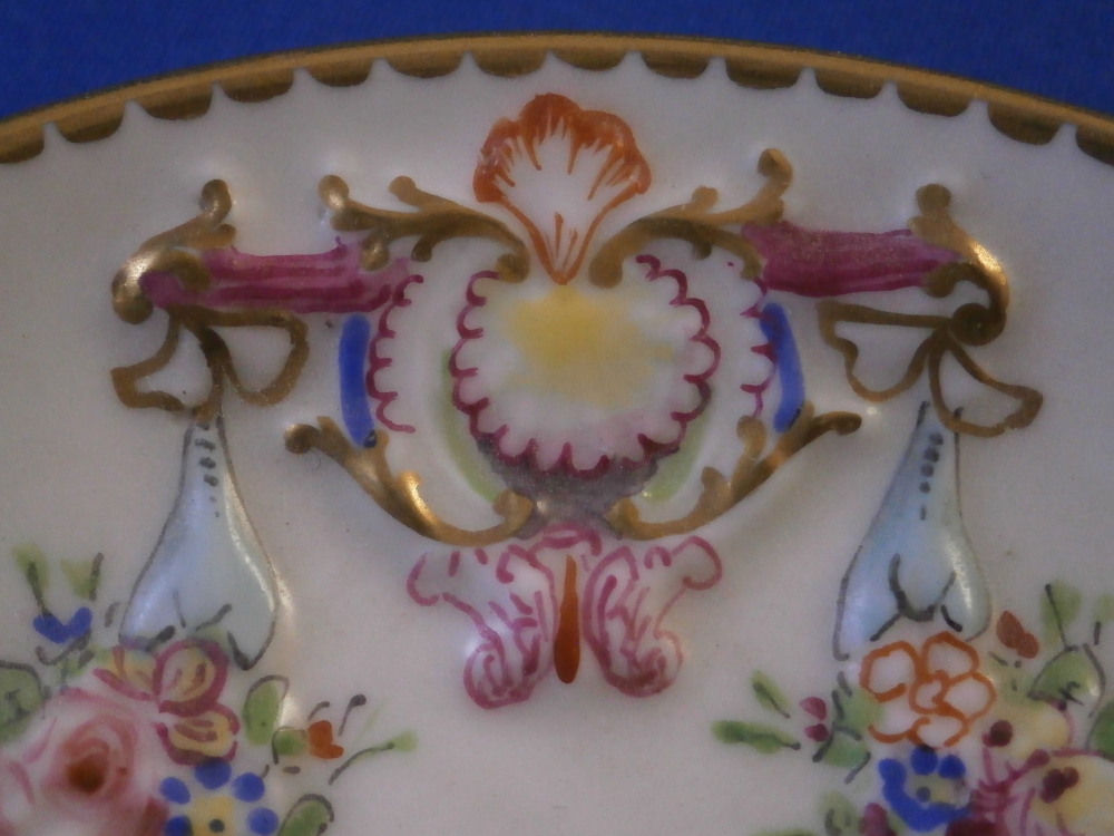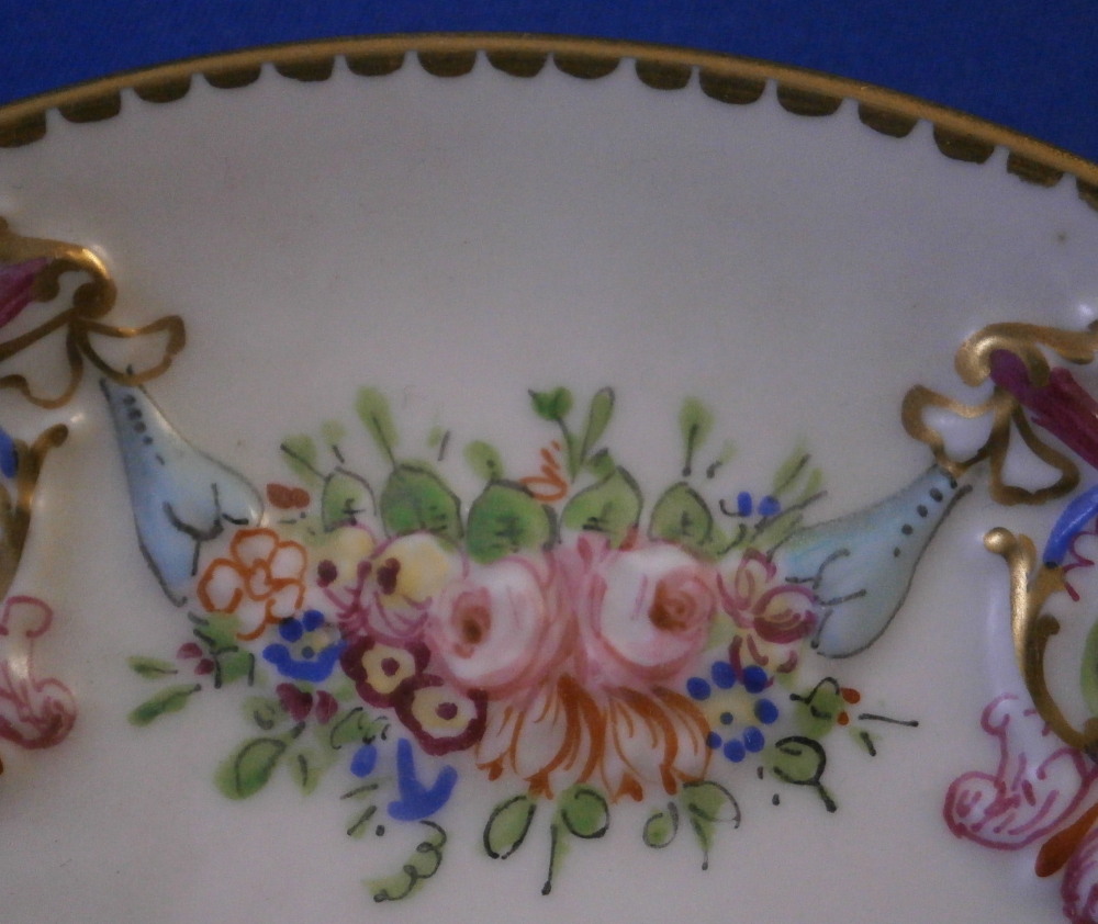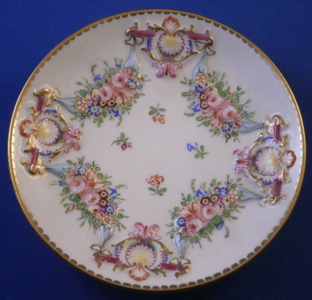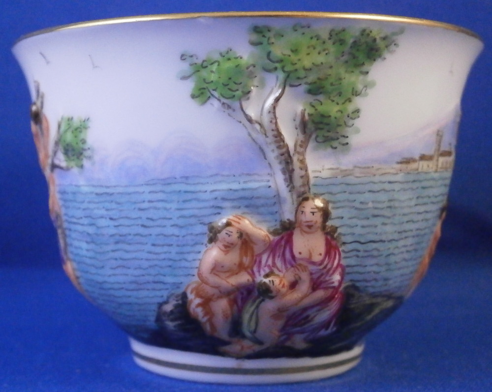 This is a rare and superb cup and saucer made by Doccia / Ginori later 19th century. I have not had one of this size and it was most likely used for the typically Italian drink Espresso or maybe a mocha coffee as well. The cup is decorated with biblical or mythological scenes in relief all around that are hand painted very nicely. Often called Capodimonte style. Nice red corral handle to one side. The saucer is decorated with a relief design of floral garlands connected by a nice shell design all hand painted in their typical colors. Gold trim to the edges and a gold flower to the inside of the cup. The set is in perfect condition. The cup is unmarked (that is not uncommon at all) while the saucer has the under glaze crown with the letter N below as shown. This is the original maker of this style that was so often copied later in Dresden, etc. and those examples one sees much more often! The cup is 175 inches tall and about 2.625 inches in diameter and the saucer is 0.75 inches tall and 4.5 inches in diameter. Not a size you find often at all! Please email me for more information or other pictures.