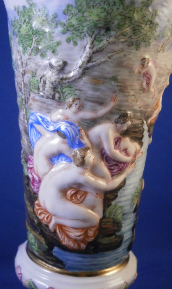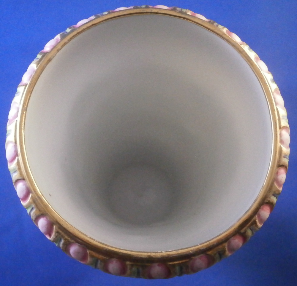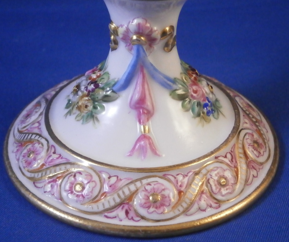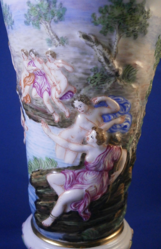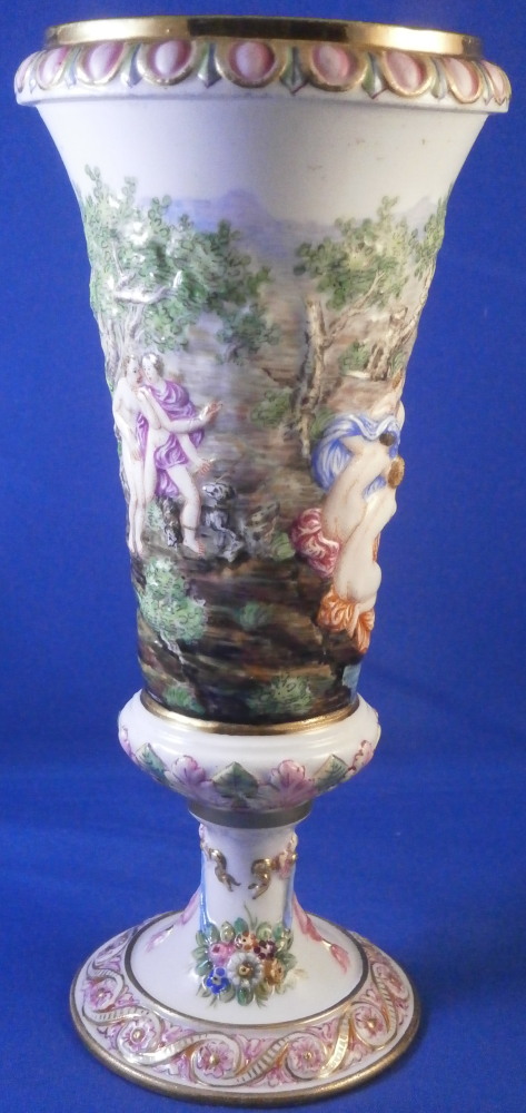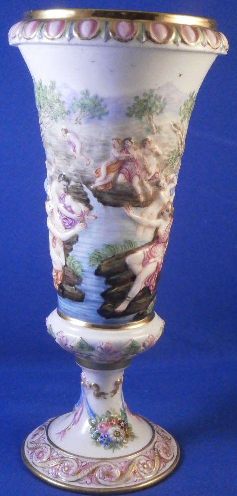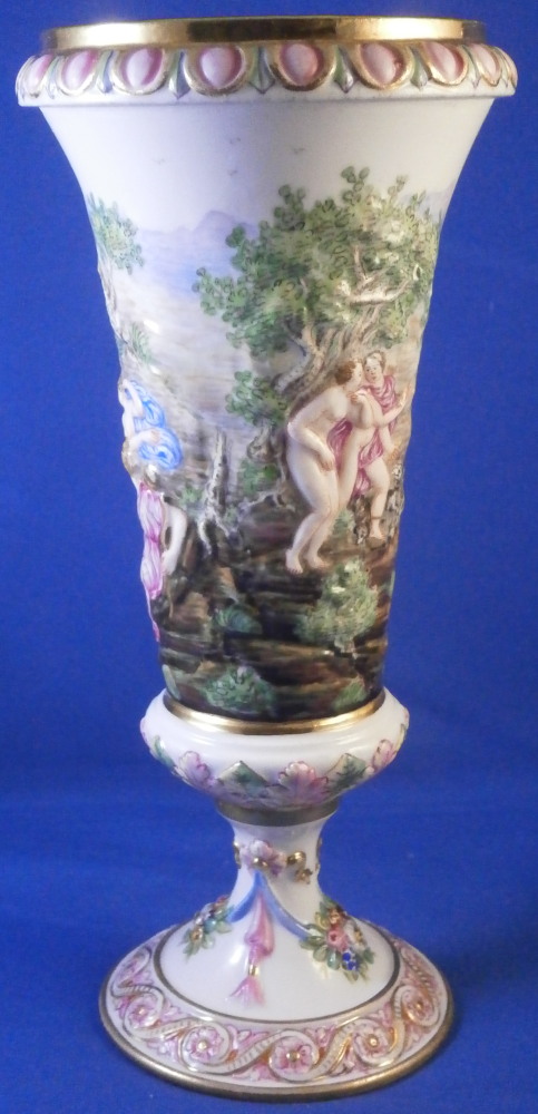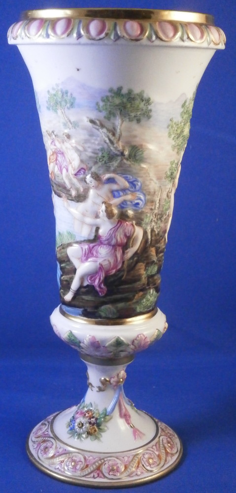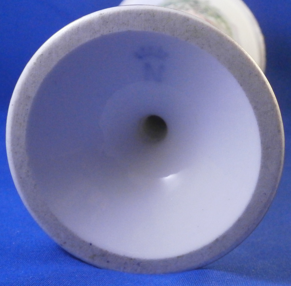 This is a tall and skinny trumpet shaped vase or even a goblet for drinking made by Doccia / Richard Ginori in mid to late 19th century. The piece has a shape I had not seen before with the skinny top part sitting on a base - all one piece. Now this is my second piece in this shape so if anyone is interested in a rare pair just let me know. The flared top has a colorful design to the edge as well as some gilding. The center of the main body has the typical relief scene all around that is hand painted, another coloful leaf design trim to the bottom of the main body. The base has a really nice pink and gold trim to the edge and a floral swag design around the thin part in relief. Lots of nice detail make this a fun piece! The colors are quite typical and it is very elegant. Hard to find the real Doccia / Ginori pieces! The vase is in excellent condition! The piece is marked underneath with the N under a crown as shown. It is 7.75 inches tall and 3.5 inches in diameter. Please email me for more information or other pictures.