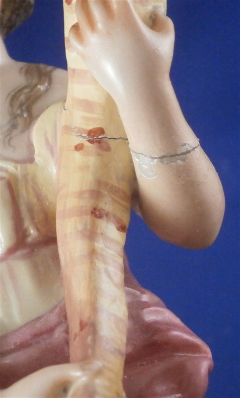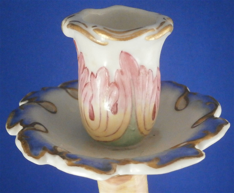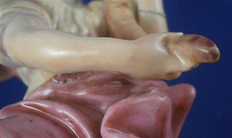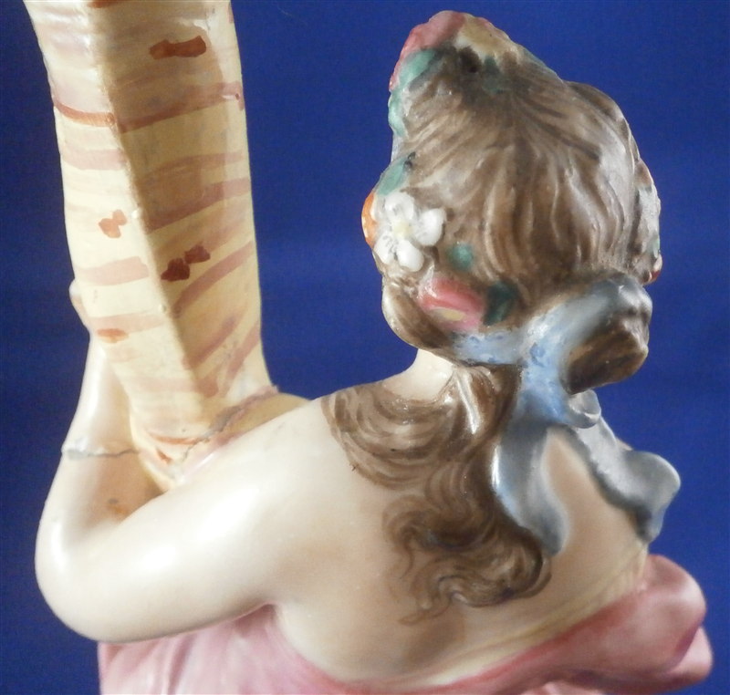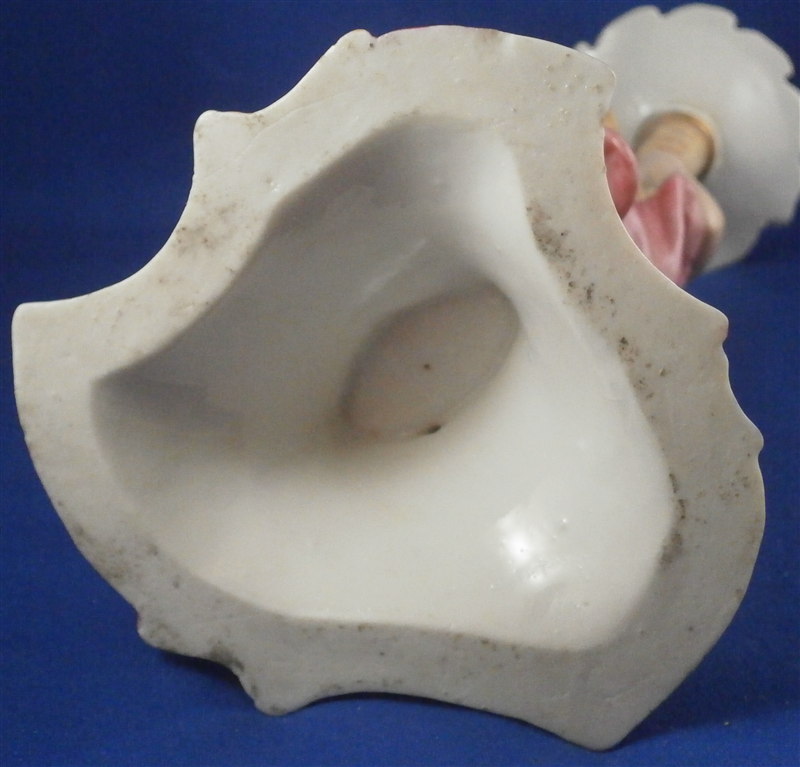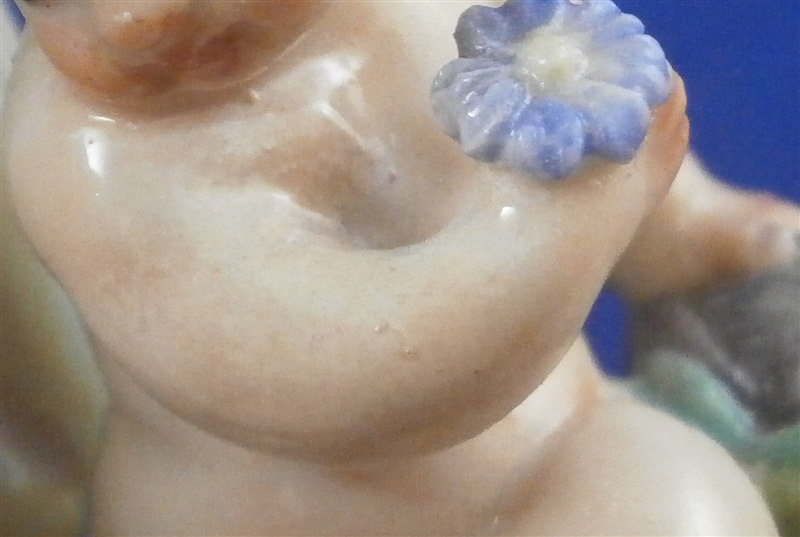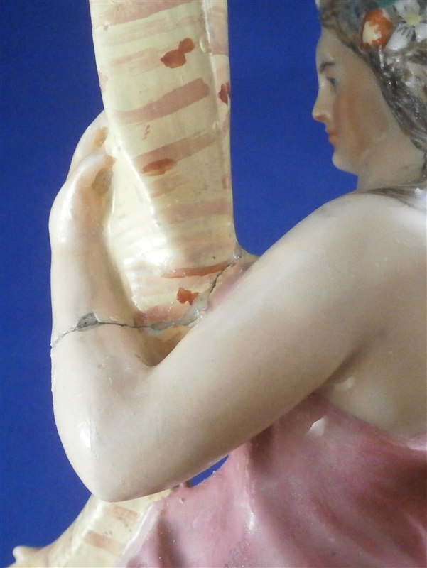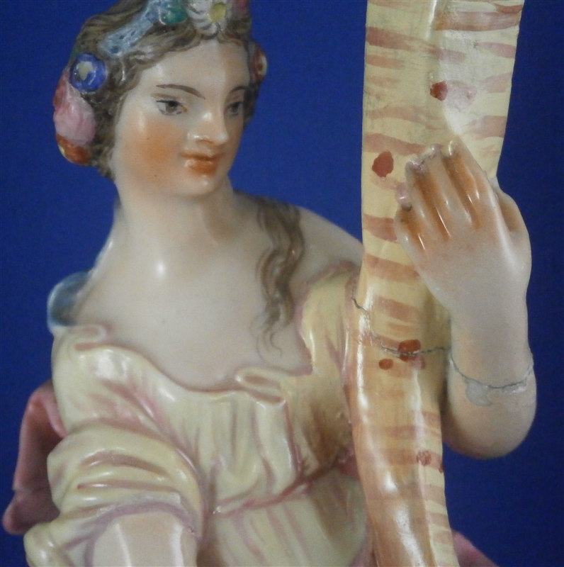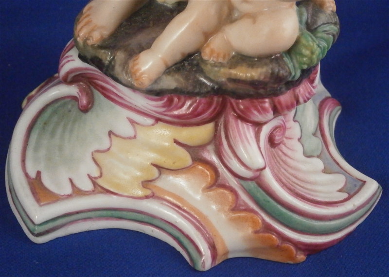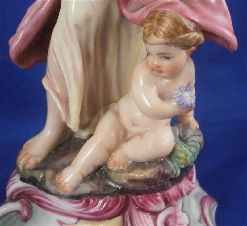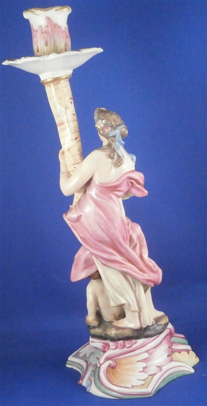 This is a ssecond superb figural candlestick made by Doccia in the 18th century. It is from a set of four depicting the four seasons two being male and two being female. This one is spring I guess. The piece is modeled as a female figure holding up a horn of plenty looking item in his left hand which has the candleholder on top of it. She has a little female putto by her left side which is holding a flower. The base is nicely shaped with some really bright colors on it typical of Doccia. The piece displays superbly but there is some restoration present which is normal on these pieces. The putto's right arm is restored and the lady's left arm is restored as well as the horn of plenty in that area. There is a break arcross that same area which was reglued. Two tiny nibbles to the base! The candleholder part is attached with filler but I think that is original to make it straight since otherwise it would have been quite crooked! All in all she displays nicely and is a rare example of this maker! The piece is unmarked underneath which is very common. It is 11.375 inches tall, 4 inches wide and 4.25 inches deep. Please email me for more information or other pictures.