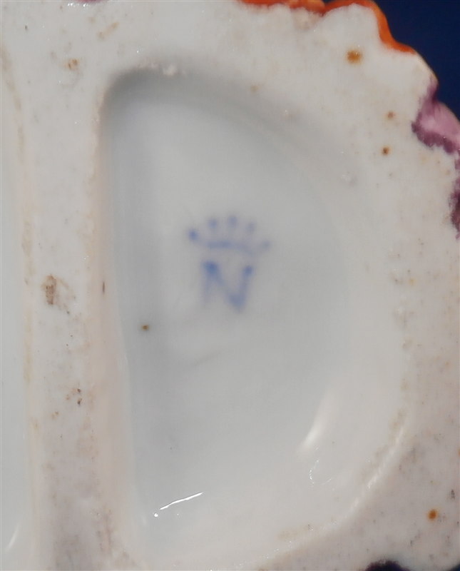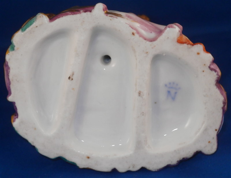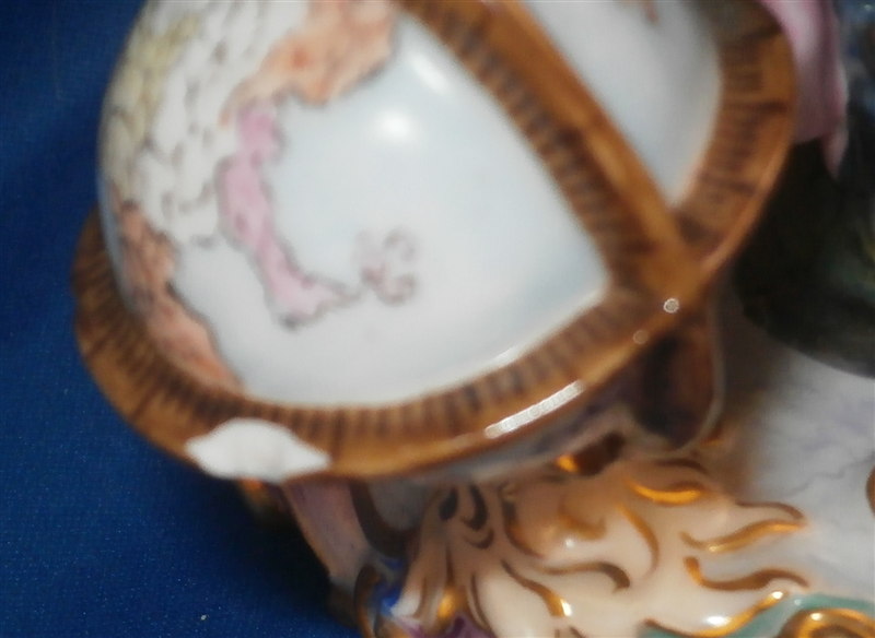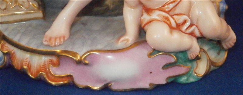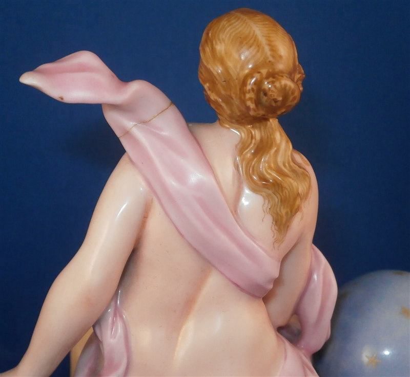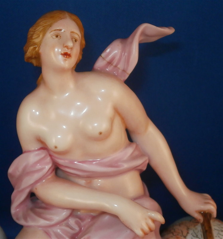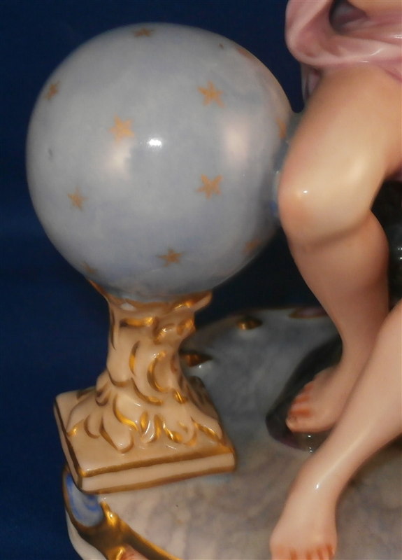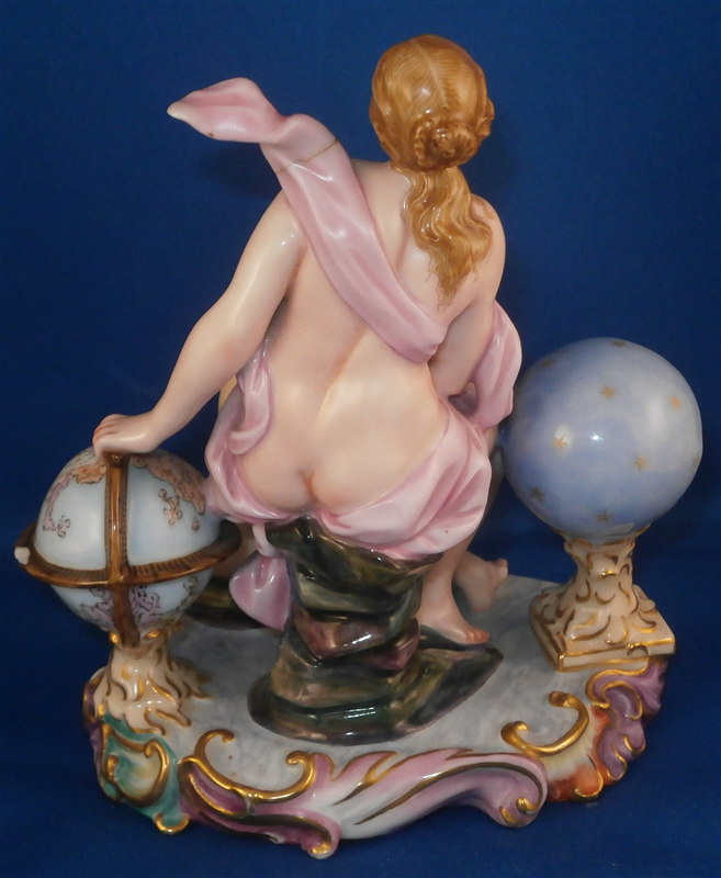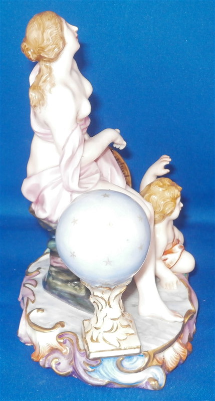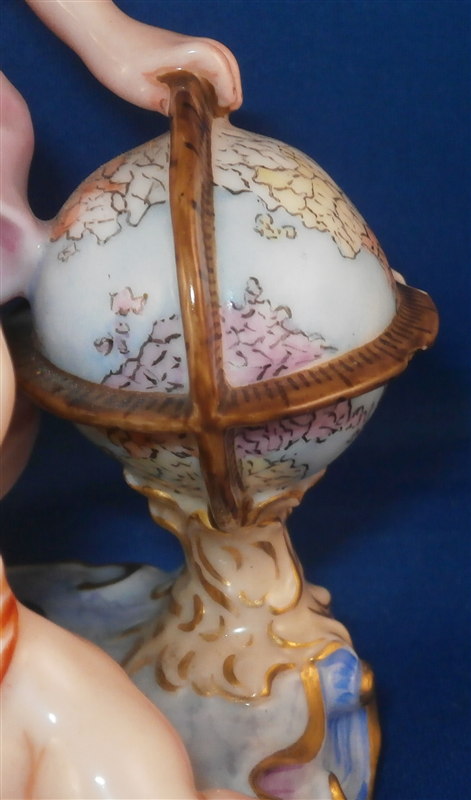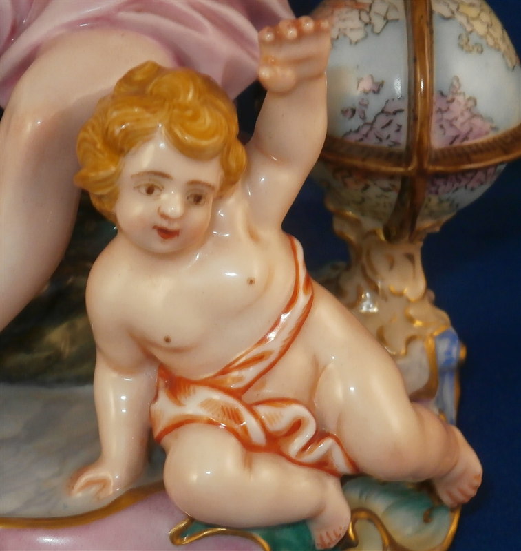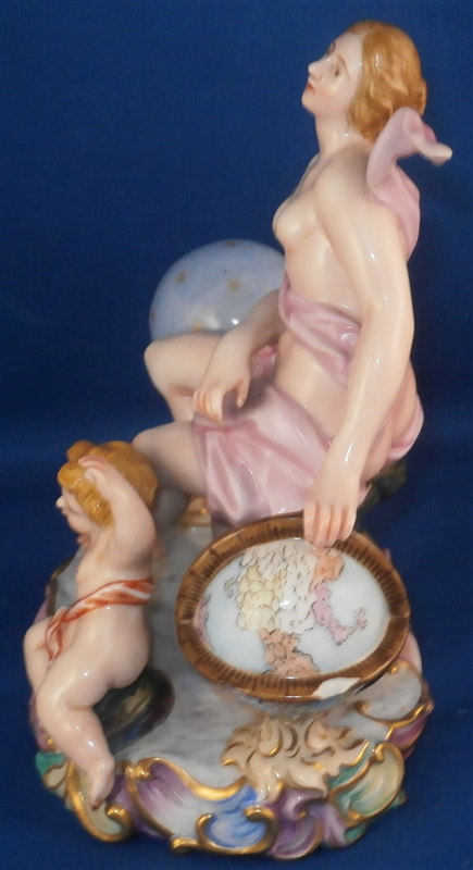 This is an superb figurine made by Doccia in the late 18th or early 19th century. It is of a lady in the center wearing a pink cloth, two celestial / earth globes beside her with a putto up front. Probably representing astronomy . The base is superb with the top looking like marble and the sides the typical colorful scrolls one expects from Doccia of this period. The piece is amazingly well modeled and painted! And to top it off it is in great condition! The tip of the pink cloth over her left shoulder was broken and reattached with the lin showing and the earth globe has two chips to the brown center line with one having been painted to hide it better. The piece is marked underneath with an underglaze blue N under a crown. The figure is 6.125 inches tall, 5 inches wide and 3.625 inches deep. Please email me for more information or other pictures.