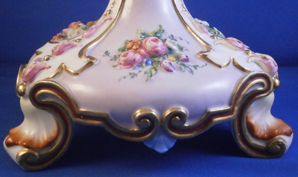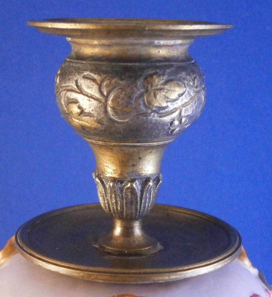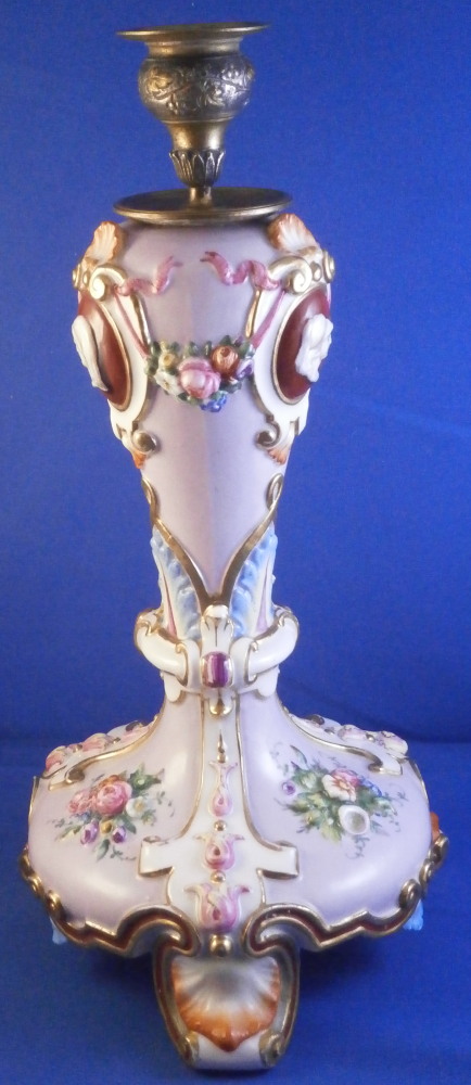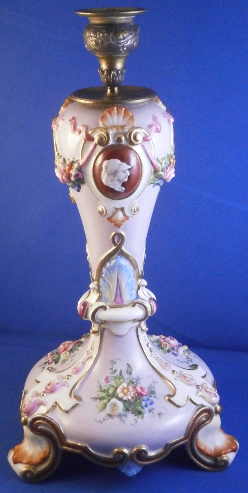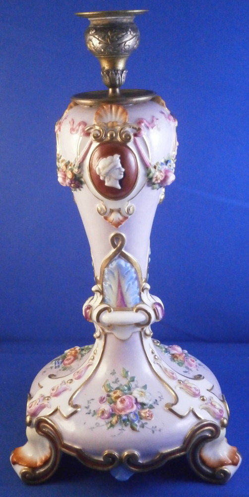 This is an superb large candlestick made by Doccia in the mid to late 19th century. It is quite large and could be used as a lamp base if someone would want to convert it. The base is a porcelain piece with the top part being decorated in relief with floral swags in between medallions of female busts with an orange shell trim to the top. The center has a nice design to it and the base has floral arrangements in relief with a nice design in between. The piece sits on three feet that are nicely decorated. All hand painted in their typical colors. The candlestick cup part is made of brass or bronze with a little leaf design to the side. It looks great and is quite solid so no chance of it tipping over! An unusual piece I have not come across before. The underside of the base has their usual crown over N mark in under glaze blue as shown. The candle stick is 11.5 inches tall and the base has a diameter of 5.375 inches with the feet sticking out a bit from there. Please email me for more information or other pictures.