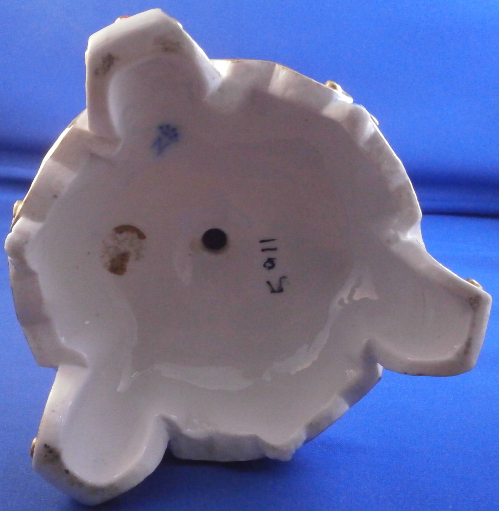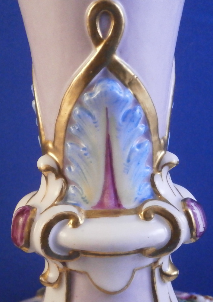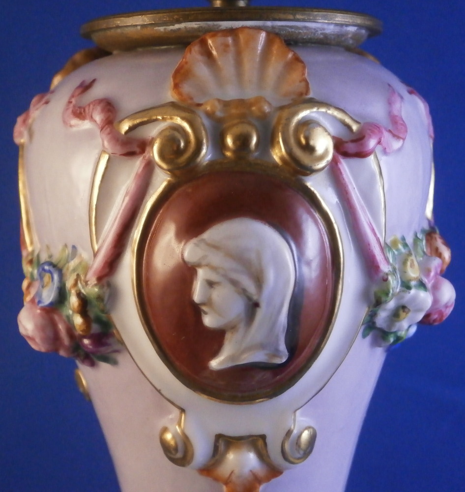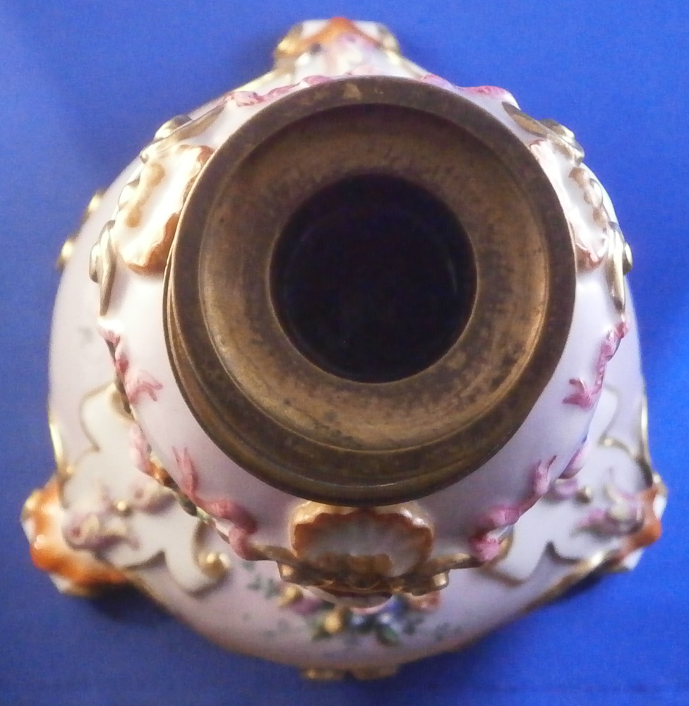 This is an superb large candlestick made by Doccia in the mid to late 19th century. It is quite large and could be used as a lamp base if someone would want to convert it. The base is a porcelain piece with the top part being decorated in relief with floral swags in between medallions of female busts with an orange shell trim to the top. The center has a nice design to it and the base has floral arrangements in relief with a nice design in between. The piece sits on three feet that are nicely decorated. All hand painted in their typical colors. The candlestick cup part is made of brass or bronze with a little leaf design to the side. It looks great and is quite solid so no chance of it tipping over! An unusual piece I have not come across before. The underside of the base has their usual crown over N mark in under glaze blue as shown. The candle stick is 11.5 inches tall and the base has a diameter of 5.375 inches with the feet sticking out a bit from there. Please email me for more information or other pictures.