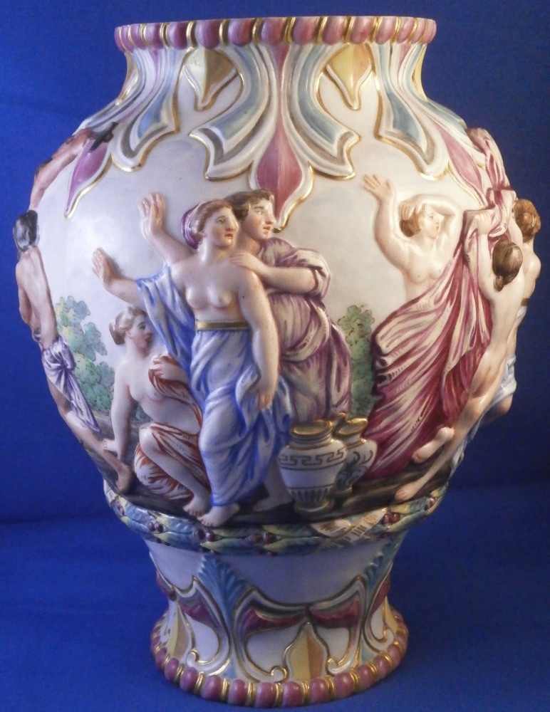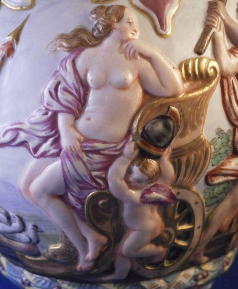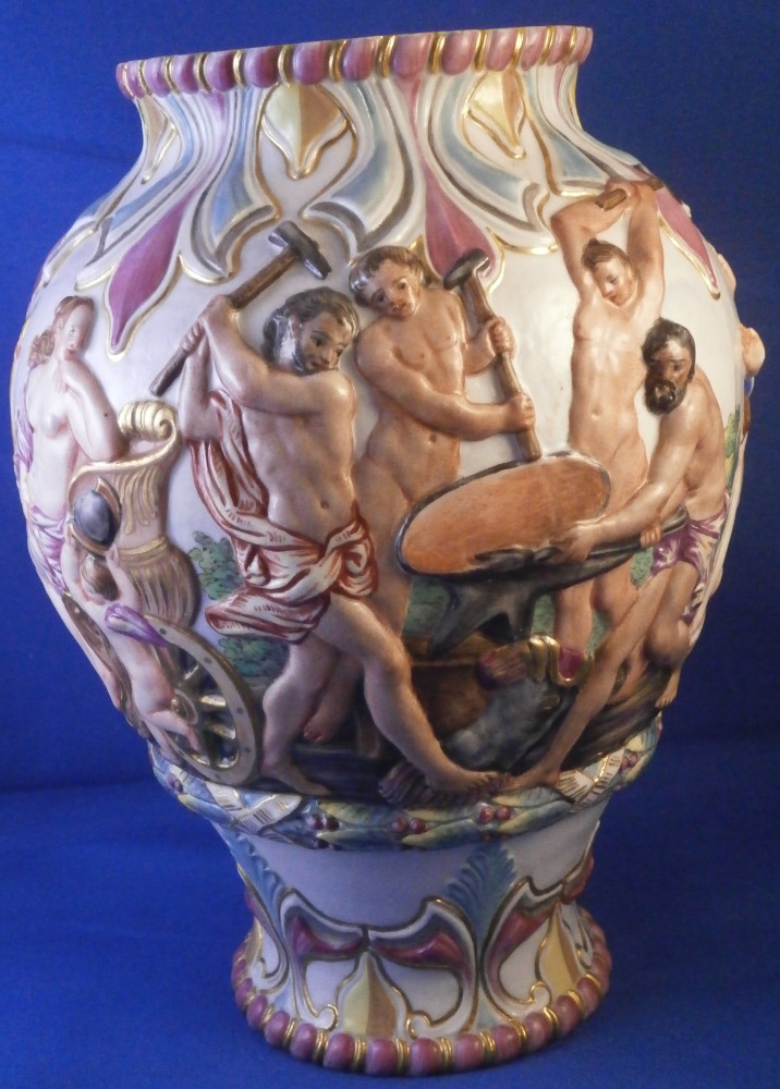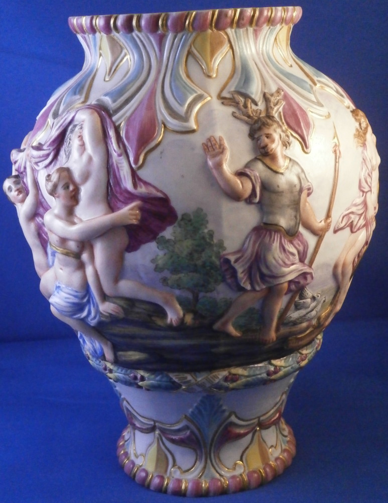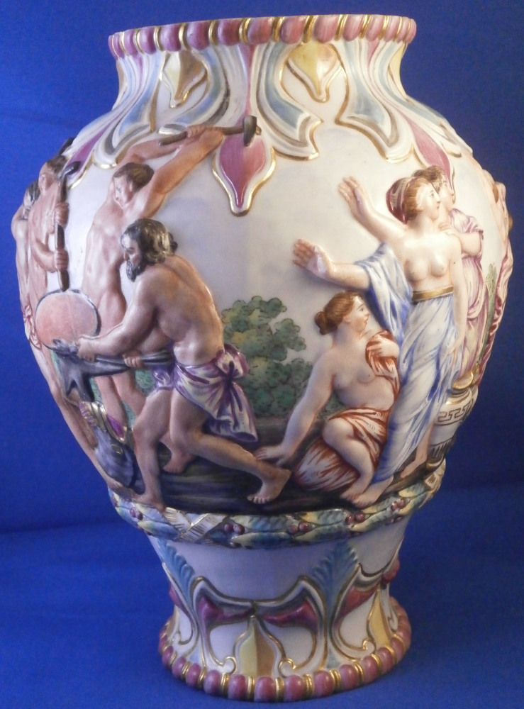 This is a superb lidded urn / vase made by Doccia in the earlier 19th century. A very heavy piece that is thickly potted and is decorated with a wrap around relief scene that is hand painted superbly. The relief is rather high compared to most of the peices I ahve owned by them. There is also a nice design in relief to the top and bottom with a wreath garland underneath the scene. Some gold highlights as well. The lid has the same design to it and a really nice fruit finial including its stem and a leaf. The piece is based on an 18th century example and includes a scene of Vulcan as well as Venus. Lots of detail to it and the quality is superb! Quite typical of this maker and a very nice example of their work. Hard to find the real Doccia / Ginori pieces! The German and French copies are much more common. The piece is in excellent condition! There is a factory repaired firing crack to the inside as shown. Does not leak or anything like that! The piece is unmarked underneath which is pretty noprmal for their earlier pieces! The lidded vase is about 10.25 inches tall with a diameter of 5.75 inches. Quite heavy for its size. Please email me for more information or other pictures.