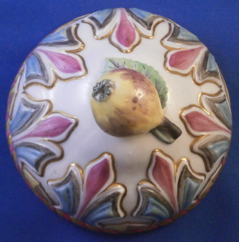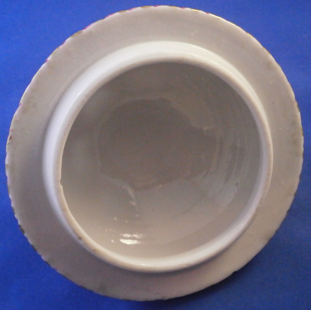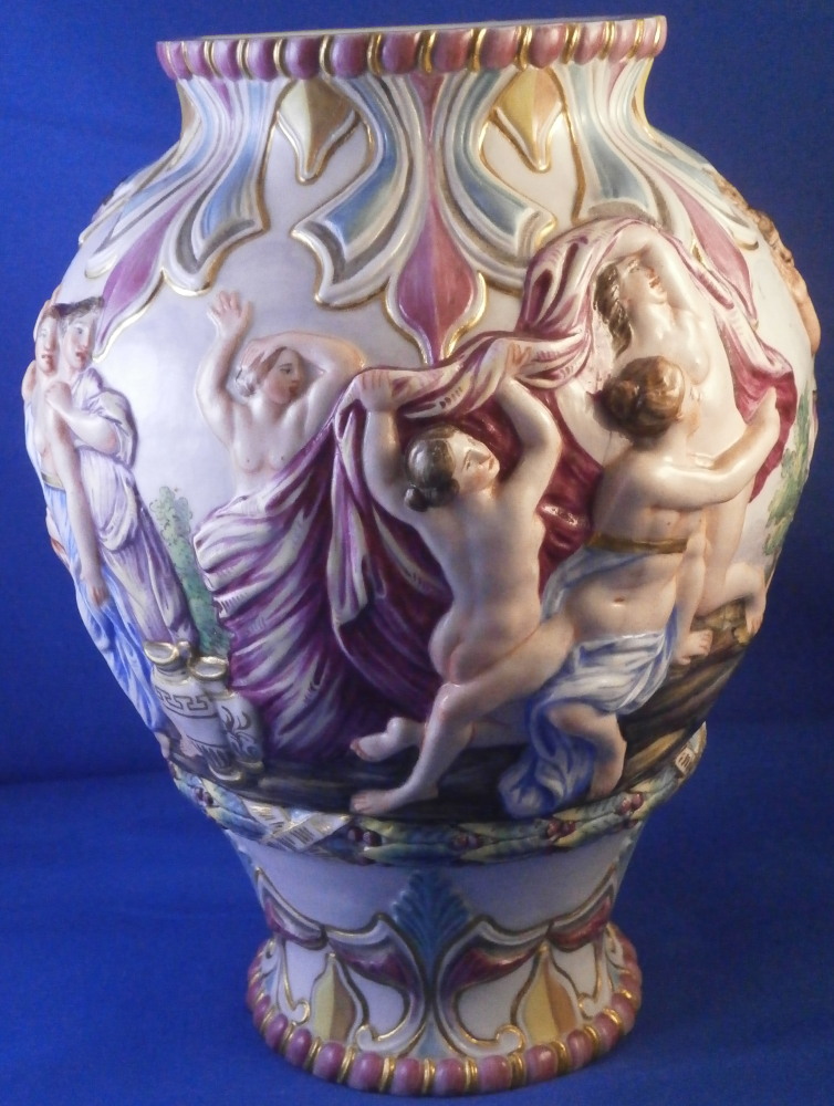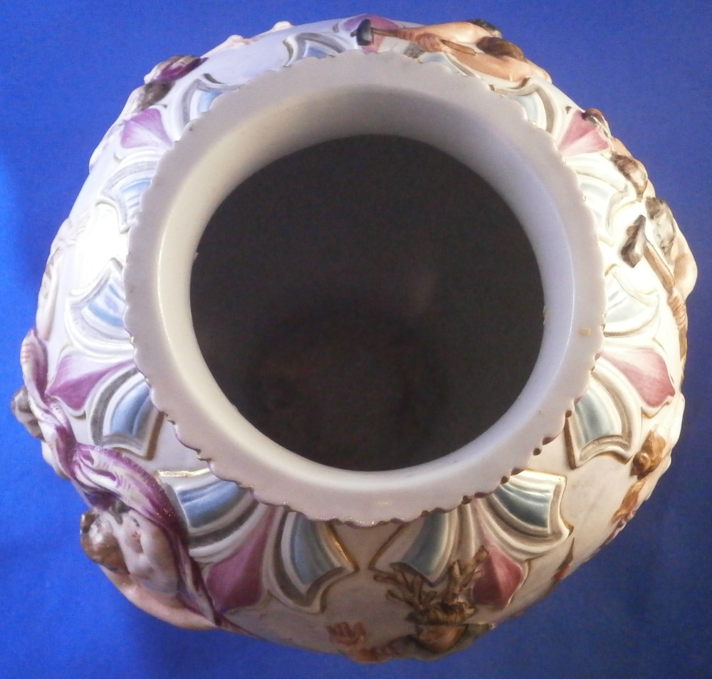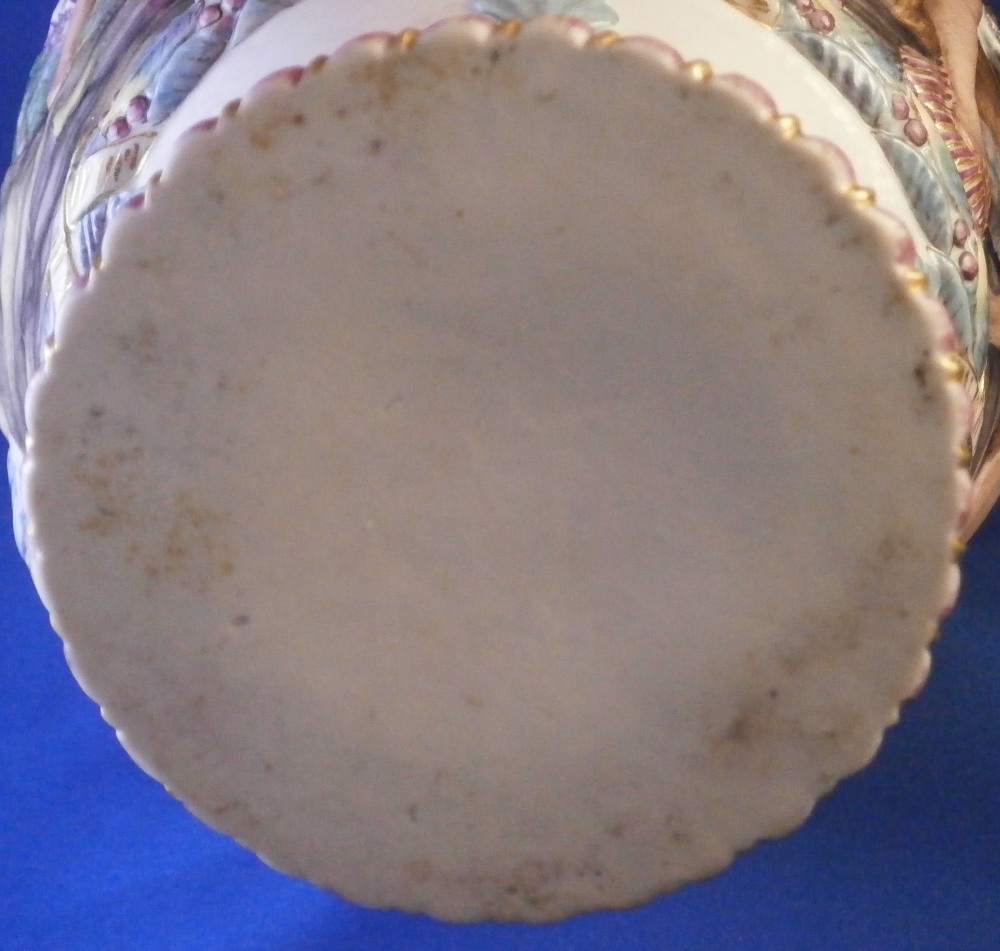 This is a superb lidded urn / vase made by Doccia in the earlier 19th century. A very heavy piece that is thickly potted and is decorated with a wrap around relief scene that is hand painted superbly. The relief is rather high compared to most of the peices I ahve owned by them. There is also a nice design in relief to the top and bottom with a wreath garland underneath the scene. Some gold highlights as well. The lid has the same design to it and a really nice fruit finial including its stem and a leaf. The piece is based on an 18th century example and includes a scene of Vulcan as well as Venus. Lots of detail to it and the quality is superb! Quite typical of this maker and a very nice example of their work. Hard to find the real Doccia / Ginori pieces! The German and French copies are much more common. The piece is in excellent condition! There is a factory repaired firing crack to the inside as shown. Does not leak or anything like that! The piece is unmarked underneath which is pretty noprmal for their earlier pieces! The lidded vase is about 10.25 inches tall with a diameter of 5.75 inches. Quite heavy for its size. Please email me for more information or other pictures.