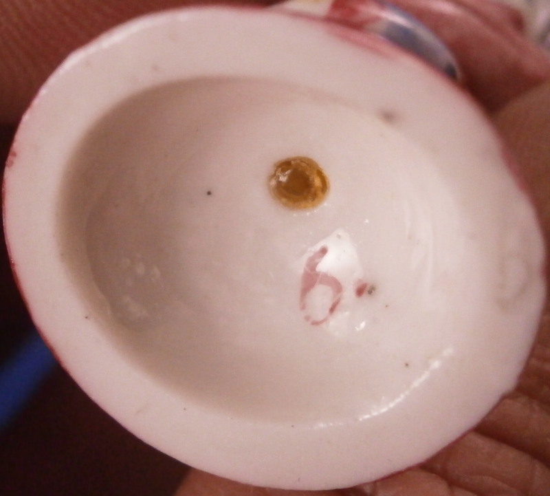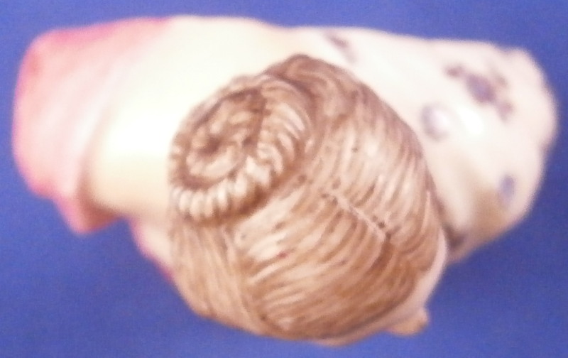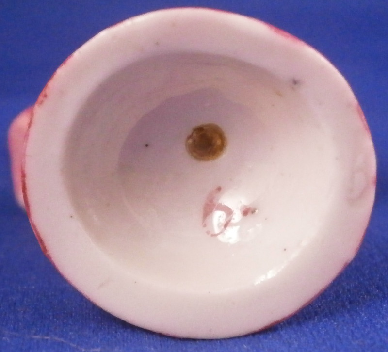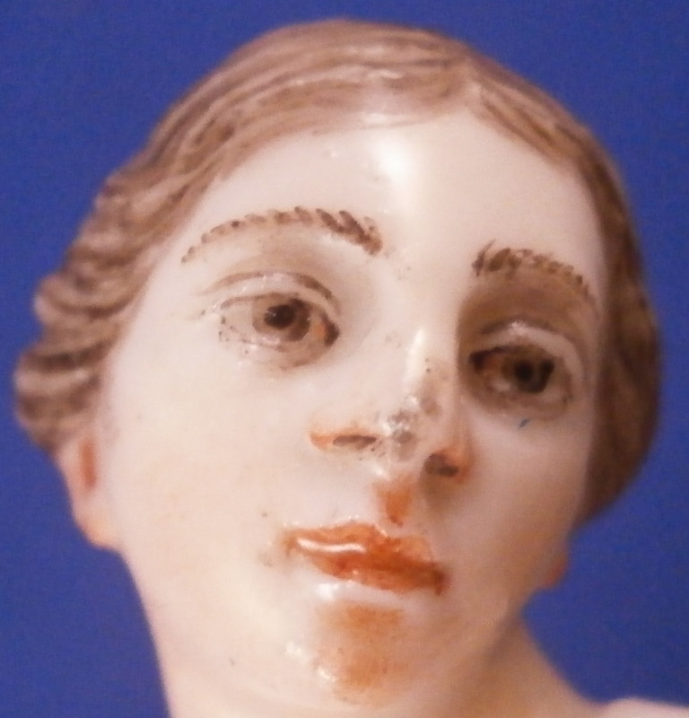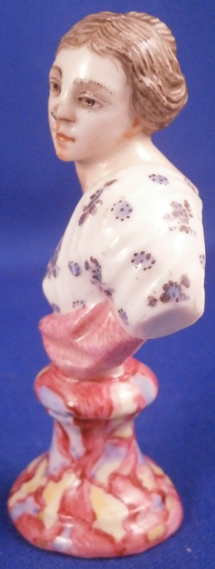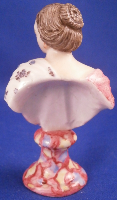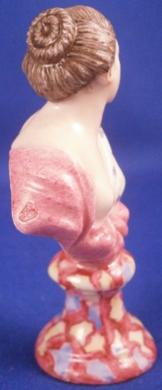 This is a fun miniature figural lady bust made by Doccia in the 18th century. The bust has a colorful pedstal underneath it that is not made separately but part of the piece. Typical colors for this maker. The fun base is a dead give away for this maker. The lady bust is nicely modeled with a floral cloth over her left shoulder and a pink on over her right should leaving her right breast exposed. The figurine is in superb condition with just some discoloration to the nose from when it was made. Unmarked except for a puce 6. as shown which is not unusual at all as most of their early wares were not marked. The figure is 2.5 inches tall, 1.5 inches wide and 1 inch deep. Please email me for more information or other pictures.