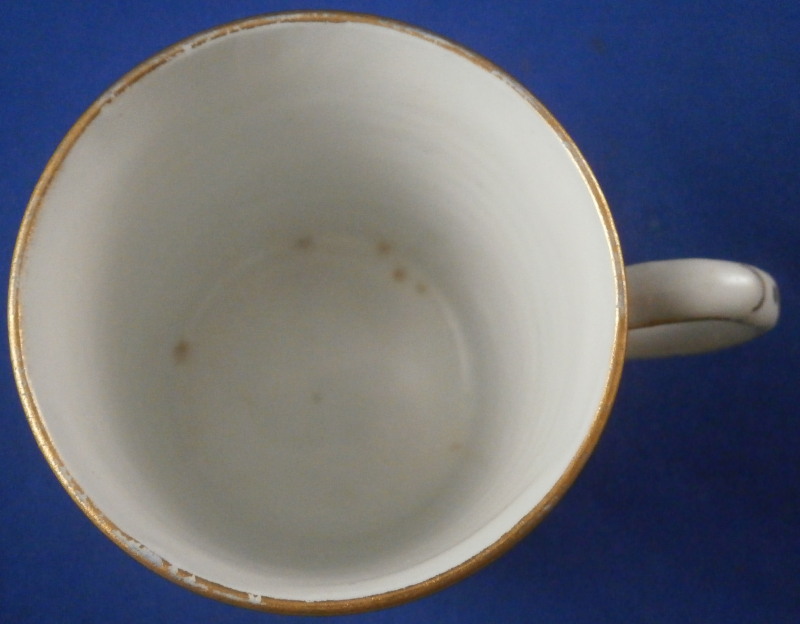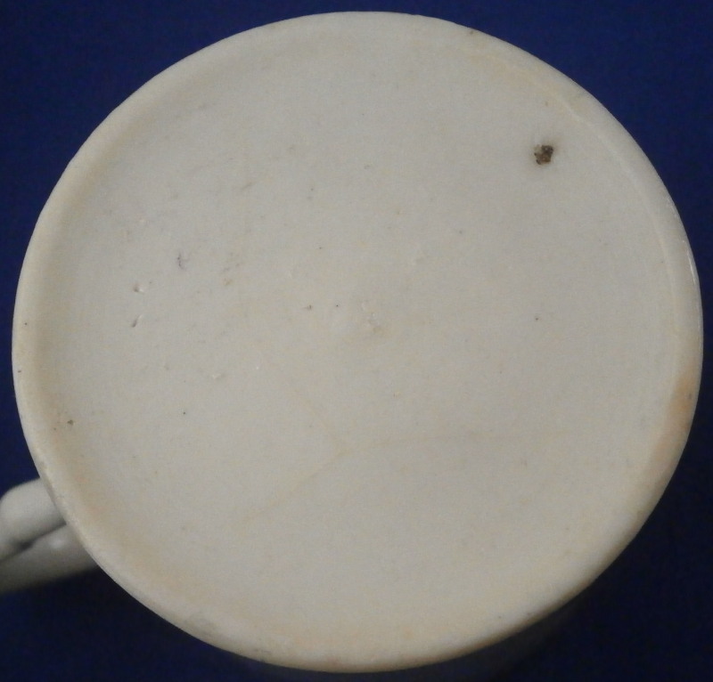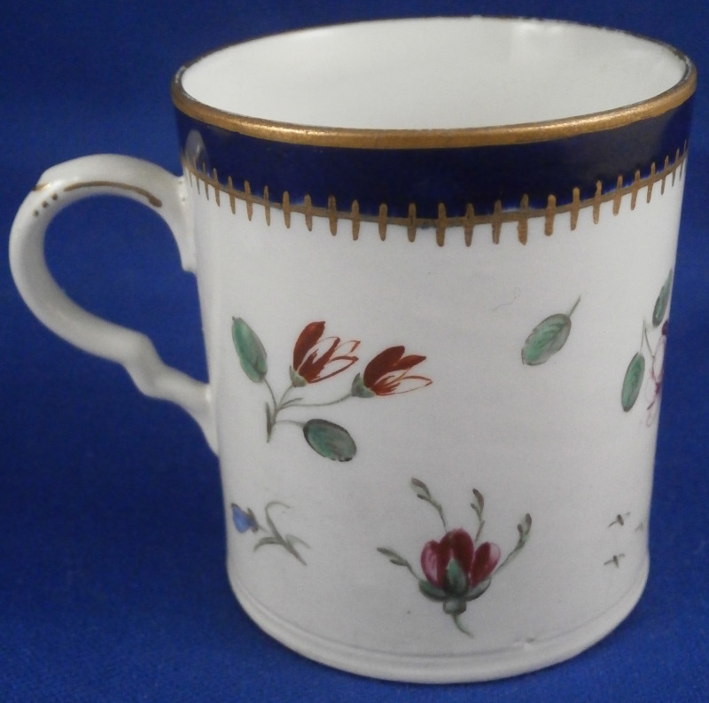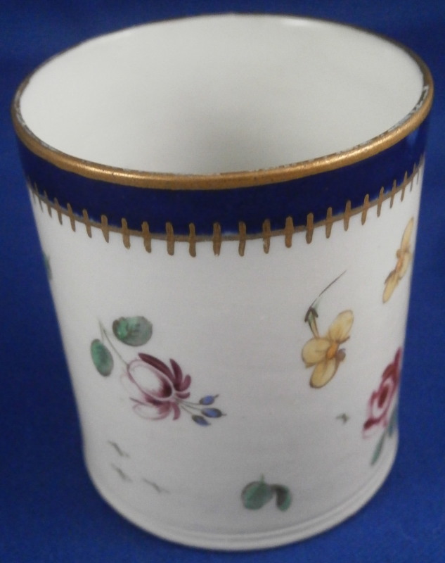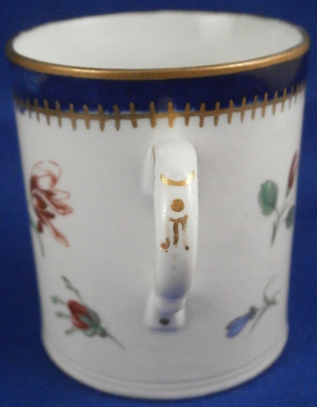 This is a cute little mug or coffee can made by Doccia in the 18th century. A nice example with their typical handle. The piece is hand painted with flowers all around as well as a nice blue and gold trim to the top and a relief ring to the bottom. The cup displays perfectly but when you shine a light through the bottom you can see a spider crack as shown. The bottom is unglazed and it is really hard to spot without the light. Otherwise is is perfect. The cup is unmarked but that is normal for their wares. It is just under 2.25 inches tall and 2 inches in diameter. Please email me for more information or other pictures.