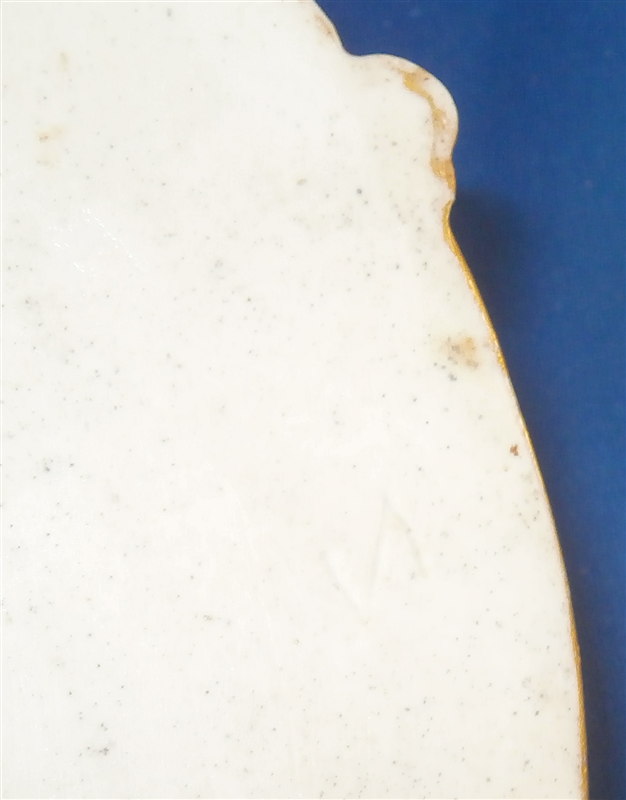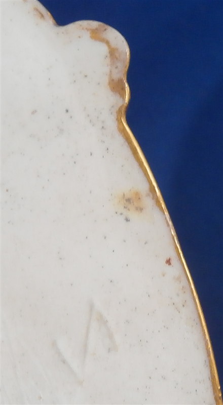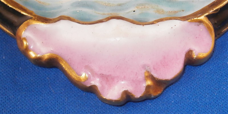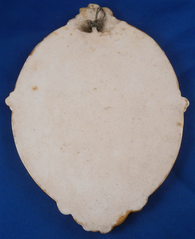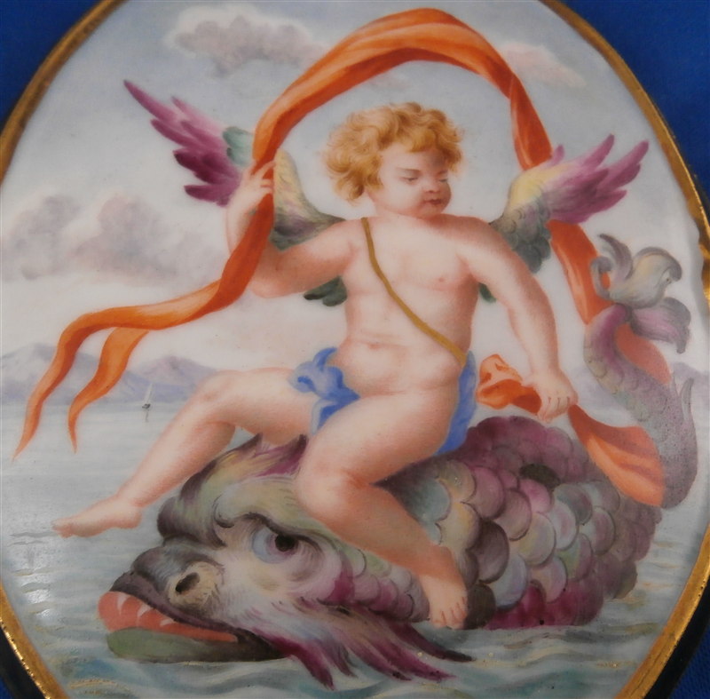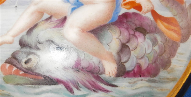 This is a superb porcelain plaque made by Doccia in the 18th century. An amazing piece with a scene in the center of a cherub riding a fish with a small sailboat in the background as well as some mountains. The scene is very detailed and the colors are the usual bright and lively once used by Doccia. The "frame" (it is all one piece of porcelain so tehre is no real frame) is painted in black with gold bands on either side and four shell like designs painted in pink shades. There are very few plaques that have survived by Doccia and this is a stunning example of their work! It is in superb condition with a small shallow chip to the back only on the right side of the hanging hole on top as shown. Doesn't show when on display! The piece is only marked with an incised Z but that is normal for Doccia. The piece is 0.5 inches thick, 7 inches tall and 5.25 inches wide. Please email me for more information or other pictures.