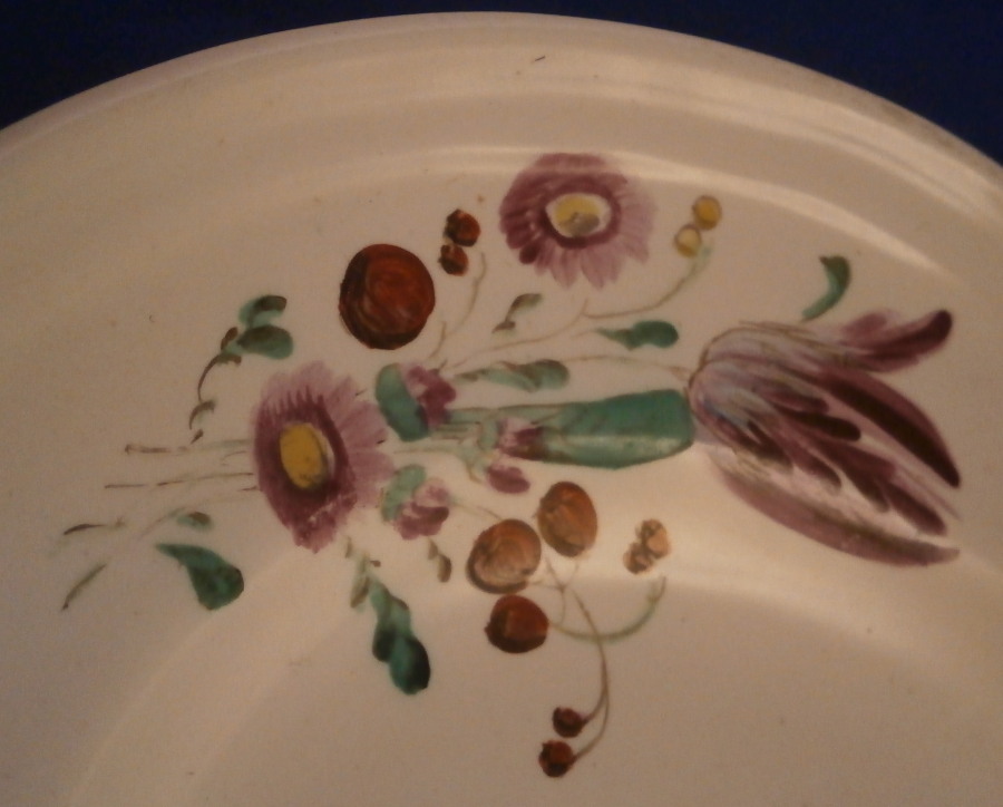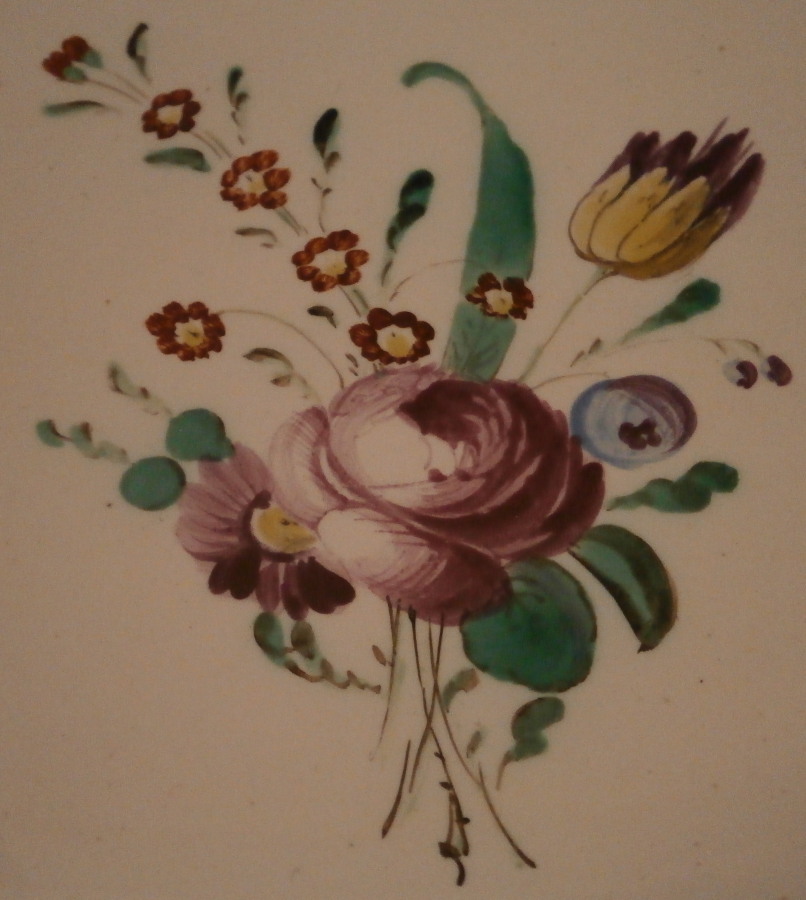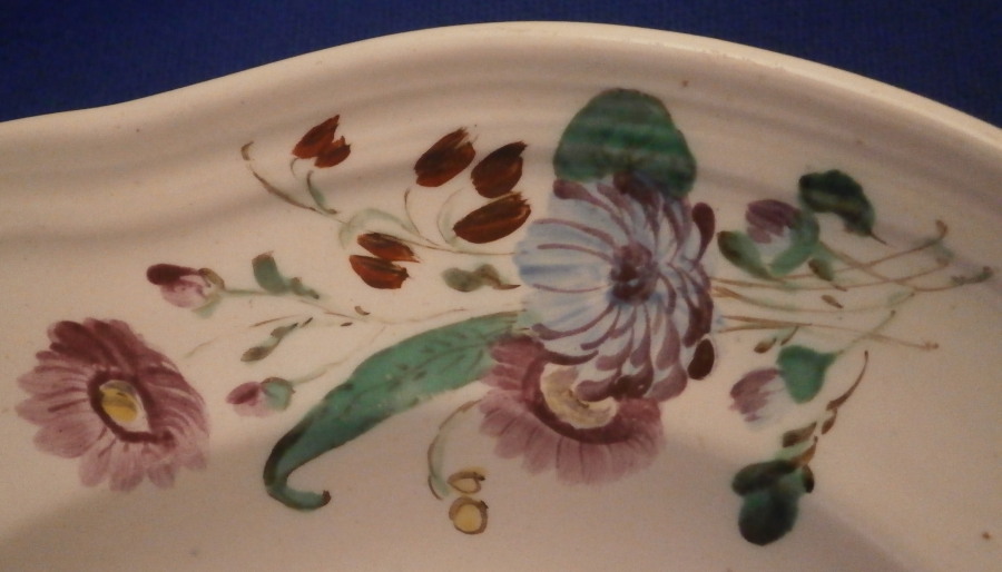 This is an oval serving plate made by Doccia / Ginori in about 1770. It is hand painted with three nice sized floral arrangements as well as three smaller single flowers. Nicely done in their typical style of the period and the plate has a relief design along the nicely shaped edge which makes it quite elegant. The plate is made with a tin glaze to cover the not so white porcelain paste of the time. This was used around 1770. The dish is in great condition with some minor manufacturing flaws mostly to the underside edge as shown - looks like something stuck to it during the firing but it does not affect the peice at all. It is unmarked but that is normal during this period. The piece is 1.25 inches tall, 9.625 inches wide and 7 inches deep. Please email me for more information or other pictures.