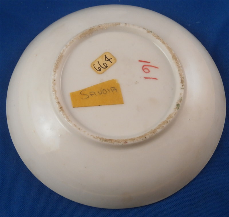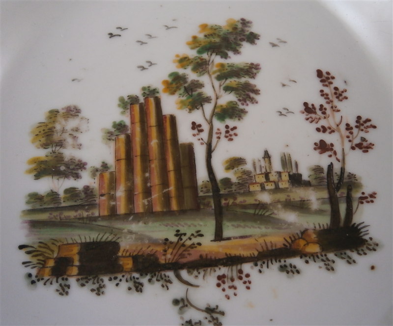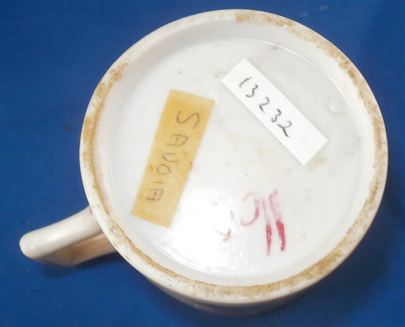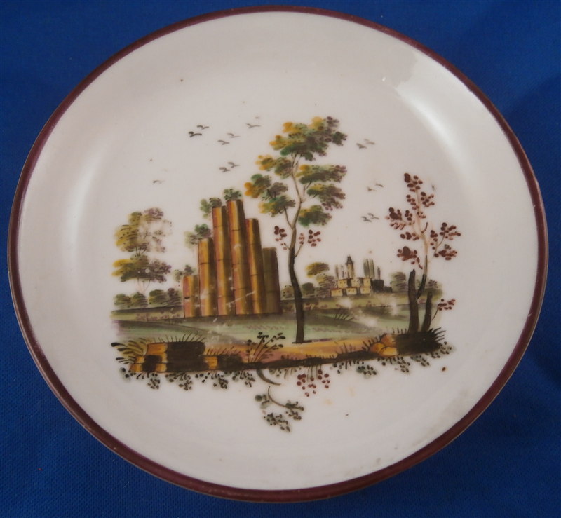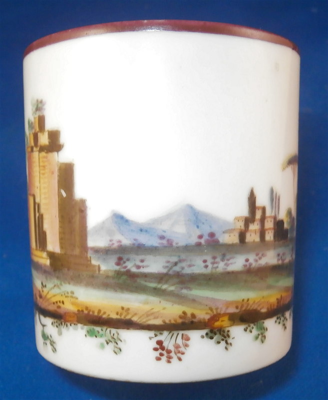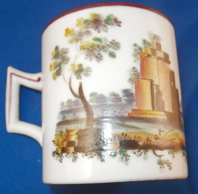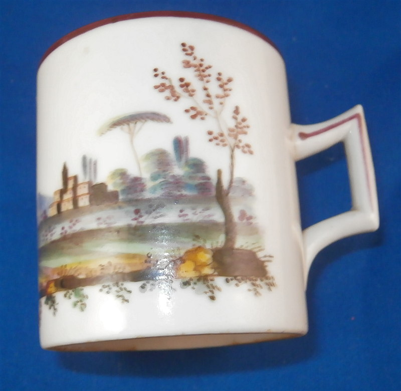This is a great coffee cup / can and saucer made by Doccia in the 18th century. An nice example that is superbly handpainted with a polychrome scene on the cup and on the saucer with a dark puce or purple trim to the rims and the handle of the cup. The handle is unusual for them as they had fancier ones most of the time. The cup is in perfect condition with one tiny spot of paint missing and the saucer has some wear to the scene. Both pieces are marked with letters - an impressed L on the saucer and an impressed G (I think) on the cup underside. The cup is 2.375 inches tall and 2.25 inches in diameter. The saucer is 0.875 inches tall and 4.875 inches in diameter. Please email me for more information or other pictures.
