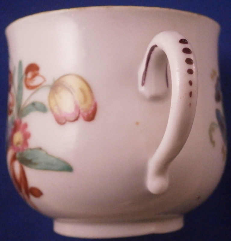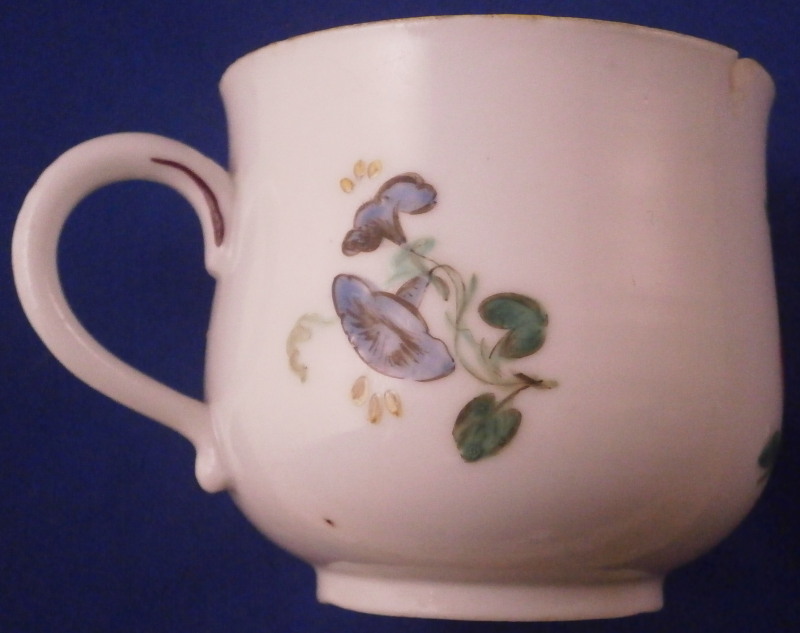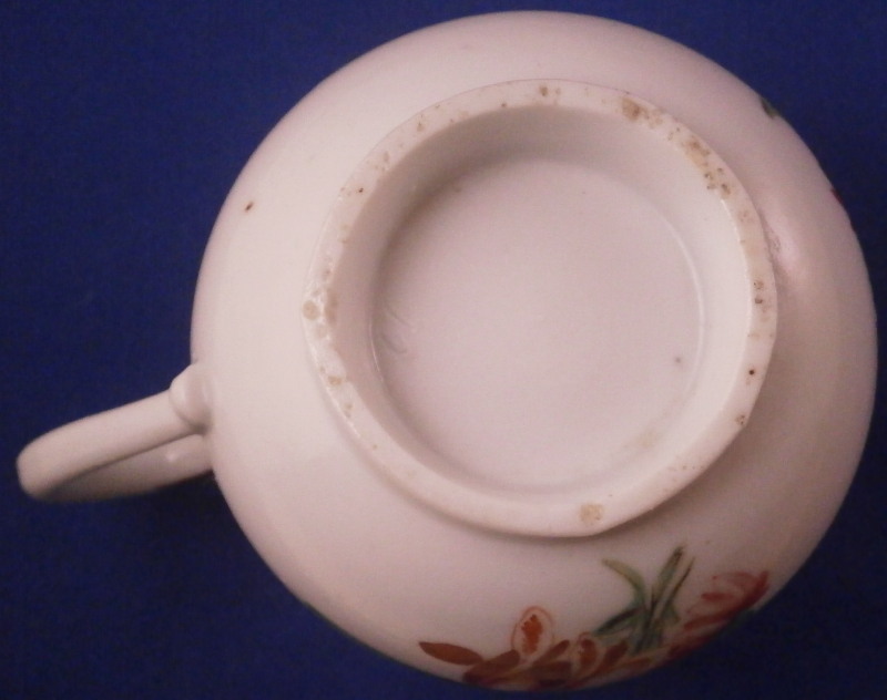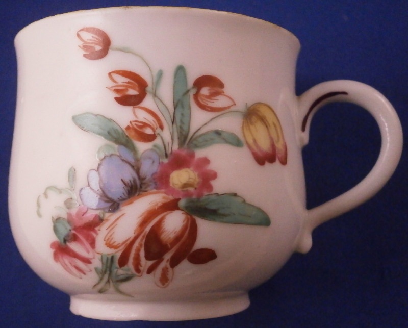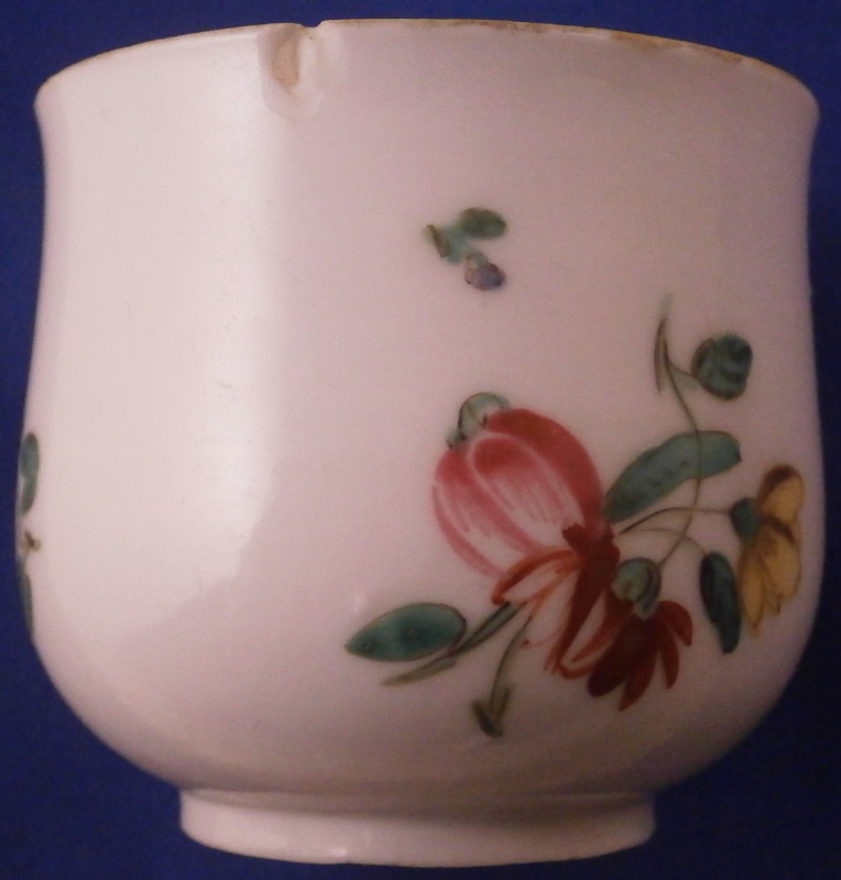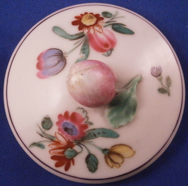 This is a great pot de creme cup or pot au jus with its lid used for either hot chocolate / custard or a meat broth made by Doccia in the 18th century. A very cute little cup that is hand painted with polychrome flowers - a larger arrangement to the one side with smaller flowers to the other and the lid and a nice fruit finial to the lid. I have not owned one of these by Doccia so it was nice to find it. The set displays nicely with a small chip to the top edge of the cup as shown as well as a tiny nibble to the edge of the lid which is mostly on the underside. The cup with its lid is 3 inches tall and 2.375 inches in diameter. Both are not marked underneath except for an incised mark under the cup but that is perfectly normal for this maker. The paste and flowers give it away easily. Please email me for more information or other pictures.