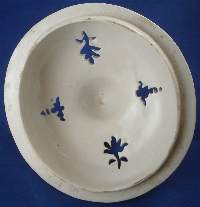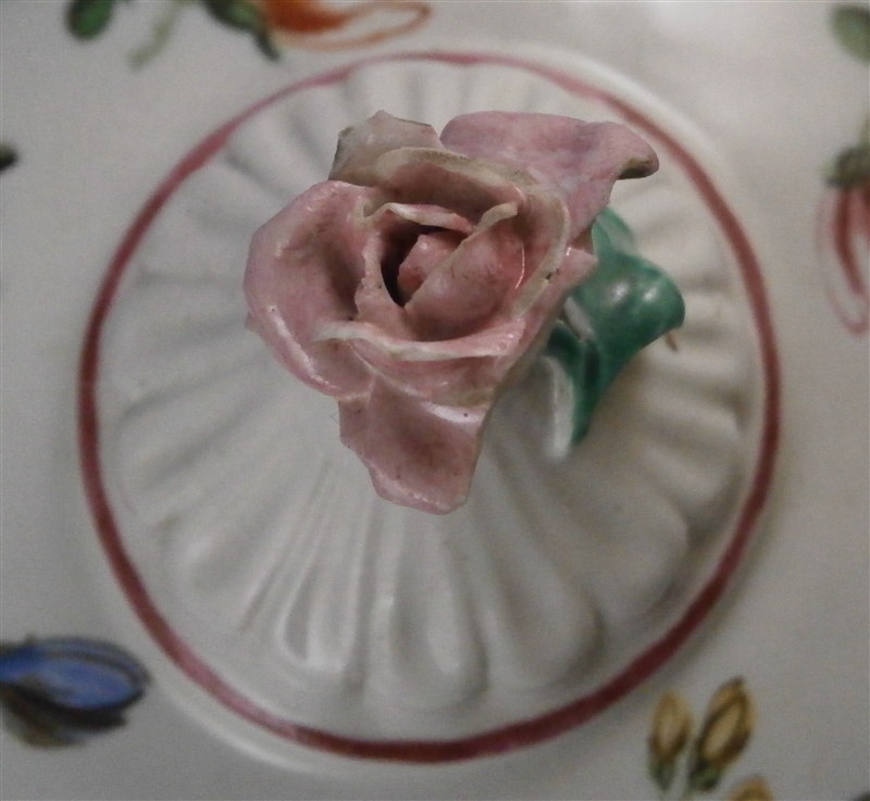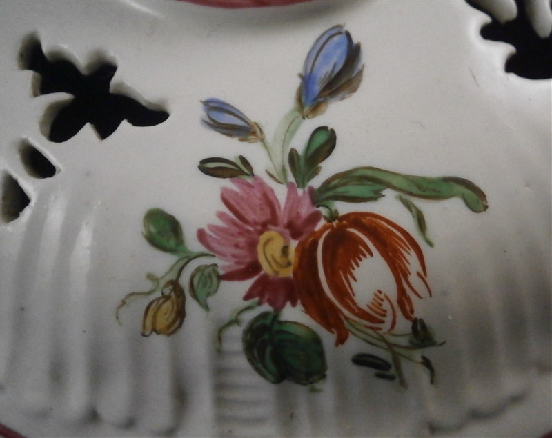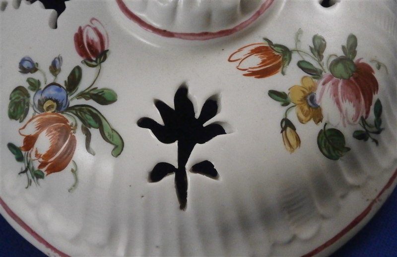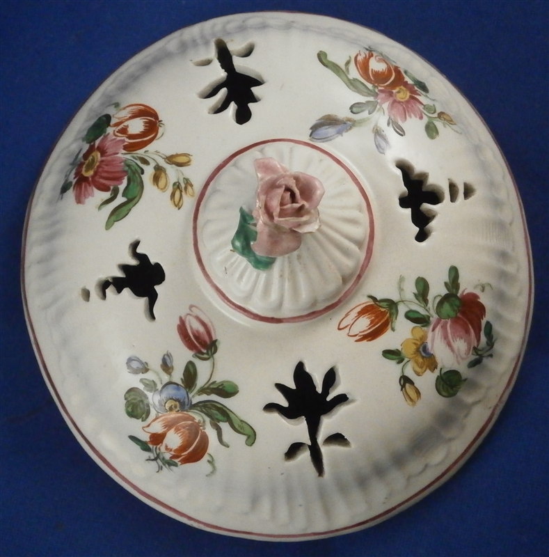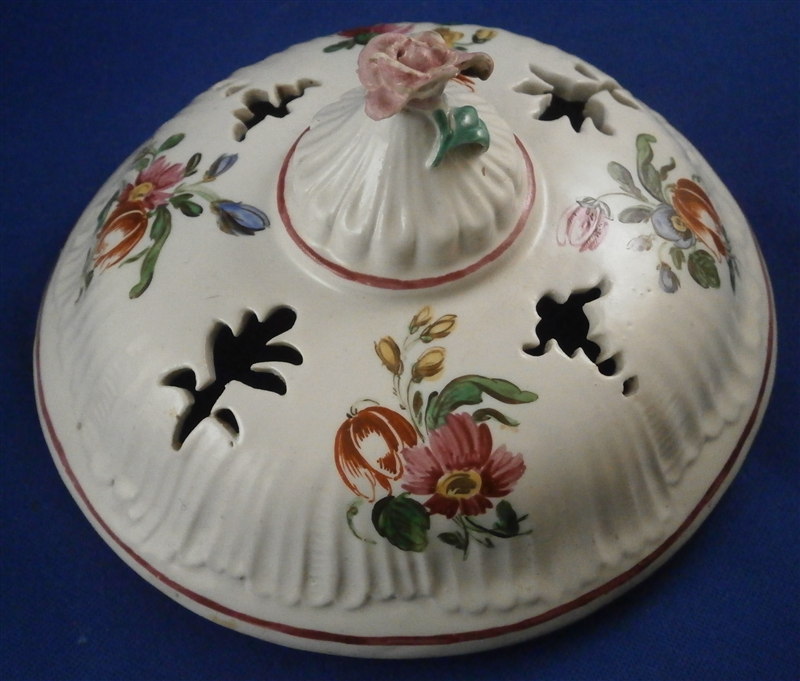 This is a lid for a potpourri dish made by Doccia / Ginori in about 1770. It is hand painted with four nice floral arrangements, has four pierced spots for the smell to come out of - two in the shape of flowers and two in a different design, a nice floral finial and some nice design along the side with puce trim to the edge and around the top part. The lid is made with a tin glaze to cover the not so white porcelain paste of the time. This was used around 1770. The piece is in great condition with a bit of damage to the finial. It is unmarked which would be normal and is a bit oval in size with the size of the ring that would sit inside the bottom part being 4.375 inches wide and 4 inches deep. The lid is about 2.5 inches tall. Please email me for more information or other pictures.
