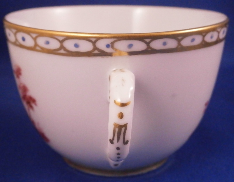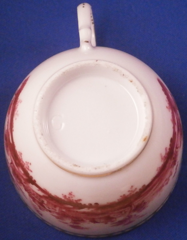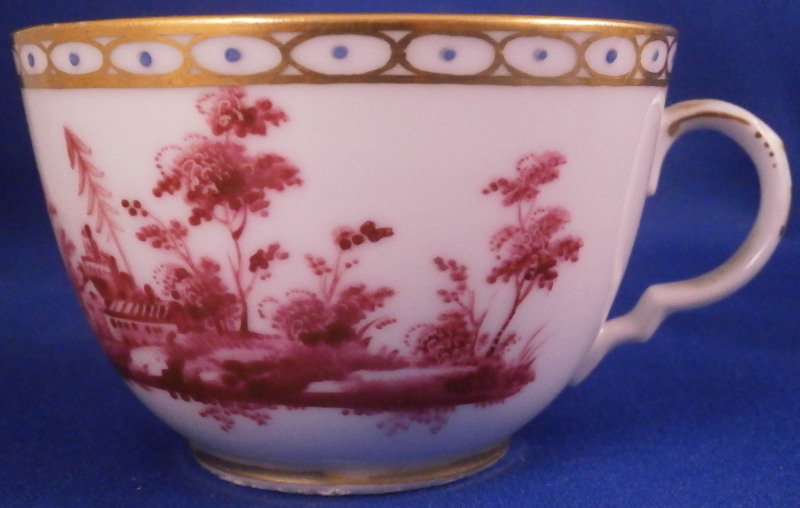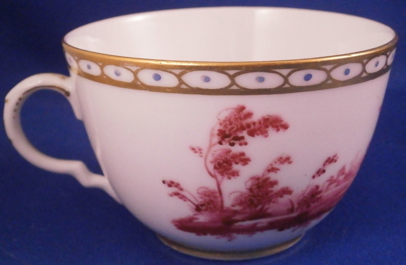 This is a superb scenic cup made by Doccia / Ginori in the later 18th century. It is hand painted with detailed landscape scene in puce and a blue and gold trim around the top edge with a simple gold trim around the bottom. Nicely shaped handle with a bit of gilding to it as well. A very typical design for this maker and very elegant. The scene is of very nice quality with lots of detail to it. The cup is in perfect condition but is sadly missing its saucer. It is marked with the rare impressed G mark as shown on the underside. The piece is just under 2 inches tall and 2.875 inches in diameter. Please email me for more information or other pictures.