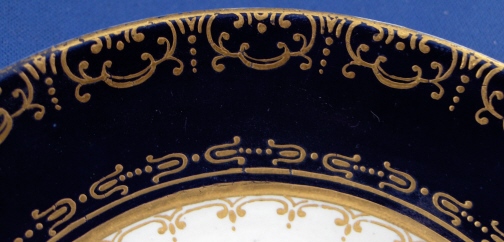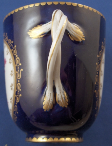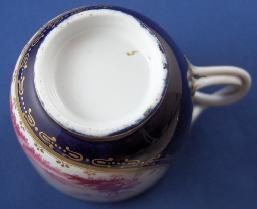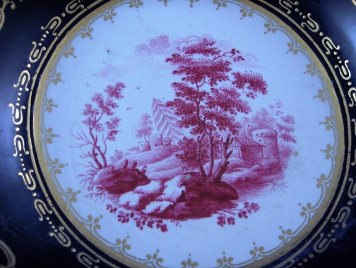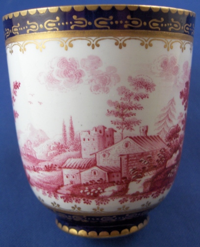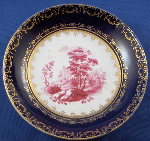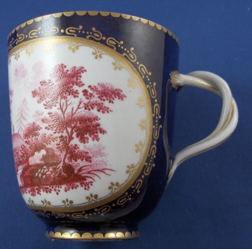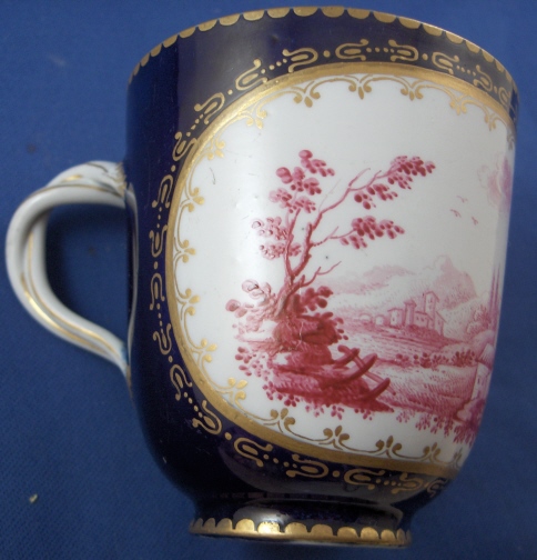 This is a rare scenic cup and saucer set made by Doccia in about 1770. Both are handpainted with a very detailed landscape scene in puce as well as a cobalt blue ground to fill in the other areas and a very nice gold trim. This is one of their best and most famous designs and a new favorite of mine! The set is in perfect condition with a little wear to the gilding on the saucer rim! Both are unmarked except for a gilt mark underneath the cup which is very common but they are definitely made by them. The saucer is 1.125 inches tall and 5.25 inches in diameter. The cup is 2.875 inches tall and 2.625 inches in diameter. Please email me for more information or other pictures.