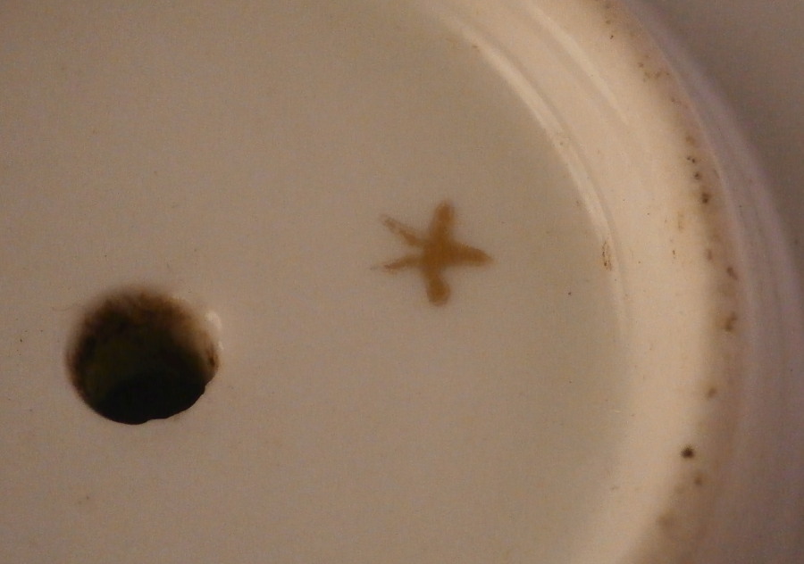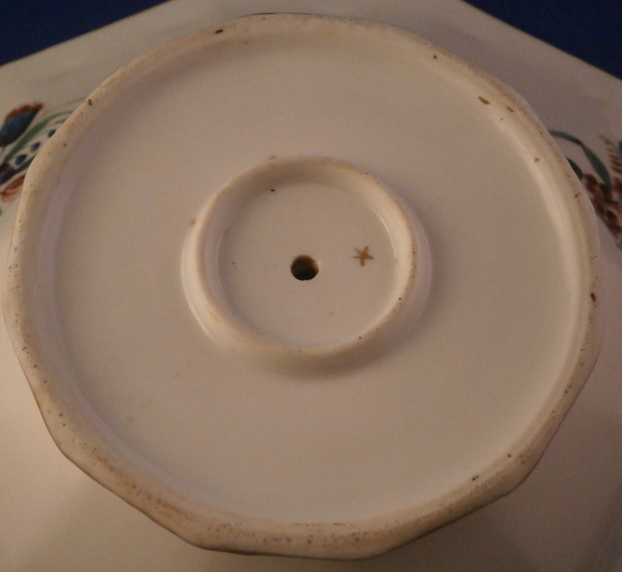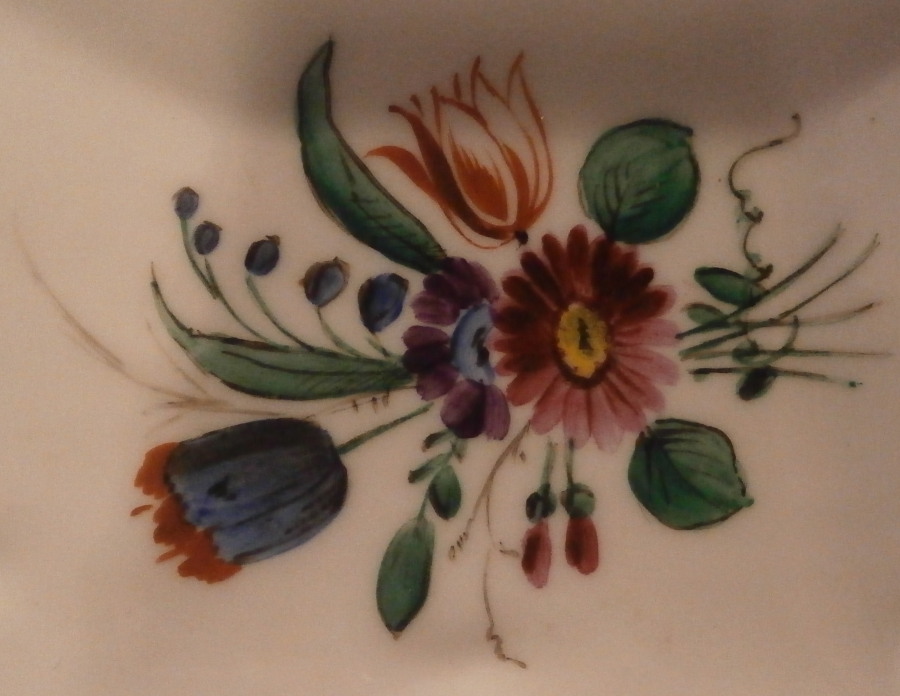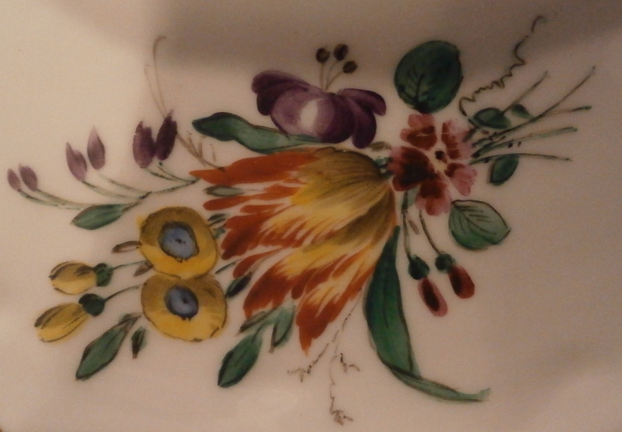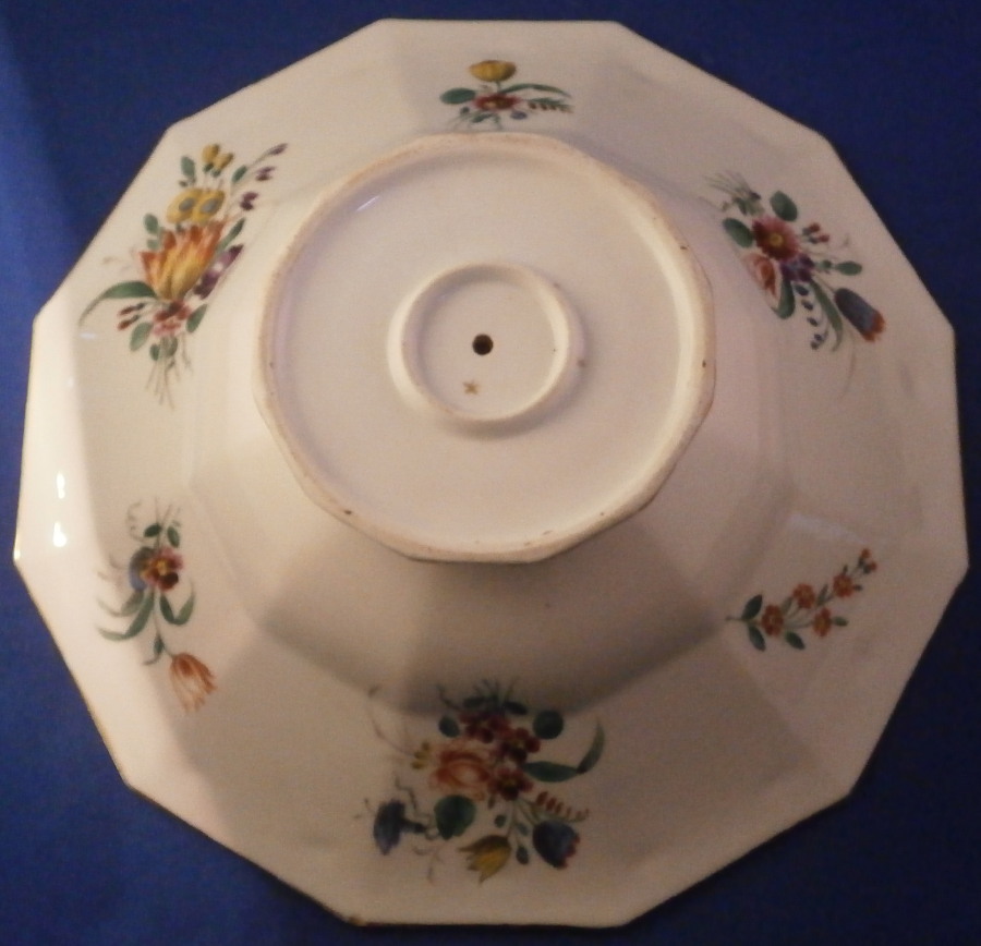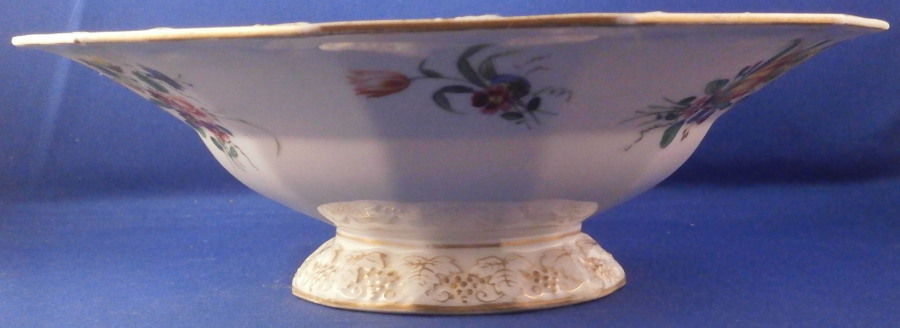 This is a rare pedestal dish made by Doccia / Ginori in the 18th century. It has a nie shape to it with the bowl part sitting on a small foot with both the edge of the bowl and foot having a relief design of grapevines highlighted with gilding. The inside of the bowl is hand painted with detailed scenes in puce, on one side is a couple in a landscape surrounding and on the other a smaller landscape scene including a building with two small scenes in between. The scenes are really nice and one does not come across them from this maker and period often at all. What makes it even nicer is the fact that on the underside of the bowl part there are three large polychrome floral arrangment and three snaller ones hand painted. I have not seen this type of dish by them before and it is very nice! The footed dish is in great condition with some wear to the gilding and a small underside edge chip as shown. It is marked with their gold star mark to the underside as shown. The piece is 3 inches tall and 9.625 inches max in diameter. Please email me for more information or other pictures.