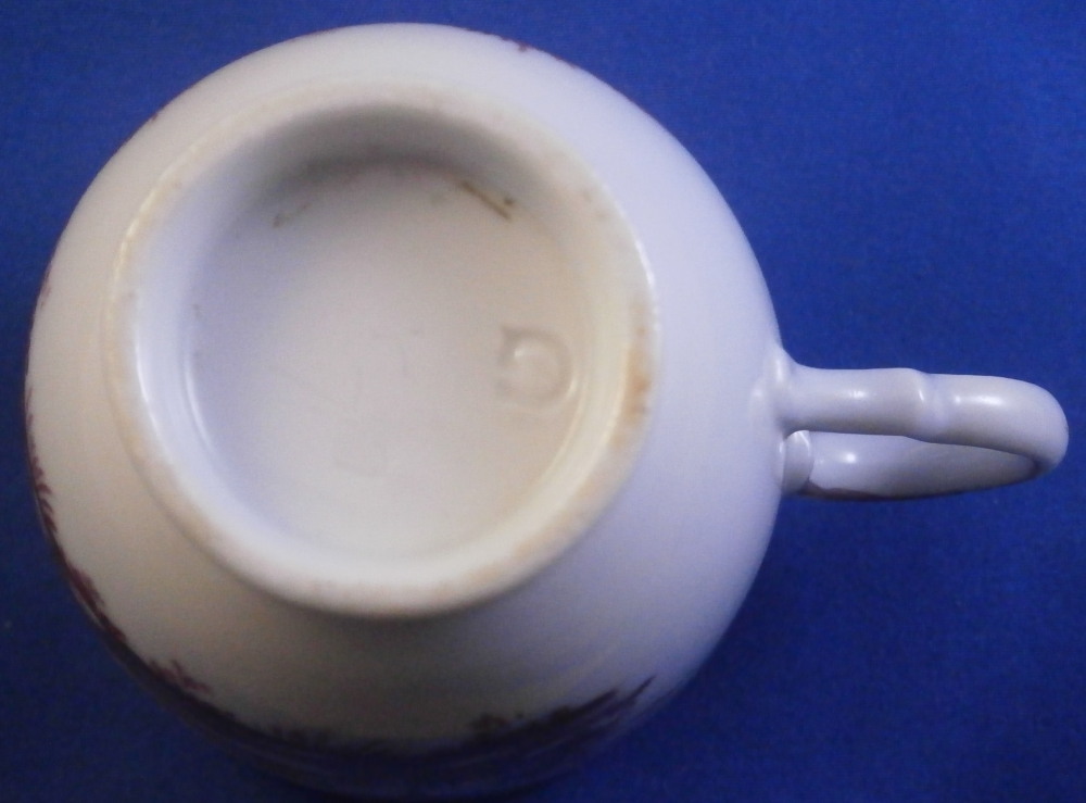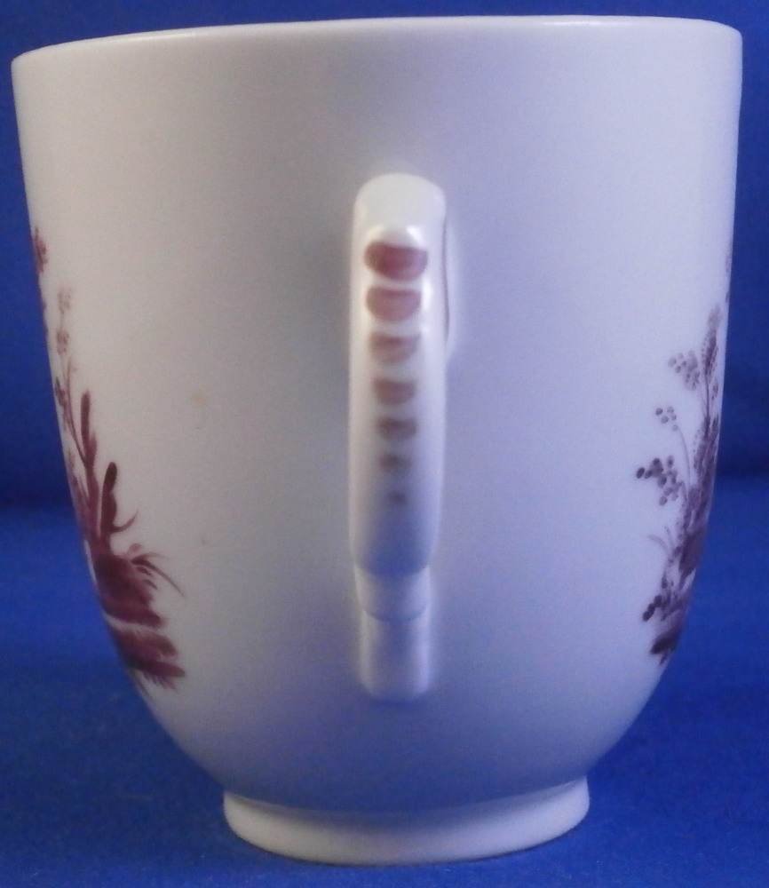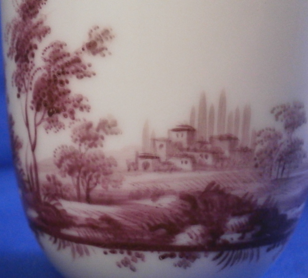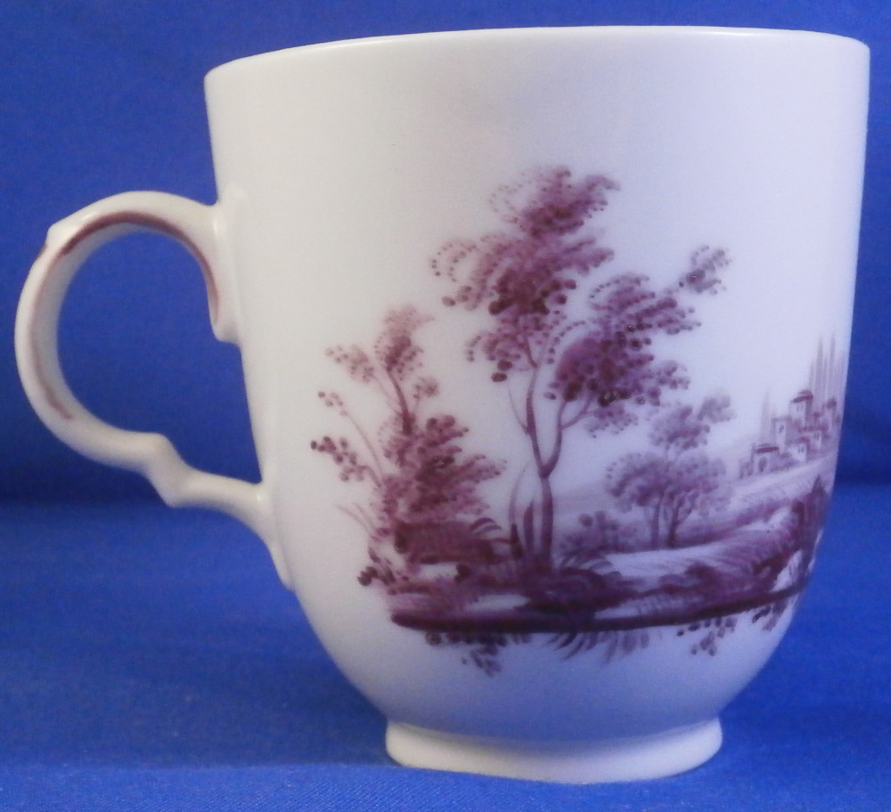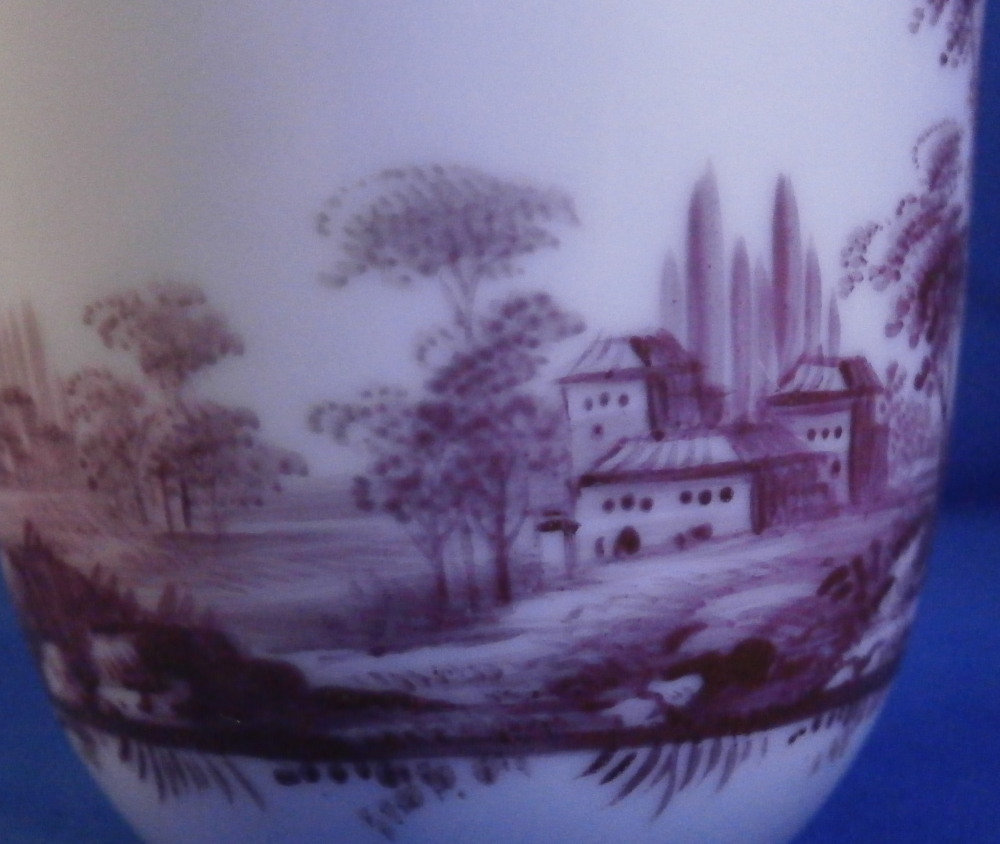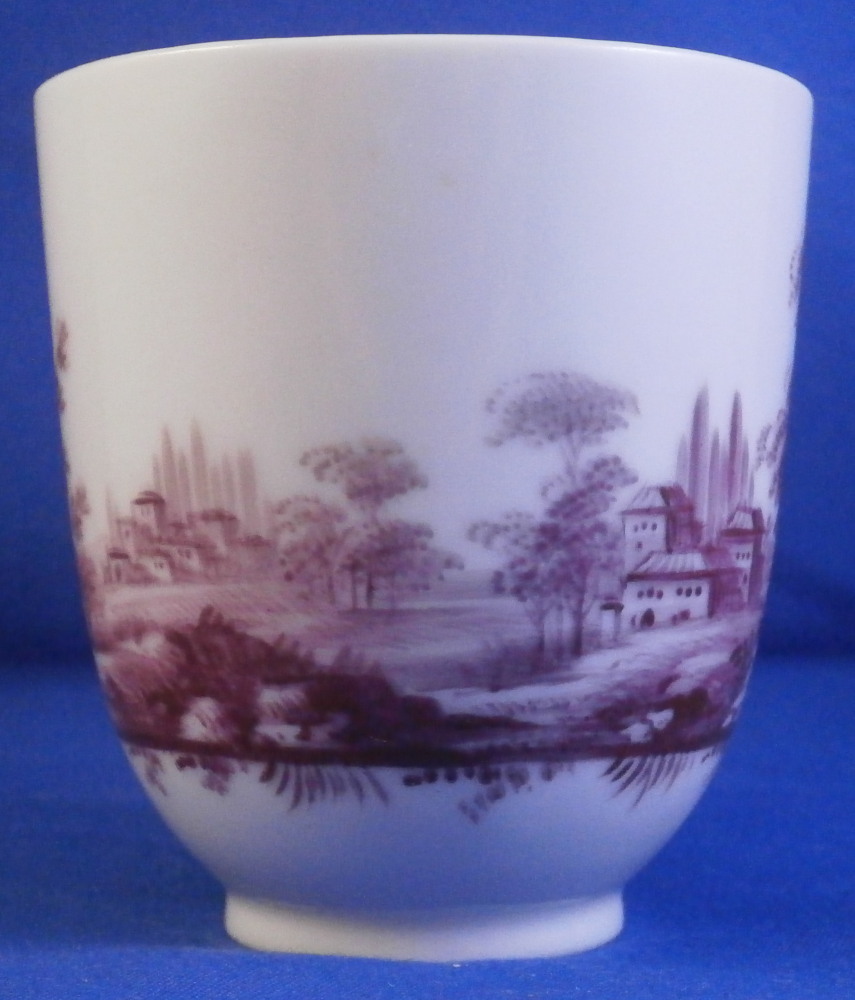 This is a nice scenic cup made by Doccia / Ginori in the 18th century. It is hand painted with detailed scene in puce covering 2/3 of the outside with a nicely shaped handle typical for this maker in the empty space. Puce trim to the handle. The scene is of very nice quality including buildings in a landscape surrounding with lots of details. A very typical design for this maker and very elegant plus not something one finds often at all. The cup is in perfect condition. It is marked only with an impressed letter G which is pretty normal for this maker! The piece is 2.625 inches tall and 2.375 inches in diameter. Please email me for more information or other pictures.