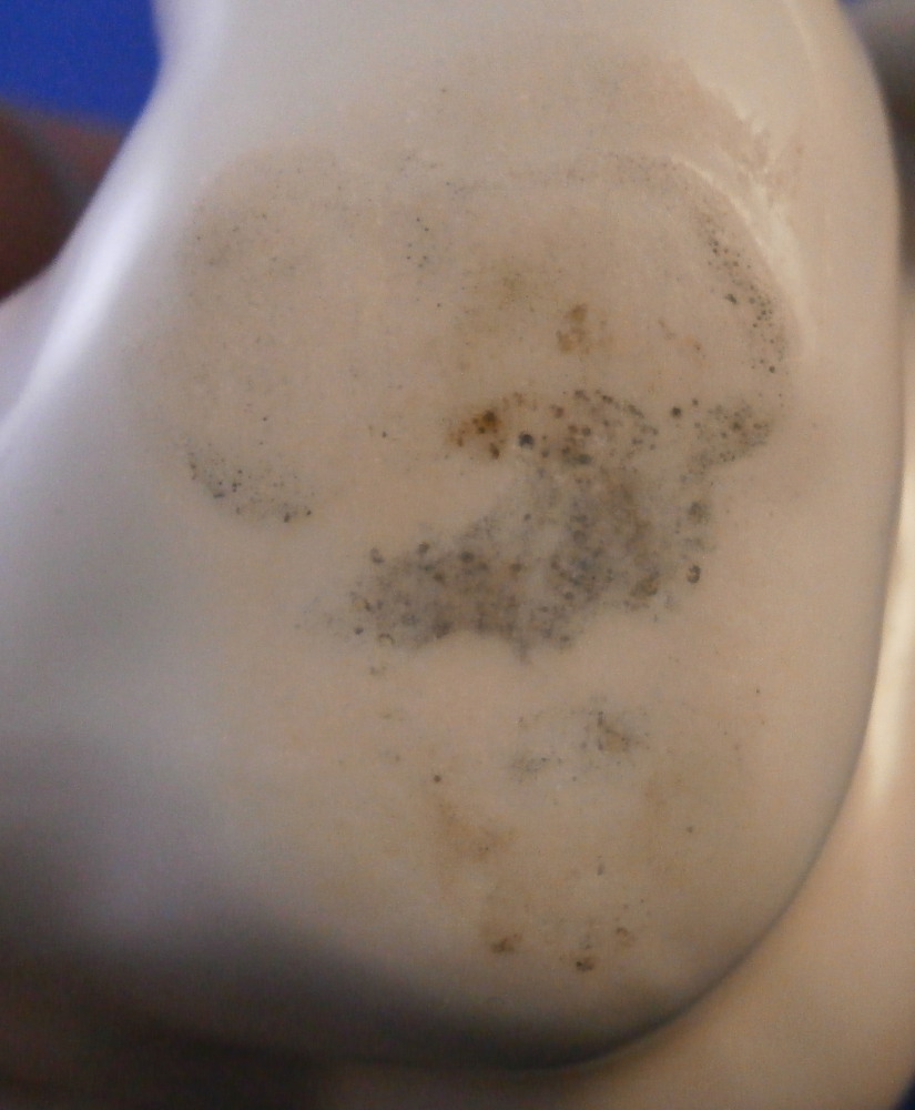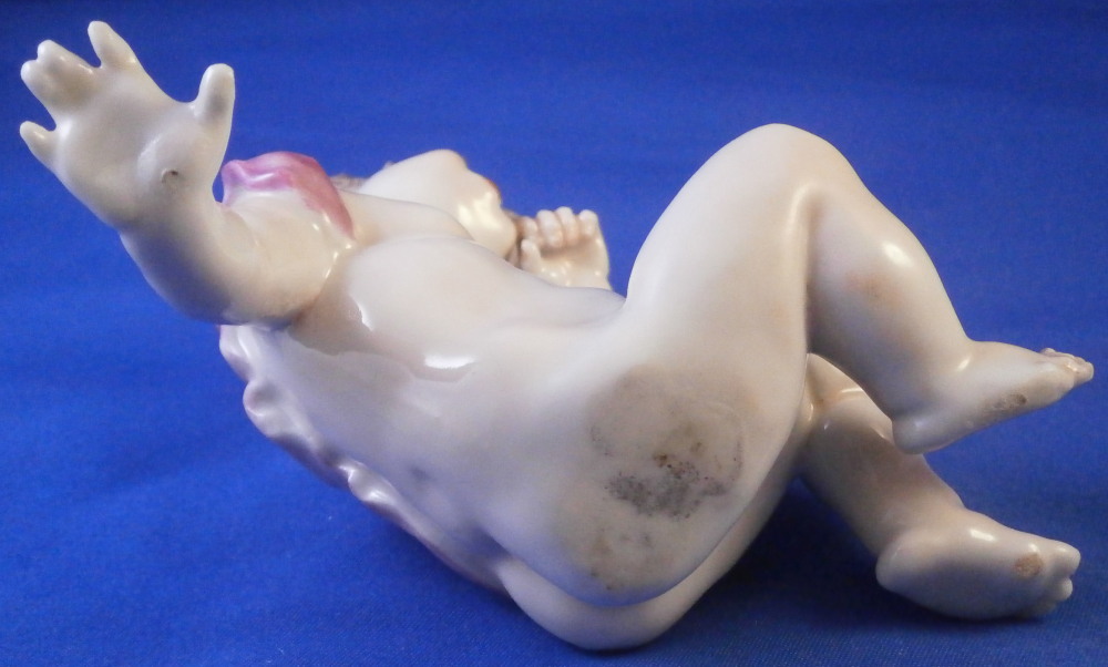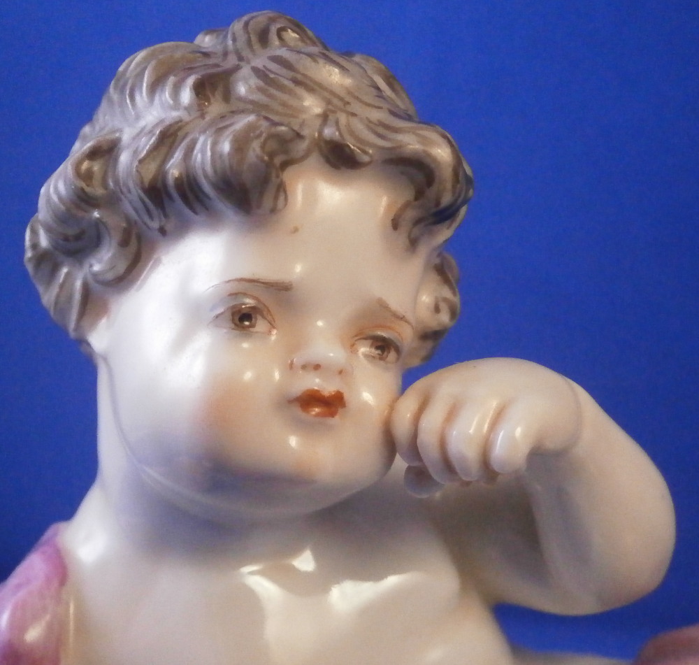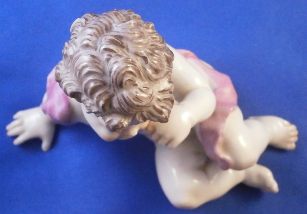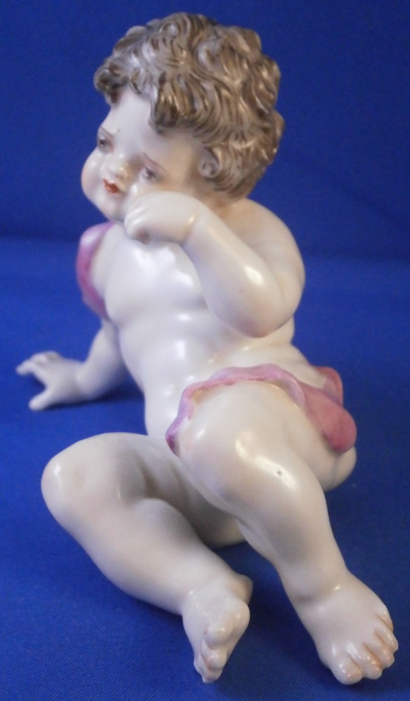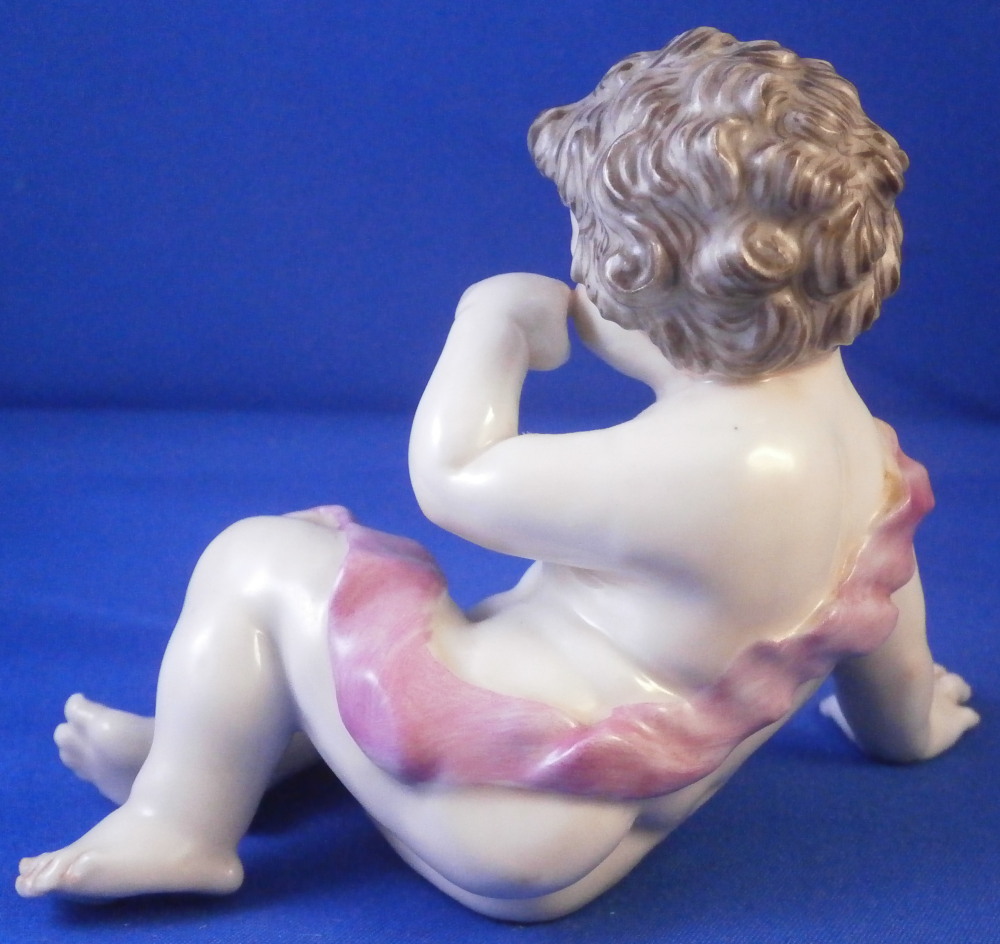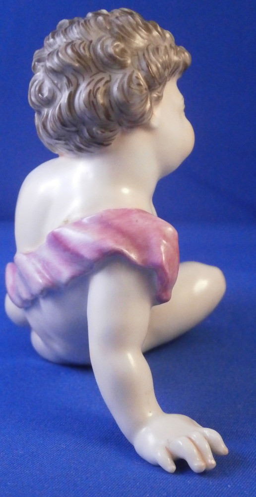 This is a fun figurine made by Doccia in the 19th century. Not sure exactly when but probably toward the later part. The figure is not one I have come across before but certainly worthy of this great maker. It is of a putto sitting down with the right hand on the ground supporting himself and the left hand wiping away a tear. A sad facial expression! He is nude except for a pink band. A very detailed figurine that is hand painted to perfection! The figurine is in perfect condtion. Unmarked underneath but there is not much rom so I don't think it is an early 19th century piece though I might be wrong. The piece is 3.25 inches tall, 4.5 inches wide and 2.25 inches deep. Please email me for more information or other pictures.