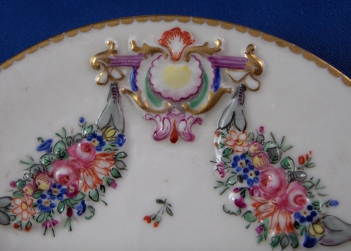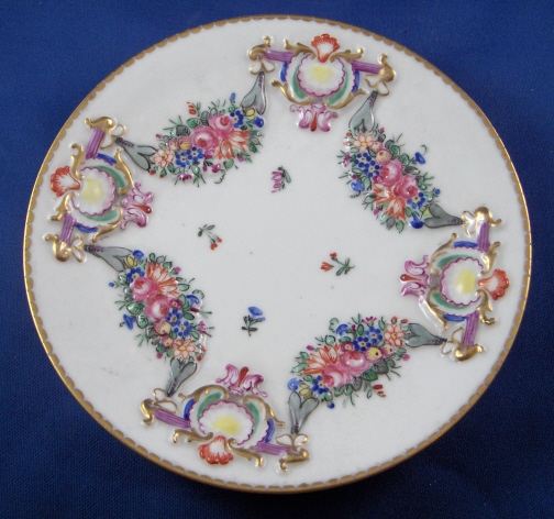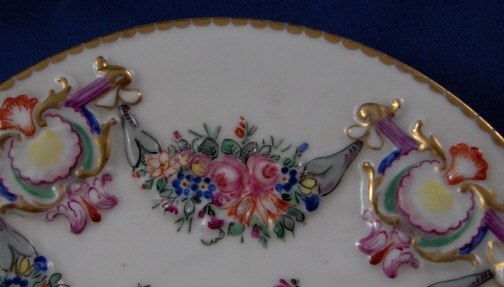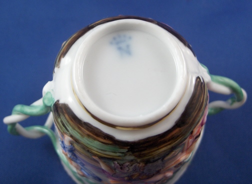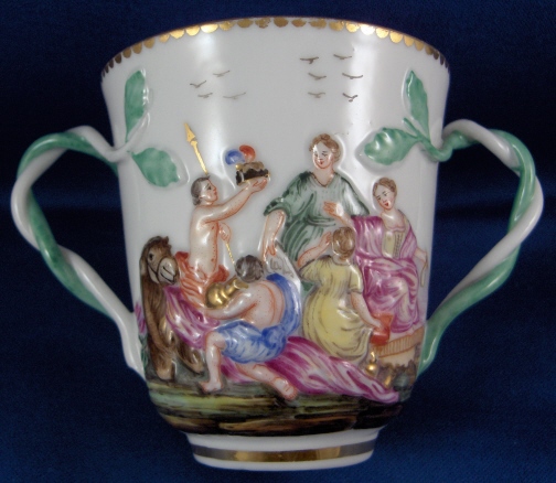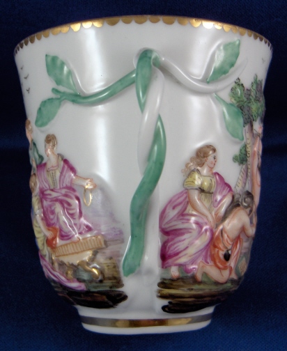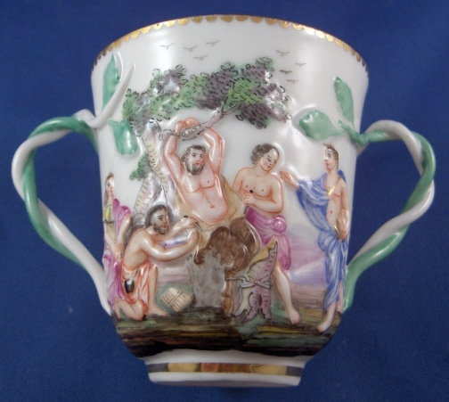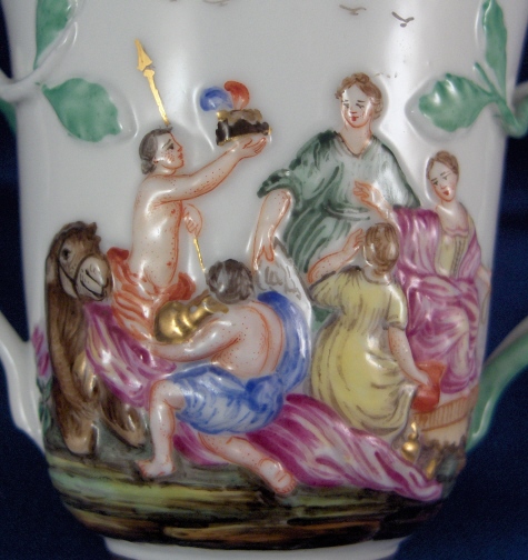This is a great cup and saucer made by Doccia / Ginori in the late 18th or early 19th century. The cup is decorated with biblical or mythological scenes in relief all around that are handpainted very nicely. It has two twisted branch handles with leaves at the ends and the saucer is decorated with floral garlands connected by a nice shell design. Nice gold trim to the rims. The set is in perfect condition with some flaws from the making like tiny firing cracks and a bumpy underside of the saucer where the paste wasn't perfectly made. Both pieces are marked with an incised 7 as well as the crown over N mark copied so often by other makers from this original. The cup is just over 3 inches tall and about 2.875 inches in diameter. The saucer is 0.875 inches tall and 5.625 inches in diameter. There is a rough ring on the very top inside of the cup so it might have had a lid at some point but displays perfect without it. Please email me for more information or other pictures.