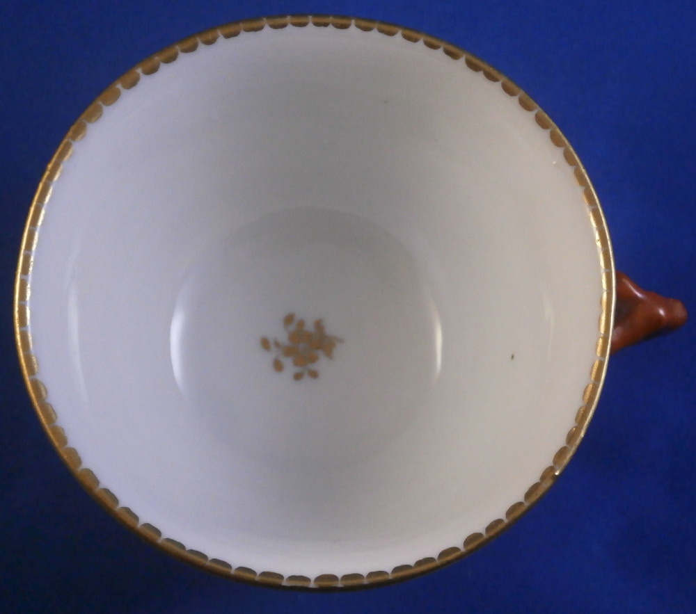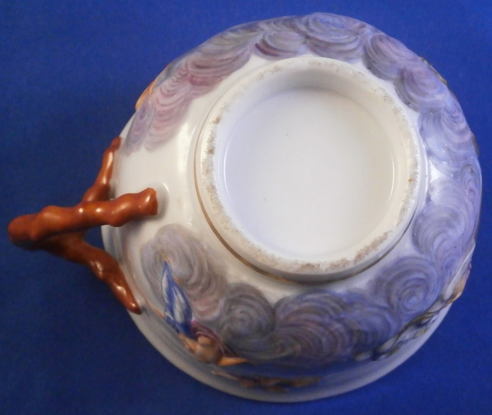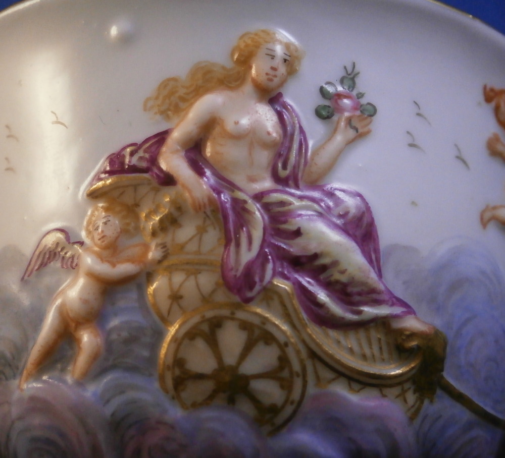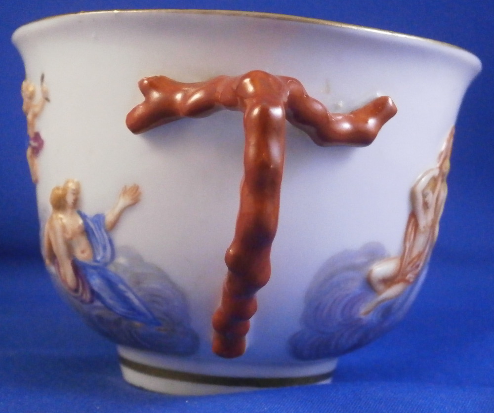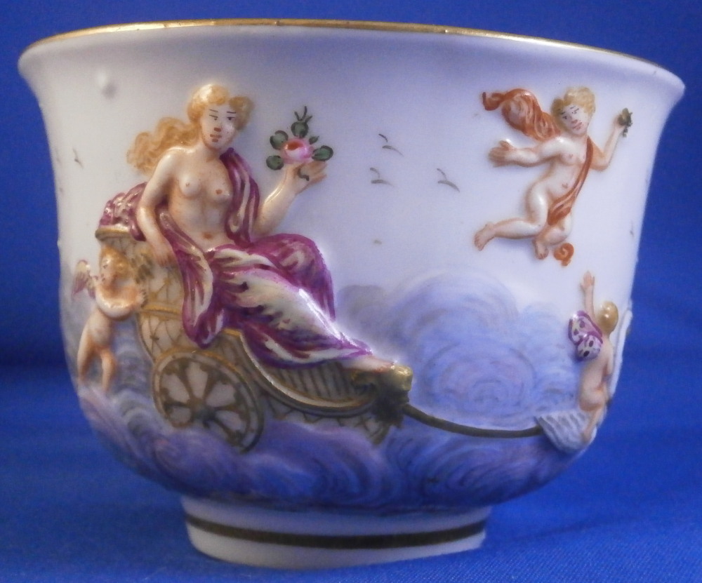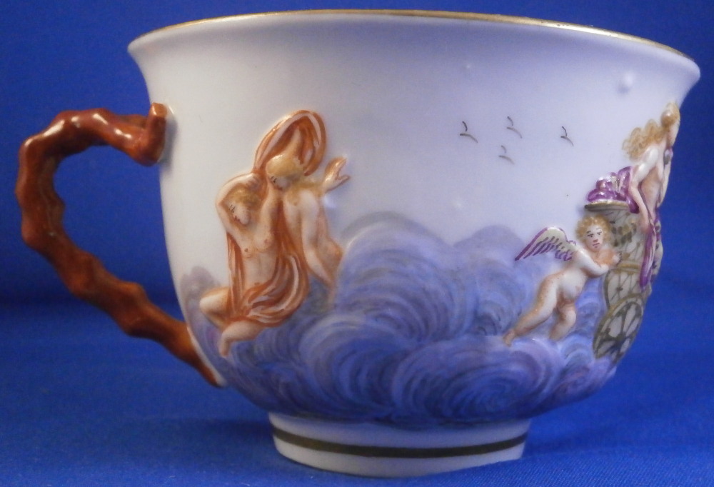 This is a really nice early cup and saucer set made by Doccia in Italy in the late 18th or early 19th century.The cup is decorated with a relief design all around including Venus riding in a carriage on clouds pulled by a pair of swans with a putto. Some other nude ladies and more putti / cherubs fill in the rest of the space. Red corral branch handle and gold trim to the top and bottom. The saucer is decorated with a relief design of floral garlands held up by angels / cherubs. The design is hand painted very nicely and there is a gold trim to the edge. Four scattered small flowers in the center as well as a tiny leaf. The cup & saucer are in superb condition with a minor touch of wear to a flower or two on the saucer and some extra spots of porcelain paste (over the Venus carriage is an example that can be seen i the pcitures. Some minor flaws are to be expected on these early pieces. Both are unmarked normal on their earlier wares. The saucer is 1 inch tall and 5.375 inches in diameter. The cup is 2.5 inches tall with a diameter of 3.5 inches so a nice large example. Please email me for more information or other pictures.