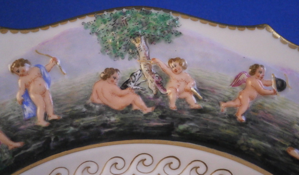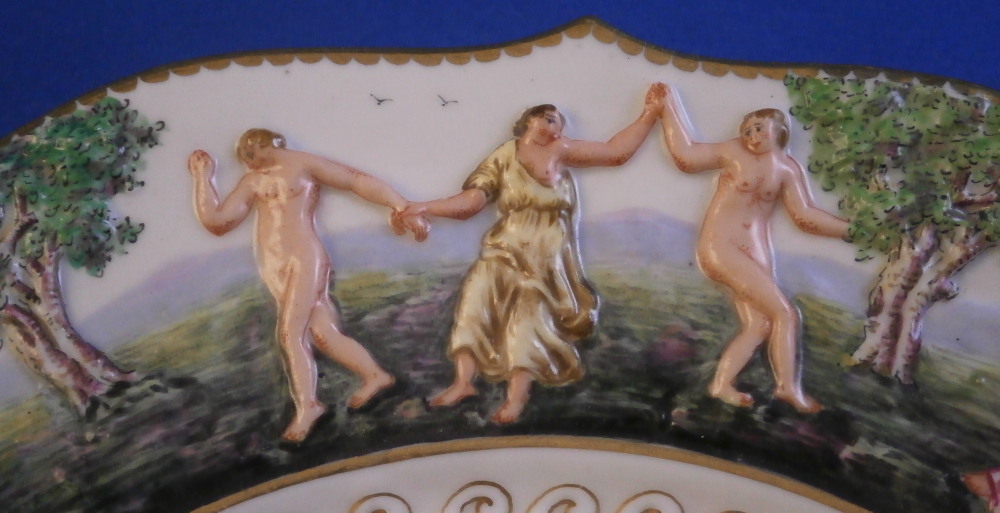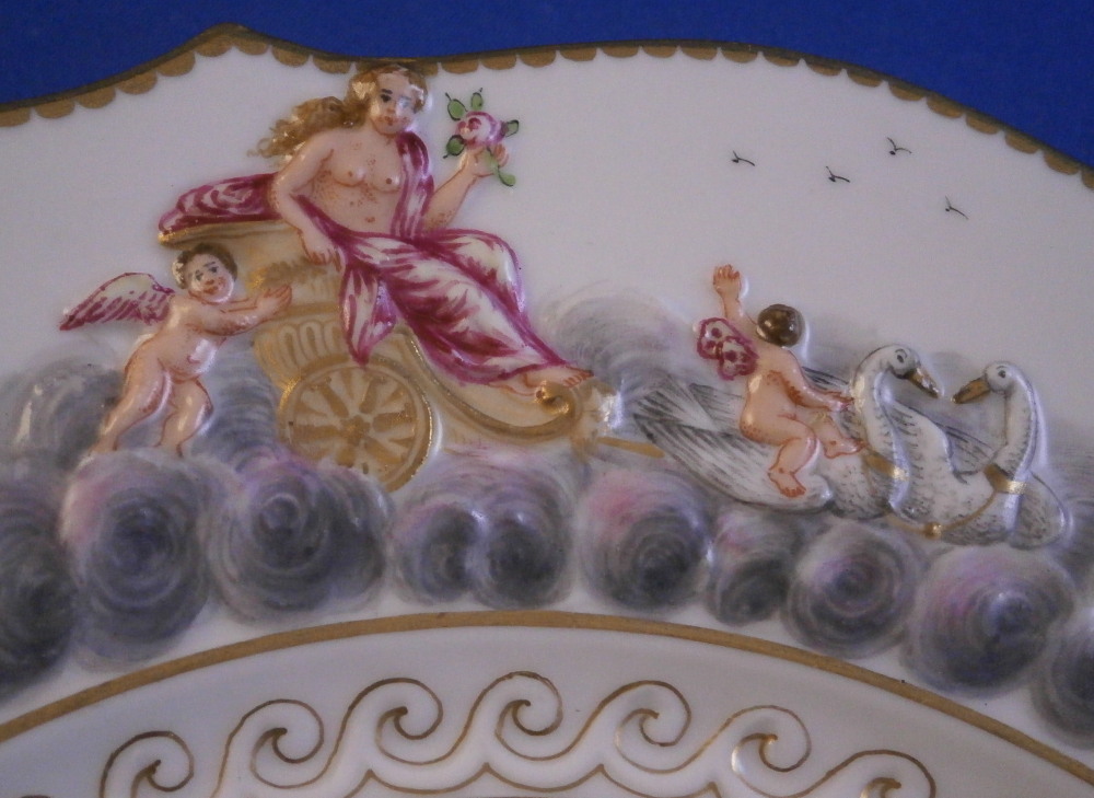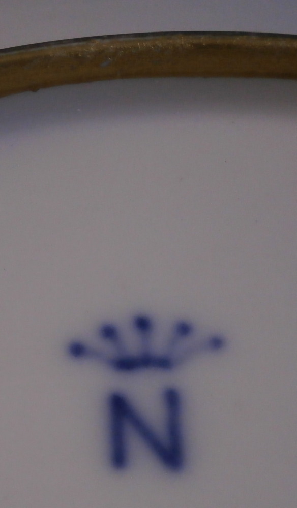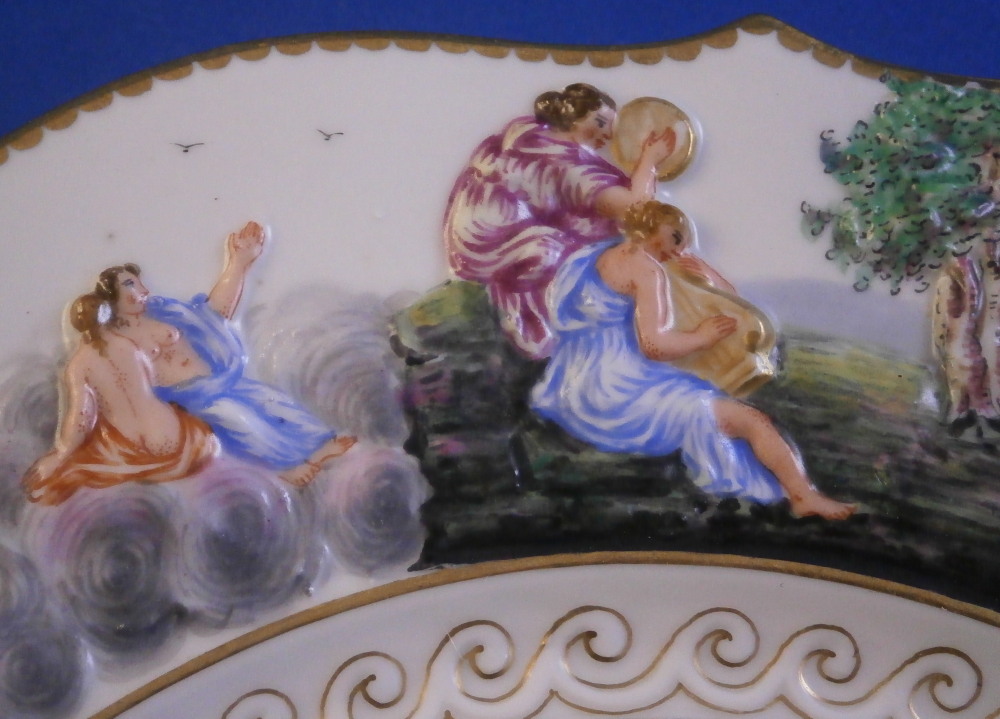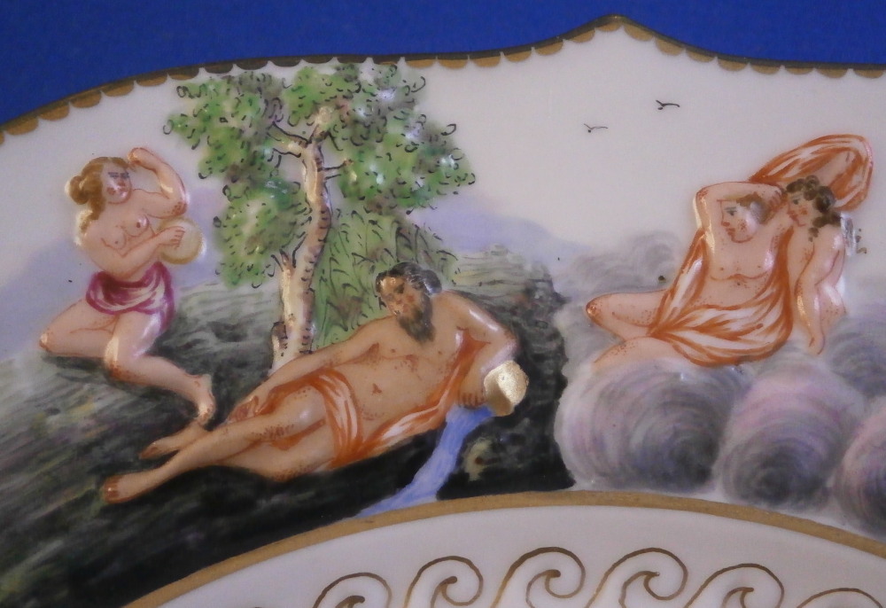 This is a fun plate made by Doccia / Ginori in the later 19th century. One rarely ever sees plates in this style and judging by the gold foot ring which was generally reserved for very important pieces it must be rather special. I also think these are some of the most fun plates around and one could actually use them since the center is not decorated except for a gold flower in the very middle. The plate is superbly decorated with raised relief mythological / biblical scenes all along the rim that are quite detailed and very well hand painted. Nice gold trim to the edge and around the outside of the well which has a relief wave type design to it. The piece is in perfect condition. The plate is 1.125 inches tall and has a diameter of 8.75 inches. It is marked with their under glaze blue crown over the letter N underneath as shown. Please email me for more information or other pictures.