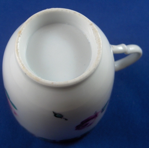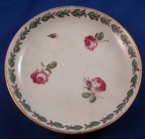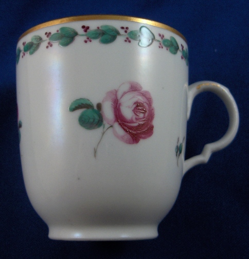This is a cup and saucer made by Doccia in the 18th century. The set is handpainted with three rose flowers, a rose bud and a ring of leaves around the rim as well as a gold trim. This pattern is called the Amalfi pattern. Good quality as one expects from a top maker. The cup handle also has some gilding on it and is the typical shape for Doccia. The set is in great condition with a little wear mostly to the gold trim. The cup is not marked but the saucer has an incised mark that looks like an omega symbol. No doubt about of these being from Doccia as the flowers and paste are typical and unquestionably made by them. The cup is 2.75 inches tall and 2.5 inches in diameter. The saucer is 0.875 inches tall and 5.125 inches in diameter. Please email me for more information or other pictures.