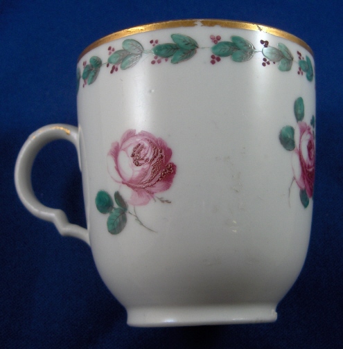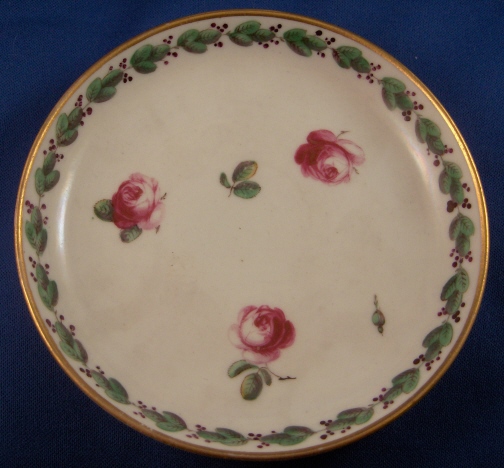 This is another cup and saucer made by Doccia in the 18th century. The set is handpainted with three rose flowers, a rose bud and a ring of leaves around the rim as well as a gold trim. This pattern is called the Amalfi pattern. Good quality as one expects from a top maker. The cup handle also has some gilding on it and is the typical shape for Doccia. The set is in great condition with very little wear at all. Neither piece is marked but there is no doubt about of these being from Doccia as the flowers and paste are typical and unquestionably made by them. The cup is 2.75 inches tall and 2.5 inches in diameter. The saucer is 0.875 inches tall and 5 inches in diameter. Please email me for more information or other pictures.