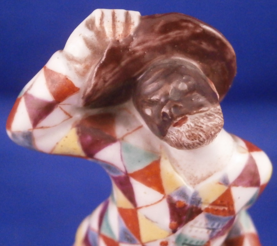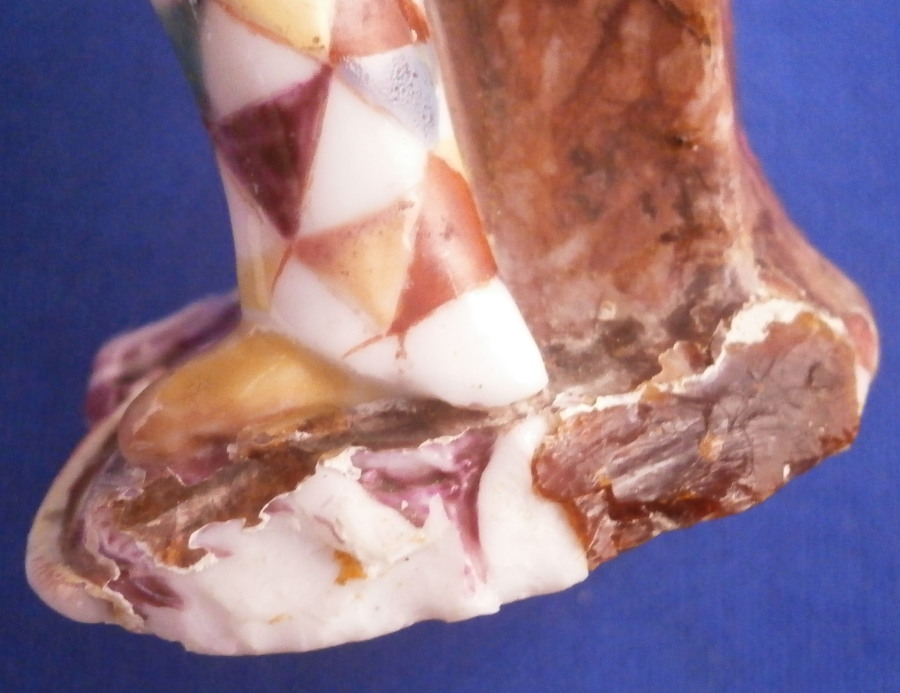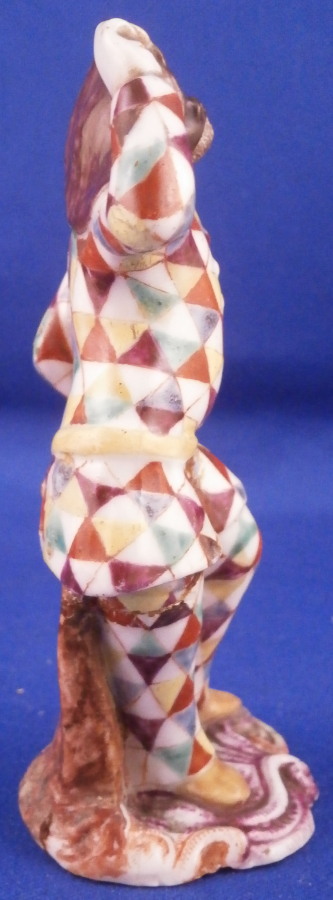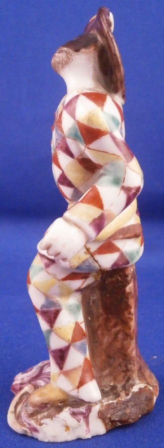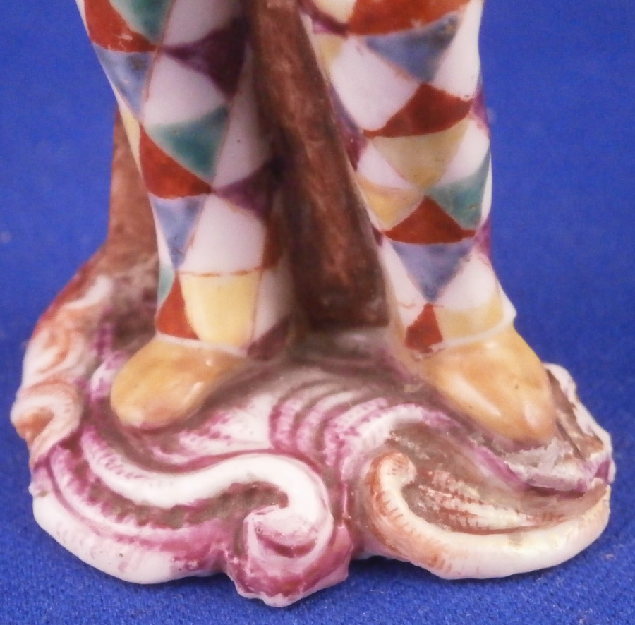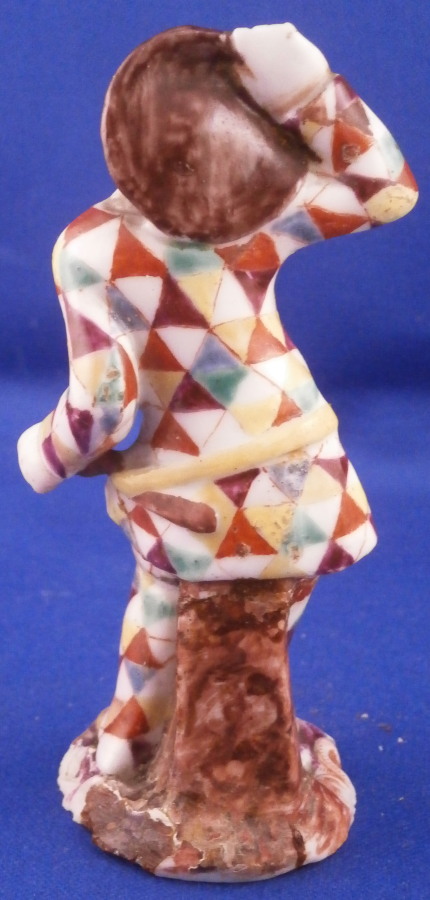 This is an amazing and very rare figurine made by Doccia in about 1755. It is one of the figures from probably the most famous group of figurines int he world of porcelain - the commedia dell'arte or Italian comedy which is definitely a favorite of mine. The figure here is of Harlequin ( Arlecchino ) who is the best-known of the zanni or comic servant characters from the Italian commedia dell arte. The Harlequin is characterized by his chequered costume and his role is that of a light-hearted, nimble, and astute servant, often acting to thwart the plans of his master, and pursuing his own love interest, Columbina, with wit and resourcefulness, often competing with the sterner and melancholic Pierrot. The figure is superbly modeled with the typical colorful shirt and pants and the club in his hand while standing on a typical very early doccia base with colorful scrolls. As early as they come and as rare and fun as they get! He displays nicely but as one would expect there is damage. He was broken in half through part of the waist and then across the other top leg. The tip of his club is missing and there is damage to the side of the base and a line to the udnerside which crept up one side. Nothing too bad and would be a fairly easy job for a good restorer which I will probably have done since he is definitely worth the time and money involved in that! The figurine is unmarked which is not unusual except for the incised number 4 underneath as shown! The figure is 4 inches tall, 1.875 inches wide and 1.625 inches deep. Please email me for more information or other pictures.