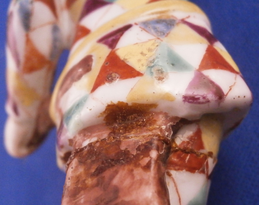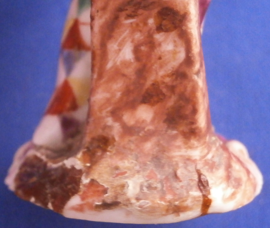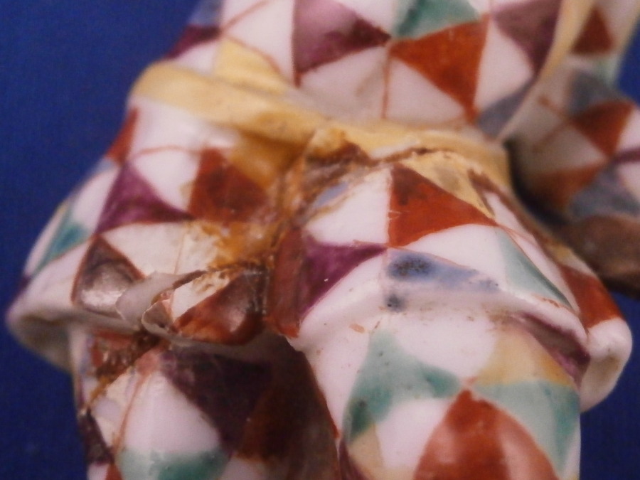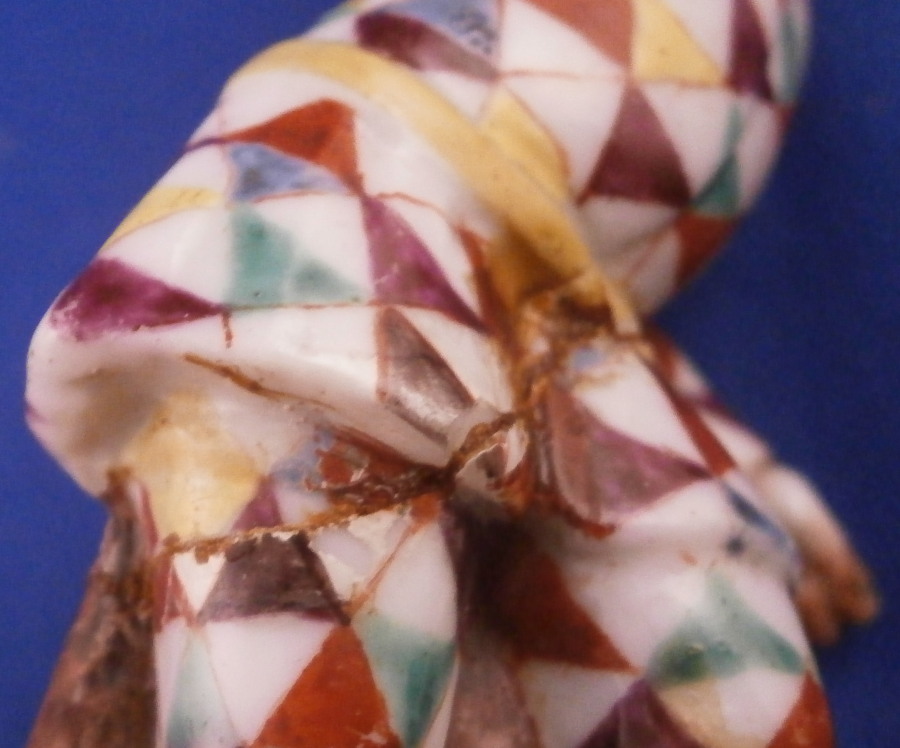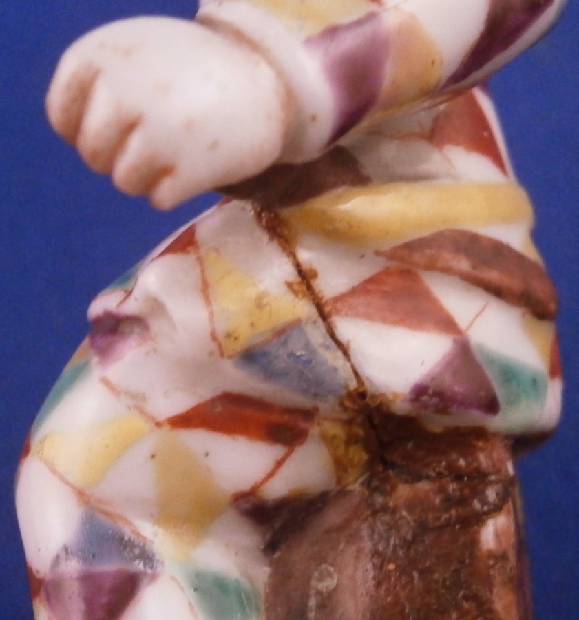 This is an amazing and very rare figurine made by Doccia in about 1755. It is one of the figures from probably the most famous group of figurines int he world of porcelain - the commedia dell'arte or Italian comedy which is definitely a favorite of mine. The figure here is of Harlequin ( Arlecchino ) who is the best-known of the zanni or comic servant characters from the Italian commedia dell arte. The Harlequin is characterized by his chequered costume and his role is that of a light-hearted, nimble, and astute servant, often acting to thwart the plans of his master, and pursuing his own love interest, Columbina, with wit and resourcefulness, often competing with the sterner and melancholic Pierrot. The figure is superbly modeled with the typical colorful shirt and pants and the club in his hand while standing on a typical very early doccia base with colorful scrolls. As early as they come and as rare and fun as they get! He displays nicely but as one would expect there is damage. He was broken in half through part of the waist and then across the other top leg. The tip of his club is missing and there is damage to the side of the base and a line to the udnerside which crept up one side. Nothing too bad and would be a fairly easy job for a good restorer which I will probably have done since he is definitely worth the time and money involved in that! The figurine is unmarked which is not unusual except for the incised number 4 underneath as shown! The figure is 4 inches tall, 1.875 inches wide and 1.625 inches deep. Please email me for more information or other pictures.
