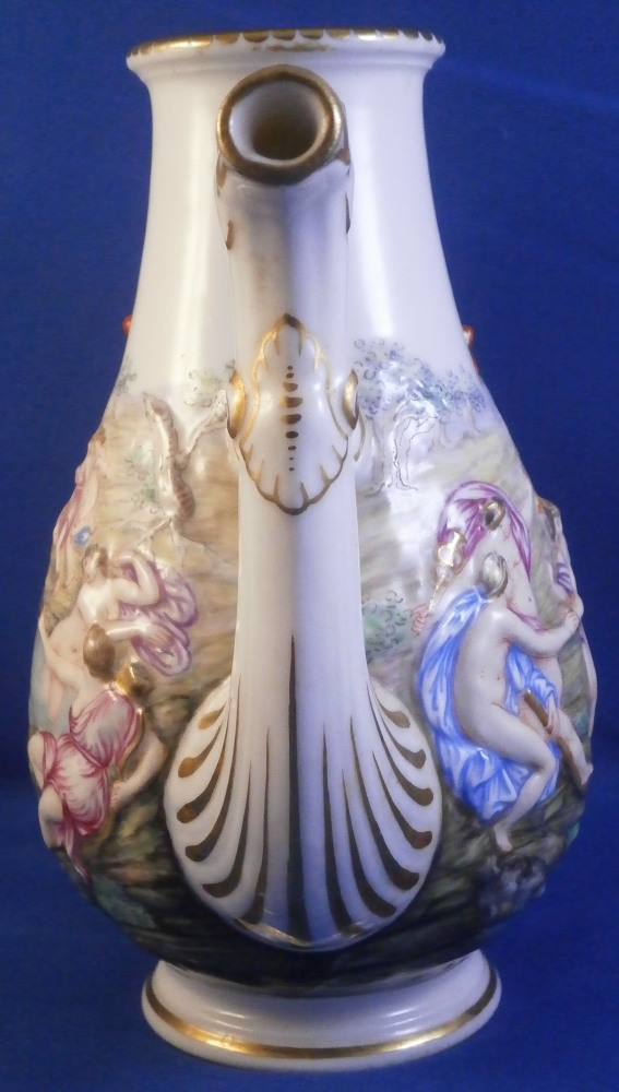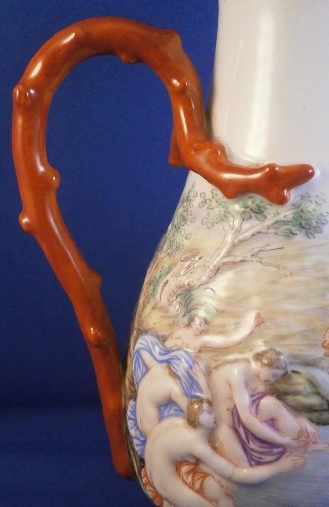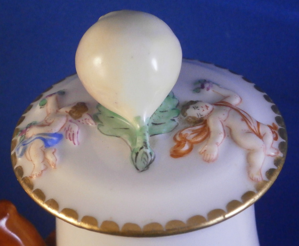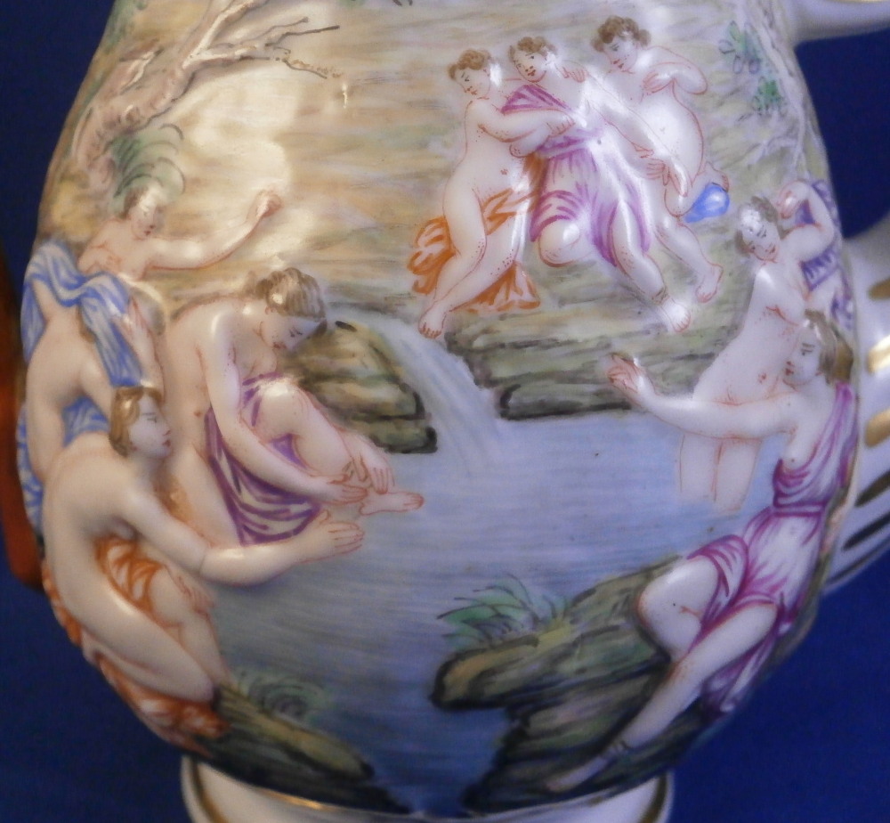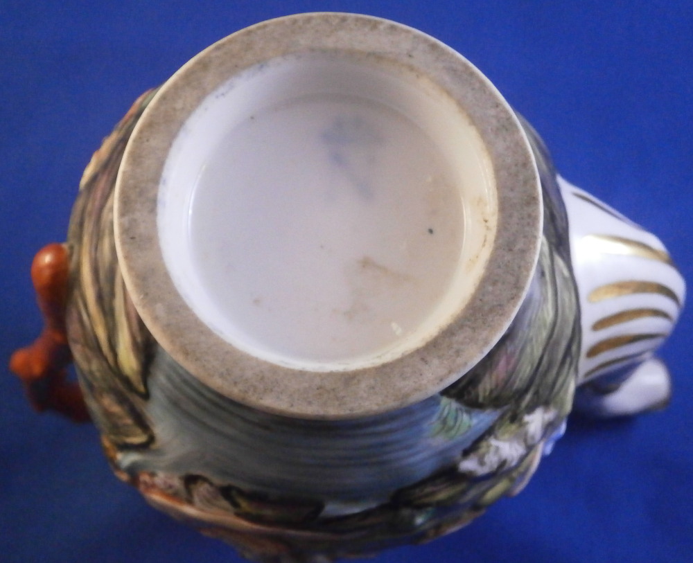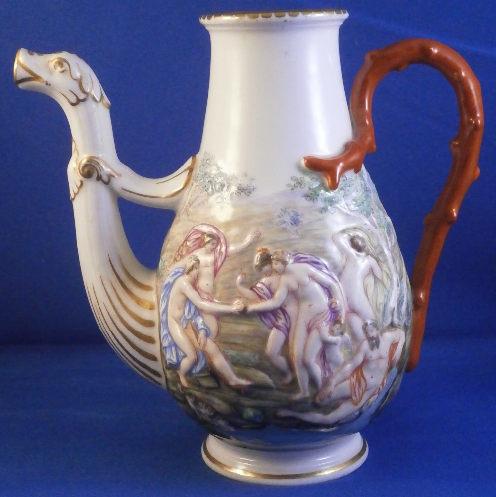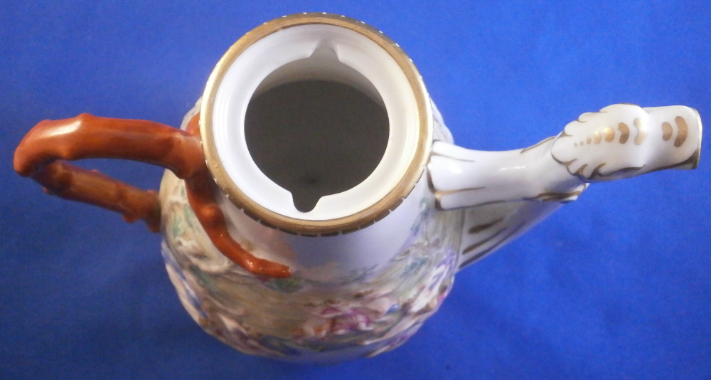 This is a superb small coffee pot with its lid made by Doccia in the mid 19th century. The piece is superbly modeled with an animal spout and a red coral handle and decorated with my favorite design by them - relief scenes that are hand painted with lots of nice detail. Nice gold trim to the spout, top and bottom rim and the lid edge. The lid has a nice fruit finial on it. The piece is in superb condition with one of the pins holding the lid in place missing as shown. does not show when on display and it looks perfect! As good as it gets! The pot is marked underneath with the crown over N mark in underglaze blue as shown. It is 6.75 inches tall, 6.5 inches wide and 5.75 inches from spout to handle and 3.5 inches in diameter. Please email me for more information or other pictures.