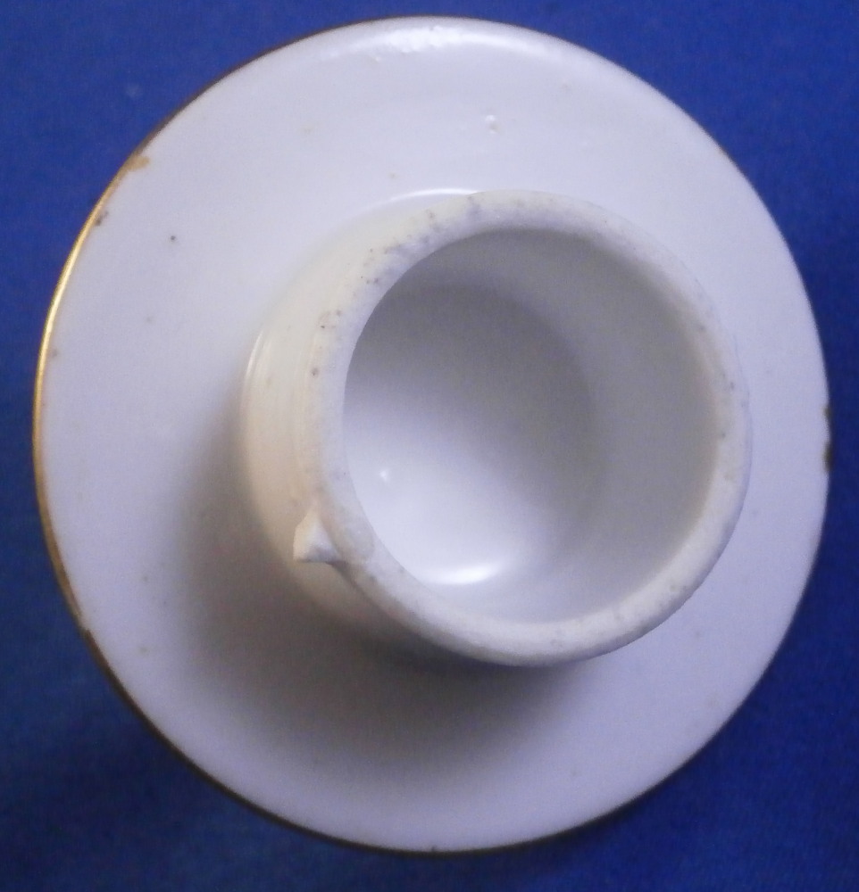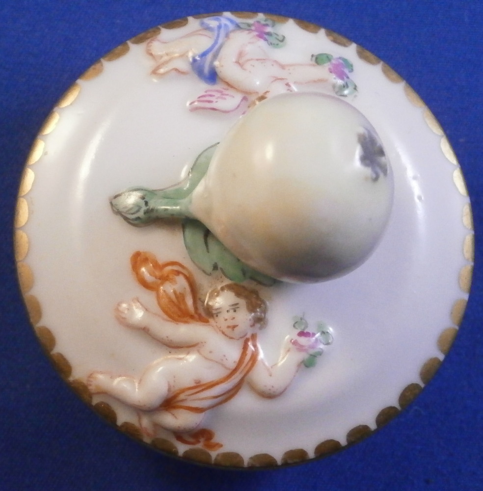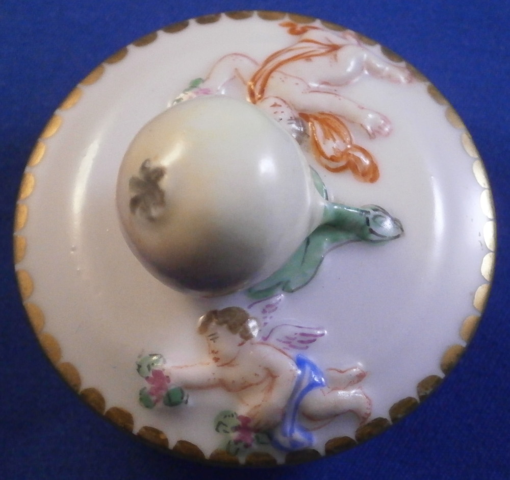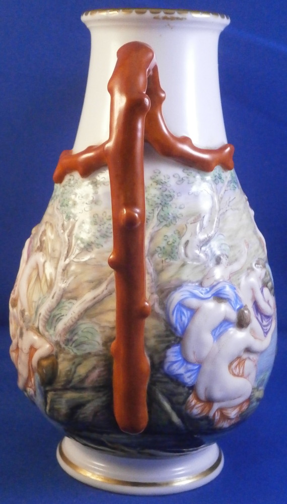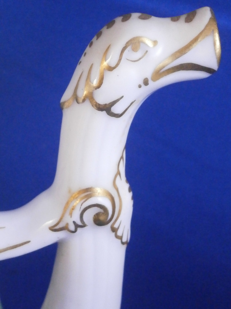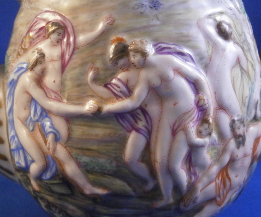 This is a superb small coffee pot with its lid made by Doccia in the mid 19th century. The piece is superbly modeled with an animal spout and a red coral handle and decorated with my favorite design by them - relief scenes that are hand painted with lots of nice detail. Nice gold trim to the spout, top and bottom rim and the lid edge. The lid has a nice fruit finial on it. The piece is in superb condition with one of the pins holding the lid in place missing as shown. does not show when on display and it looks perfect! As good as it gets! The pot is marked underneath with the crown over N mark in underglaze blue as shown. It is 6.75 inches tall, 6.5 inches wide and 5.75 inches from spout to handle and 3.5 inches in diameter. Please email me for more information or other pictures.