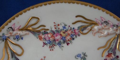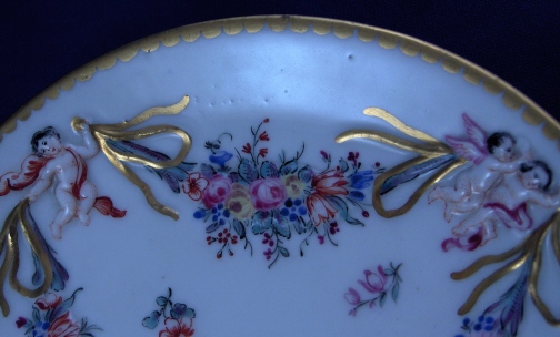This is a superb saucer made by Doccia / Ginori in the late 18th century. It is decorated with a design of floral garlands held by angels in relief that is handpainted very nicely. Four scattered small flowers in the center and a nice gold trim to the rim. The saucer is in perfect condition. It is marked with the rare impressed star mark underneath. This is the original maker of this style that was so often copied later in Dresden, etc. The piece is 0.875 inches tall and 5.375 inches in diameter. Please email me for more information or other pictures.