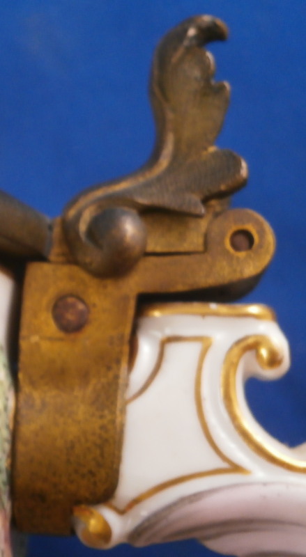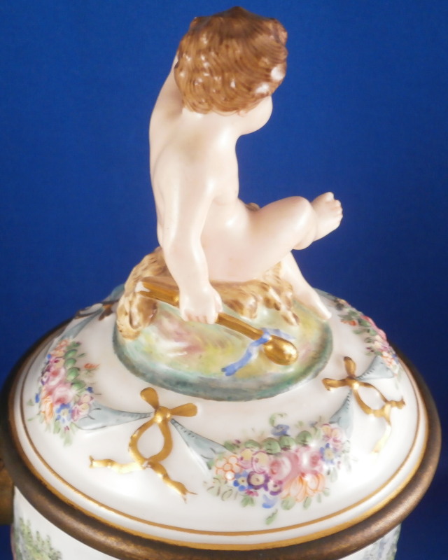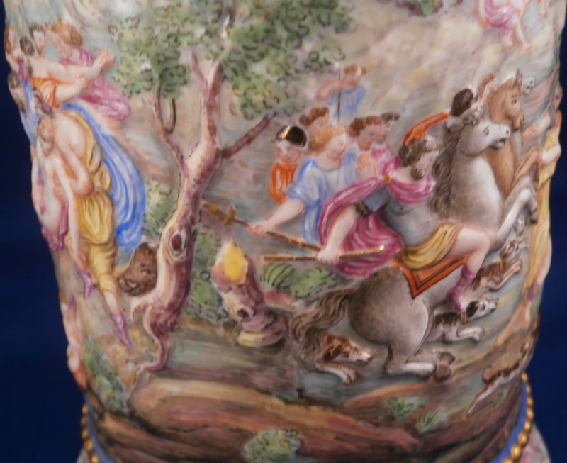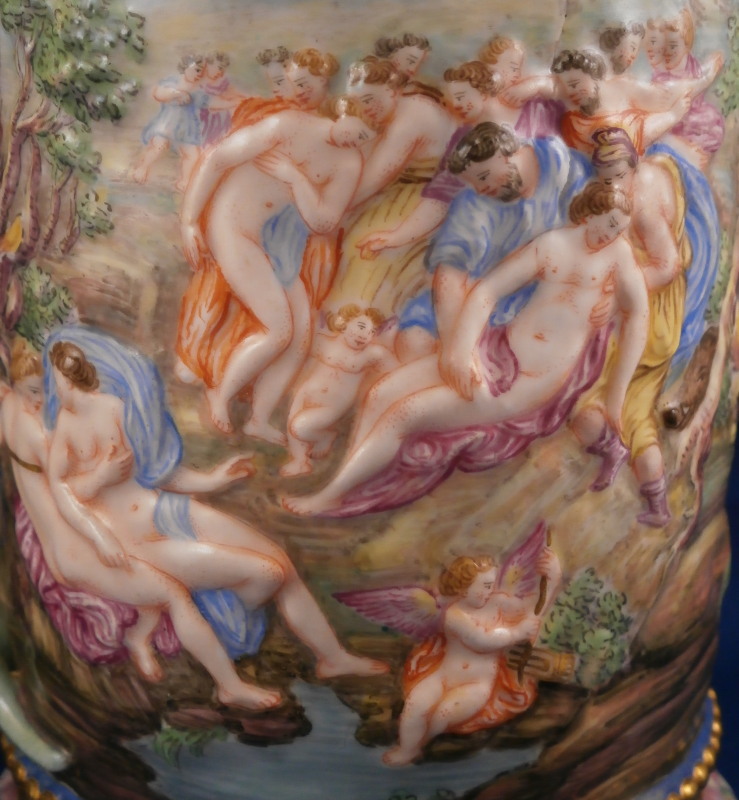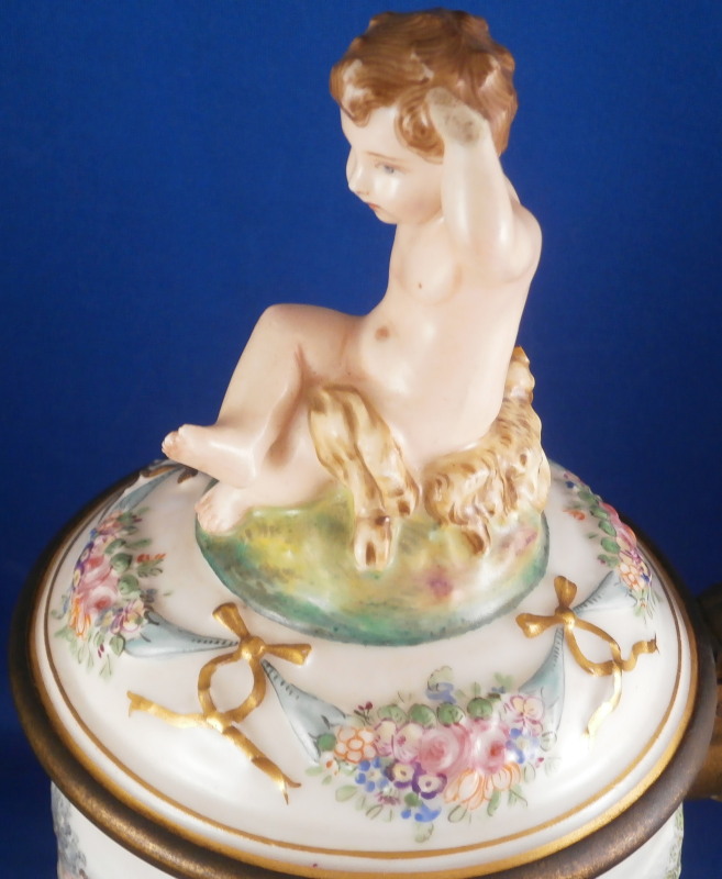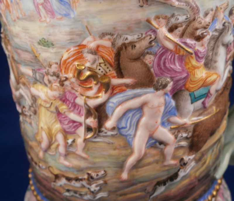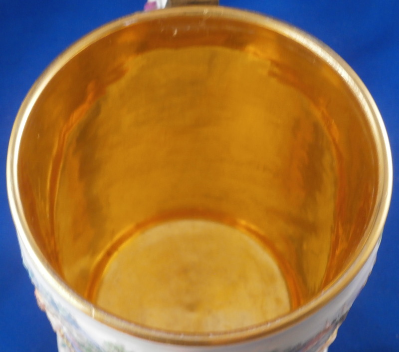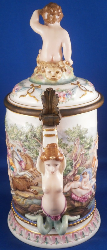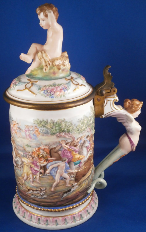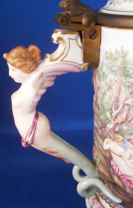 This is a superb scenic lidded stein / tankard made by Doccia / Richard Ginori in the mid to late 19th century. An amazing piece that has their signature relief scenes all around the central part of the body all hand painted to perfection and very detailed with a colorful trim to the bottom including a gold "pearl" trim. Top edge has a gold line to it coming out of the entirely gilded interior. The lid has their typical floral garland and bows design to the rim with a large naked putto shepherd finial. The handle is amazing - a nude lady's body with the legs morphing into snakes and wings to the top. Better fitting a figurehead of a ship's bow :) The metal fitting are bronze or brass. Precision work on the mounts since when the lid is open the thumb rest sits right between her head and the hair bun on the back of her head. A proper container for your evening beer! The piece is marked with the under glaze blue letter N under a crown mark as shown.The entire piece is about 9.5 and it has a bottom diameter of 4.25 inches. The tankard is in great condition with the shepherd's staff missing its end and the finial putto issing most of his upper hand as shown. Displays nicely and is very ahrd to find. Please email me for more information or photos.