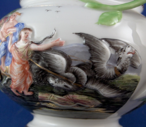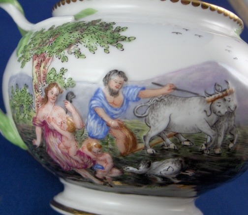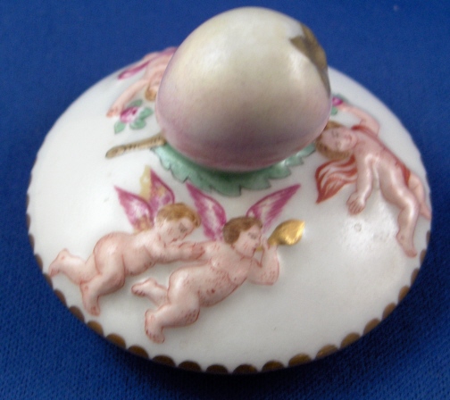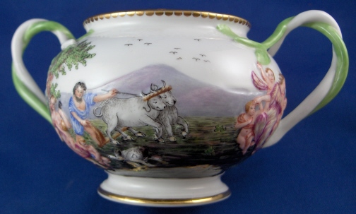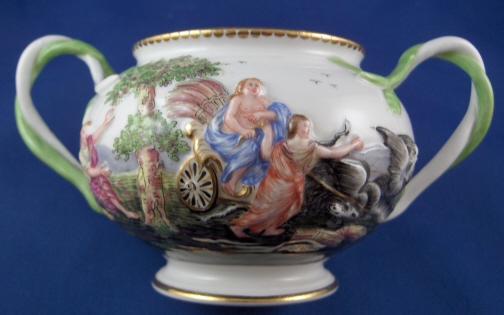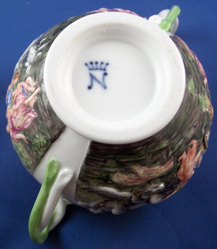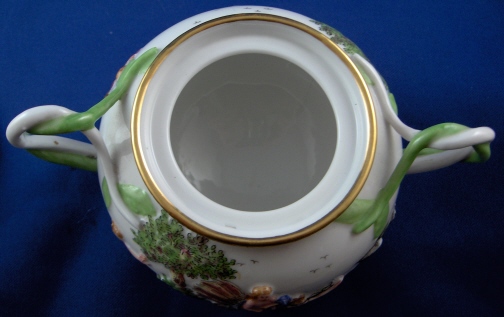 This is a superb small lidded sugar pot made by Ginori in the 19th century. The pot is superbly modeled with a relief decoration all around that is handpainted with lots of nice detail. The handles are in the form of small branches and the finial is a pear. Nice gold trim to the edges. The pot is in perfect condition. The piece is marked underneath with the crown over N mark in underglaze blue. The pot and lid are about 4 inches tall, 6 inches wide and 4 inches deep. Please email me for more information or other pictures.