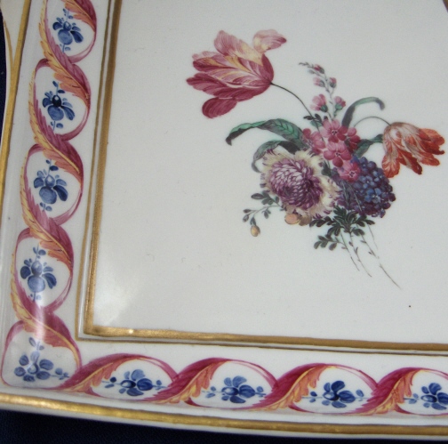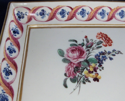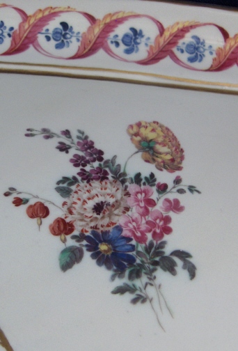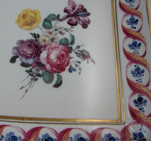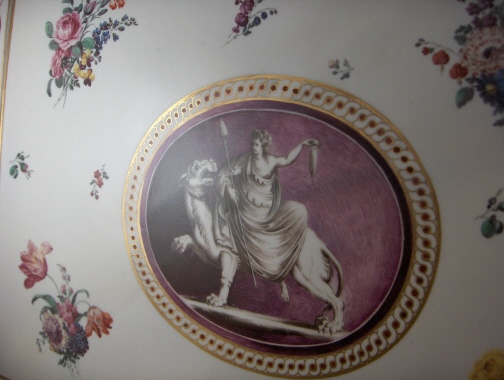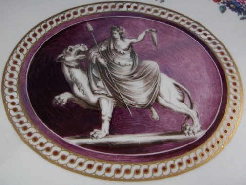 This is probably my favorite Doccia piece I have ever seen. It is a rare scenic tray made by Ginori in about 1760. It is handpainted in the center with a superb scene in a typical style for this maker with a purple background and a grisaille lady rising a beast (lion type animal). She is holding a spear like contraption in her right hand and is pouring out a cup that is in her left hand. The scene is surrounded with a red and gold trim, then there are four of the best quality flower arrangements I have seen by them in the four corners with smaller flowers scattered throughout and the rim has a superb trim as well. A very fancy piece and definitely made for someone very important no question about it. The tray is in superb condition regarding usage - almost no wear but sadly it was broken at some point but was restored back to perfection! The piece is tin glazed and unmarked except for a later written addition from I think a museum. N.o 19 and Capo di Monte something something like 1860. One of my new favorites for sure! The tray is 0.875 inches tall, 10.5 inches deep and 15 inches wide. Please email me for more information or other pictures.