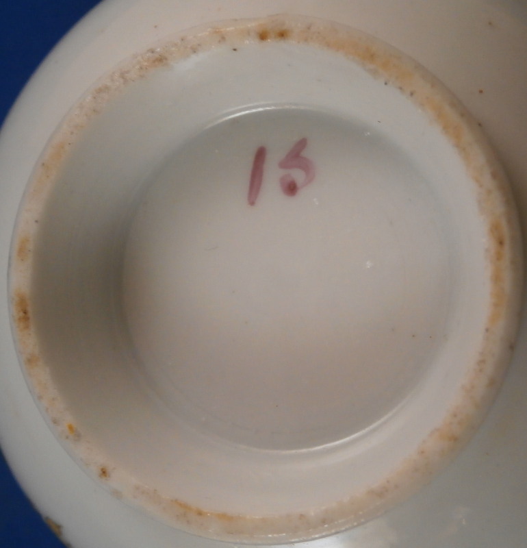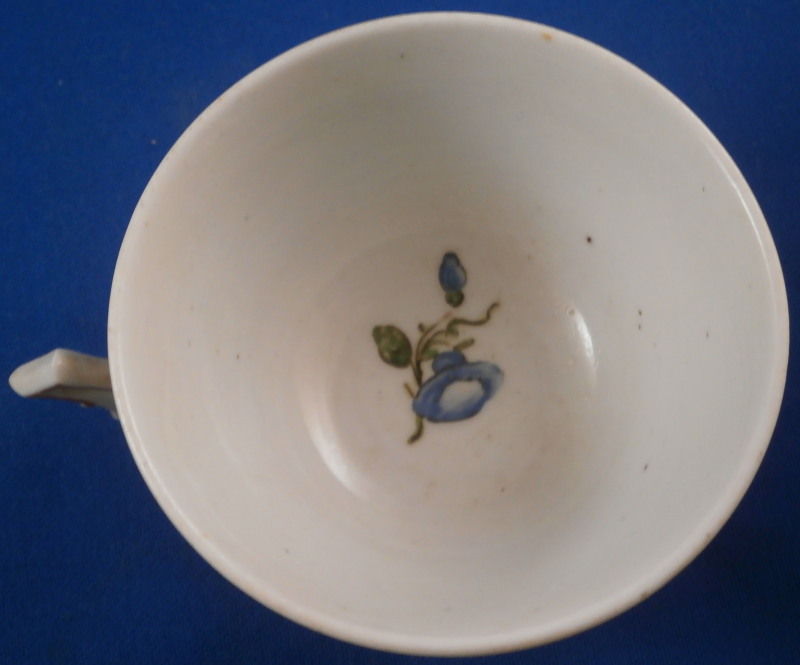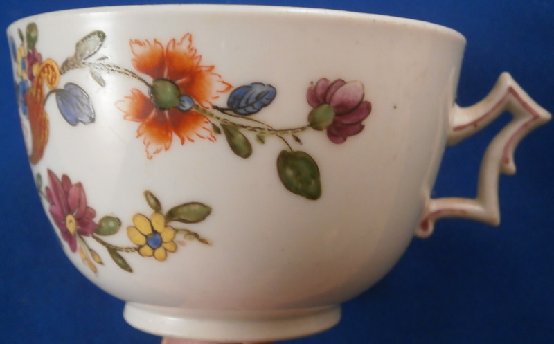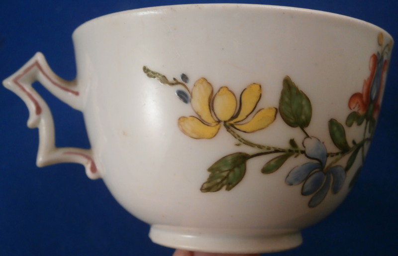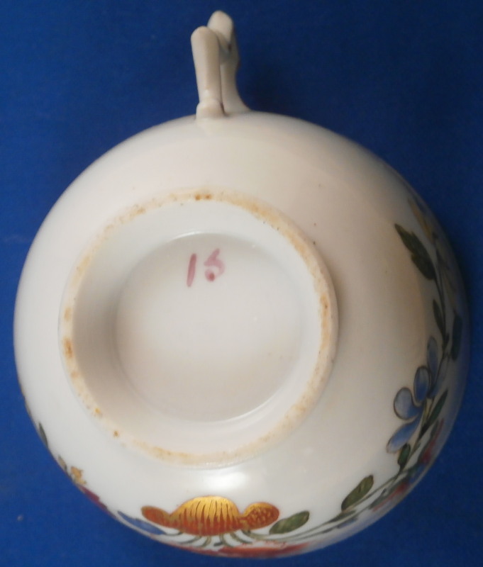 This is a cup made by Doccia in the 18th century. It is hand painted with a really nice floral design I have seen being called Ischia and Tulipano but the second one makes more sense. A very typical design for Doccia and one of the ones I like the most :) The cup handle has a nice shape to it with some puce trim on it. The piece is in good condition with a tight crack across the bottom terminal of the handle as shown. Doesn't take away from the piece! The cup is marked with a puce 15 again quite typical for Doccia pieces of this period. The cup is just under 2 inches tall and 3 inches in diameter. Please email me for more information or other pictures.