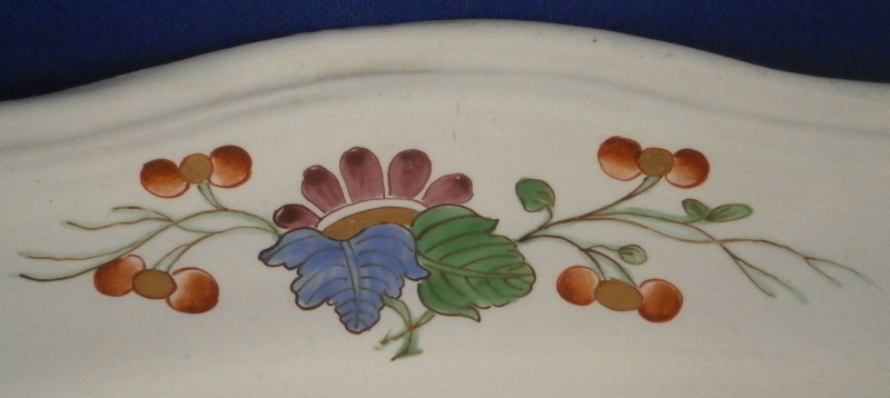 This is a serving platter made by Doccia / Ginori in about 1770. It is hand painted with a superb fancy tulip floral design called the tulipano pattern though I have also seen it being called the Ischia pattern in the center and four smaller designs on the rim. Nice rim design to the paste as well. The plate is very typical for Doccia around this time period and the design is quite famous. It is covered with their tin glaze which they used around this period to hide the fact that their porcelain wasn't as white as they wanted it to be. The plate is in superb condition with a little bit of wear but it displays beautifully. Some chips to the foot ring but they are glazed over and from when the piece was made. It is not marked underneath but that is normal. The platter is 1.5 inch tall, 12.75 inches wide and 9.875 inches deep. Please email me for more information or other pictures.