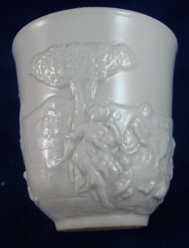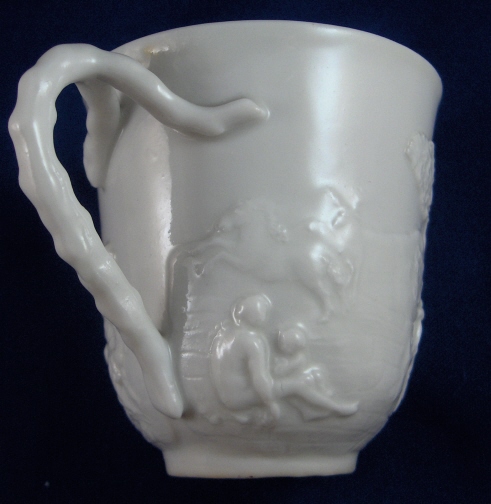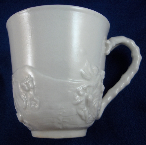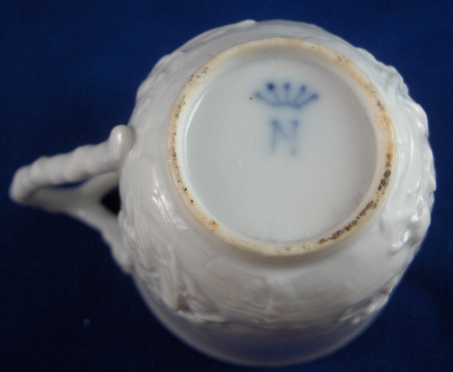 This is a cup and saucer made by Doccia in the late 18th to early 19th century. This is what most people refer to as Capodimonte with the mythological figures in relief. The saucer is decorated with scroll work and garlands. All this is done in relief and is very detailed. It is in great condition with some manufacturing flaws like firing cracks, black spots, inclusions and a glazed over small rim chip. The handle is supposed to simulate coral and was used during the same time the thin branch handle was used. The cup is marked with the crown over N mark but the saucer is unmarked. It is fairly rare for these pieces to ever be marked. The cup stands 2.875 inches tall and 2.75 inches in diameter. The saucer is 0.75 inches tall and 5.625 inches in diameter. Please email me for more information or other pictures.