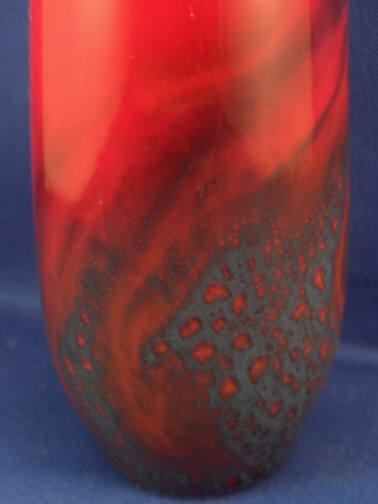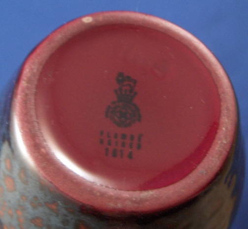This is a nice vase made by Royal Doulton in the early 20th century (I belive but am not totally sure). It is handpainted with the famous Song Glaze. The colors are mainly a blueish gray and a nice red. The pattern is a random one and different on every piece so each piece is a one of a kind. The vase is in great condition with just one small white spot where the glaze got dinged - it is about 1mm by 2mm. The vase is marked underneath with the Lion of the the crown mark with Royal Doulton in a circular pattern underneath. Also Flambe Veined (?) 1614 underneath that in black. It is 5.75 inches tall and has a diameter of 2.25 inches. Please email me for more information or other pictures.