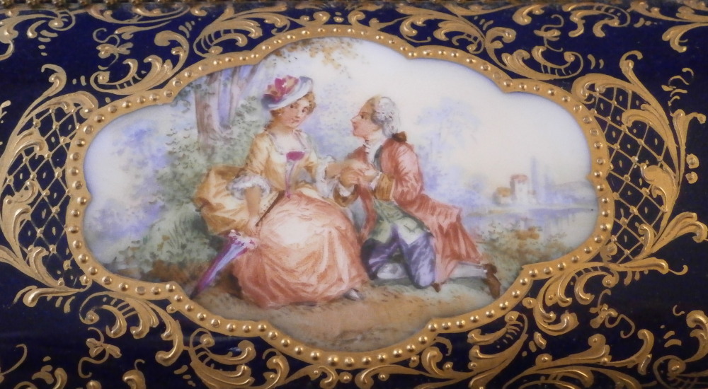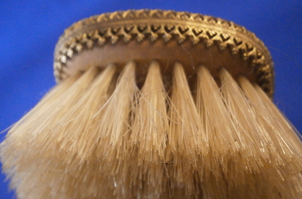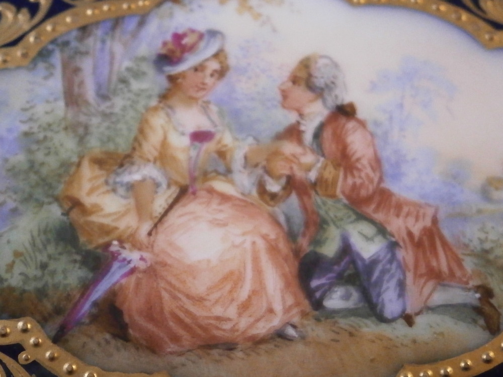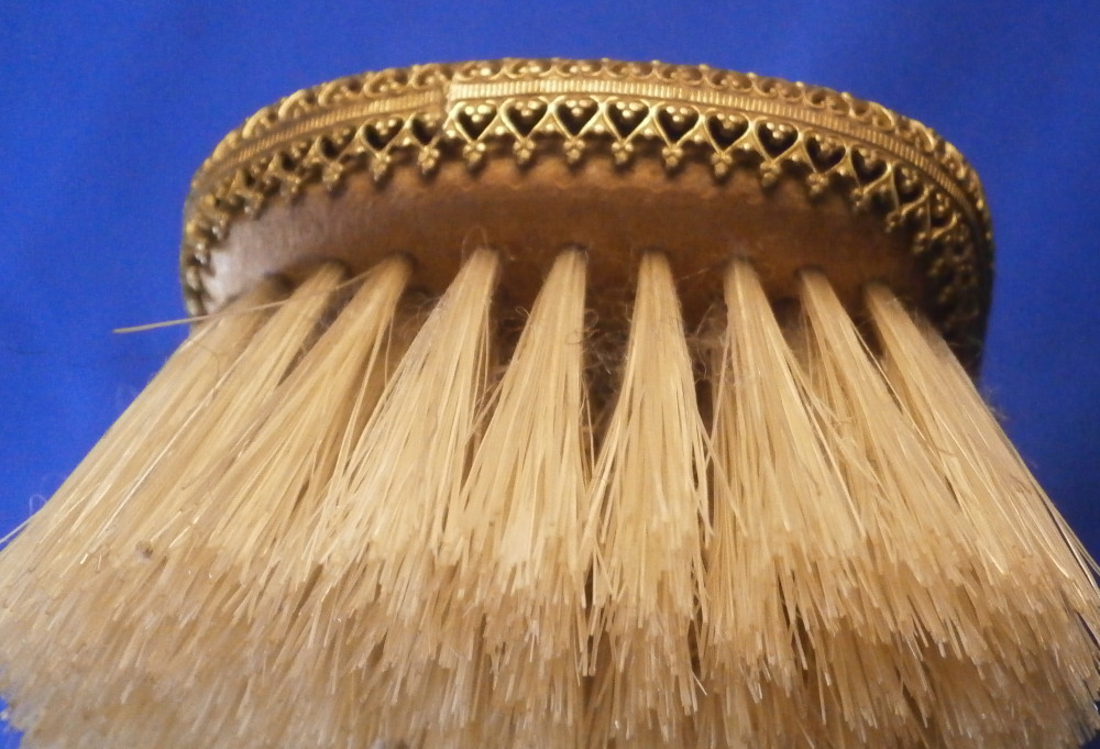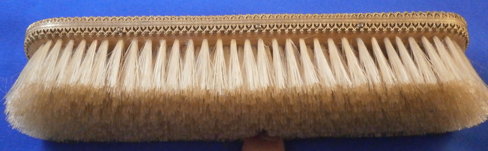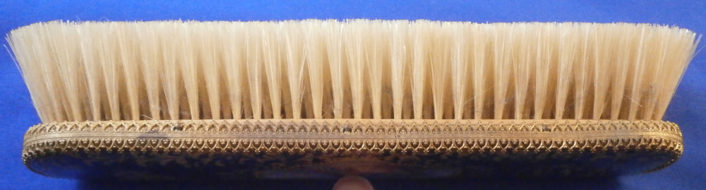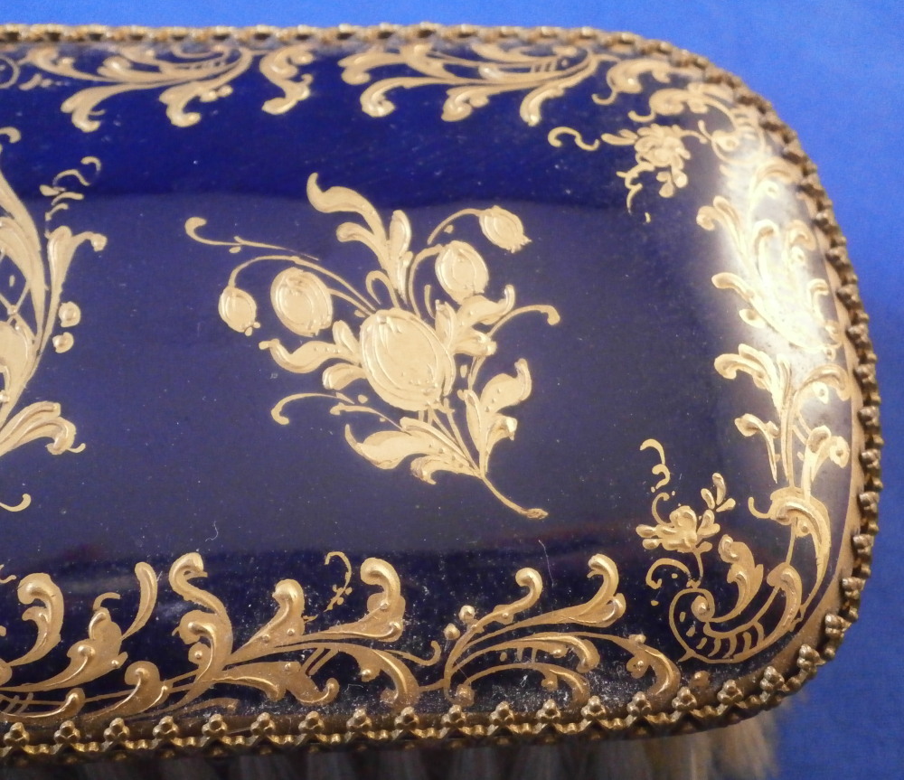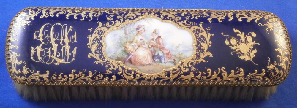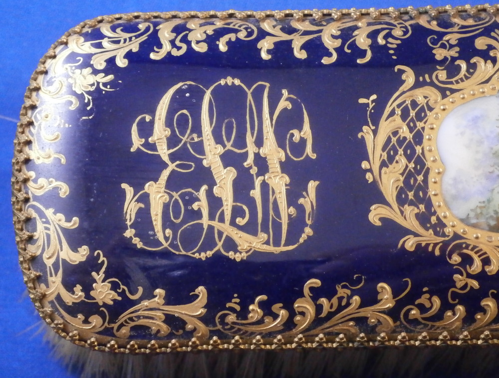 This is a really superb clothes brush with the main body made of porcelain hand painted most likely in the Dresden area of Germany and from around the late 19th century. Lamm or Wehsney come to mind but it could be another one of the makers from this region. Part of a vanity set I assume. This is a long, narrow brush that was once used to brush dirt and lint off of clothing after a day out on the town. The porcelain is hand painted with a superb cobalt blue ground with lots of gilding to it with raised highlights but the best part is the Watteau style scene of a couple in a landscape surrounding. Hand painted very nicely. The cobalt blue and gold combo does not get any better in the world of porcelain and the detail here is top notch! Never seen a better one. The porcelain part is attached to a wooden part with the seam hidden by a nice brass (I think) decorative trim attached with tiny nails. The brushes are attached to the wooden part. The piece is in perfect condition with the brass seam being a bit loose due to just using tiny nails and no glue to attach it so it was amde that way and one spot of the seam is discolored but that could be polished if need be quite easily. It displays perfectly! No visible maker's mark. Monogramm in gold which I think is ELA on the top left. The brush is 7.625 inches long and 2.5 inches wide. A really nice piece and not something one sees often at all especially this nicely done. I also own the matching smaller one in this shape and a hair brush as well as a hand mirror which will also be listed. Please email me for more information or other pictures.